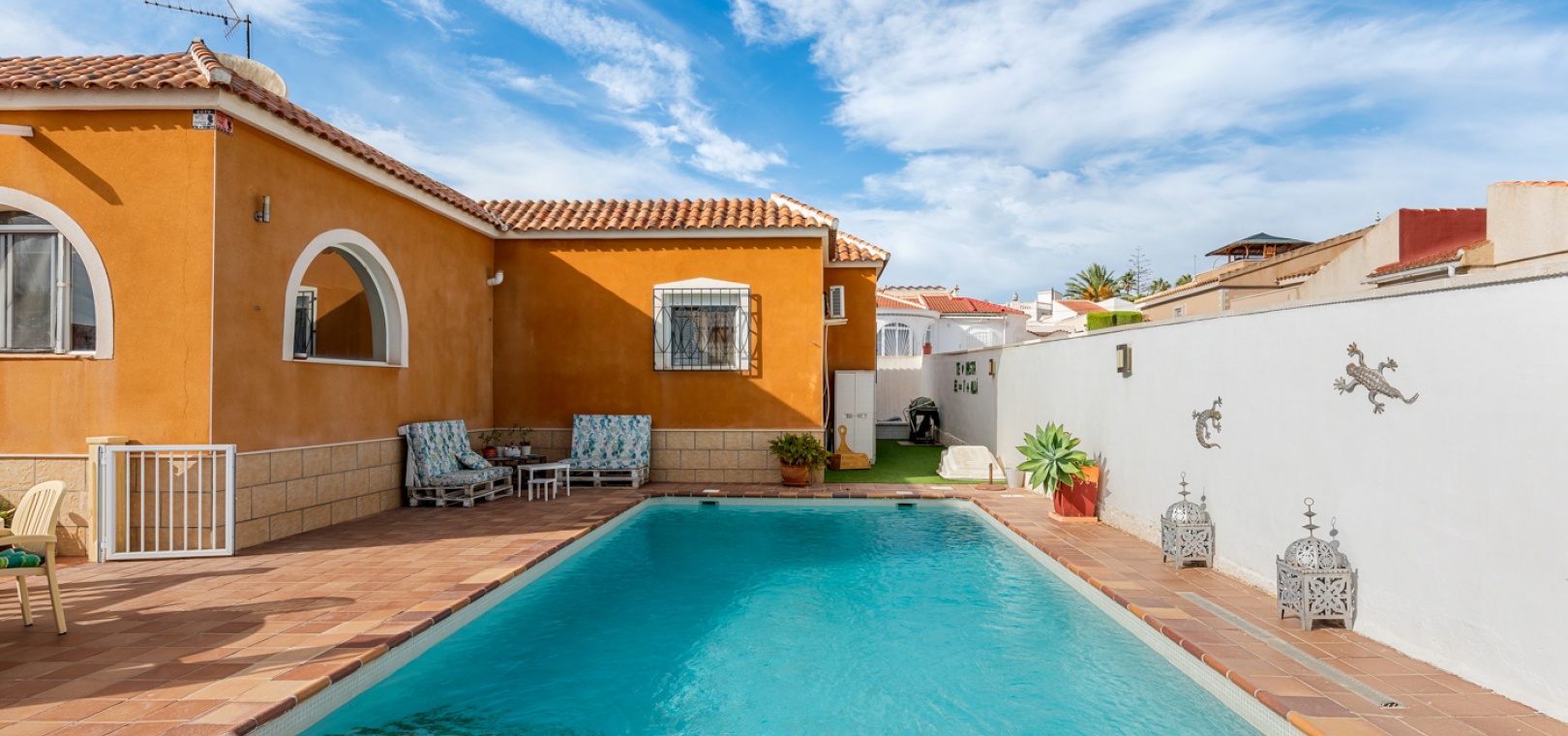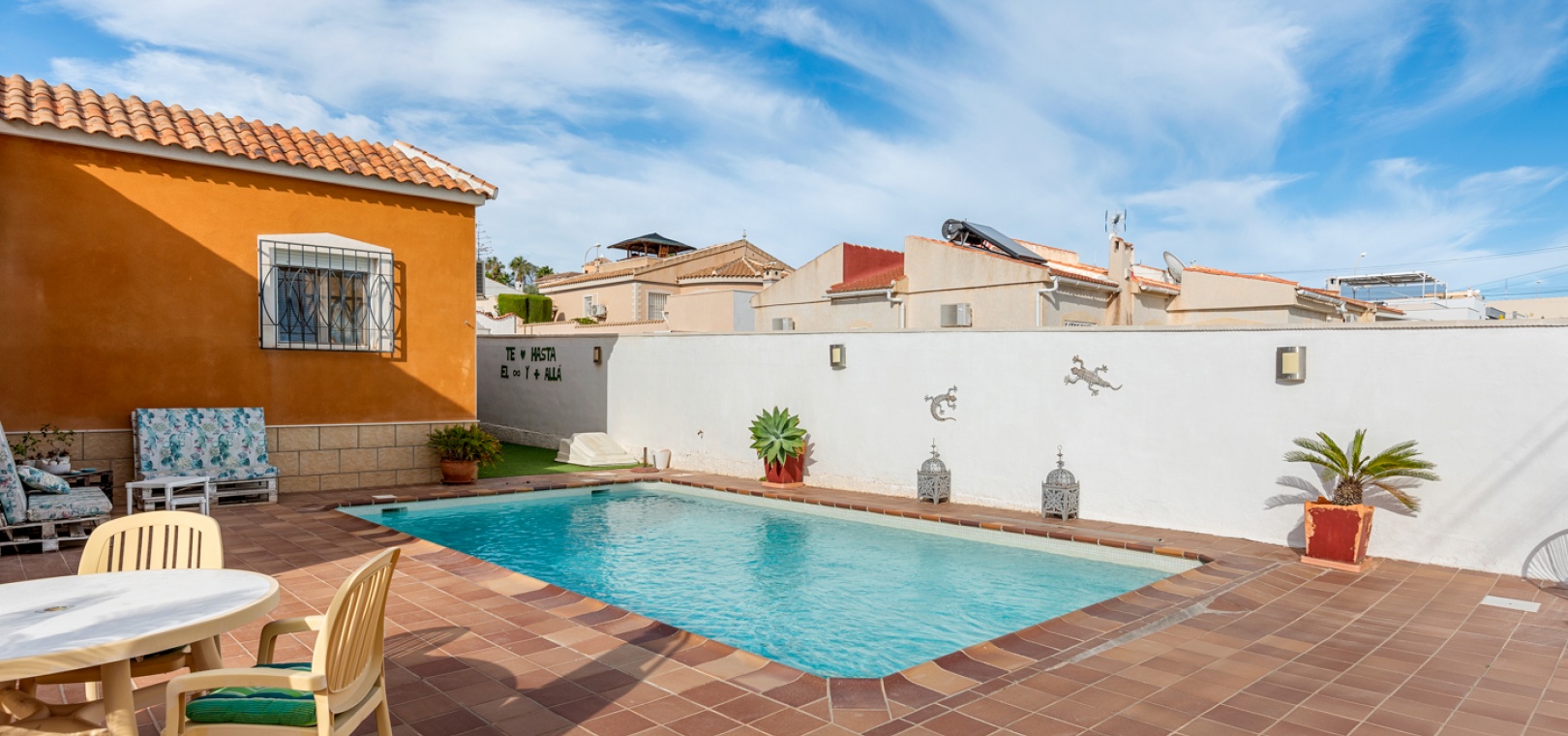 In the outdoor area you'll find a pool, a shed used for storage and enough space for parking on the plot.