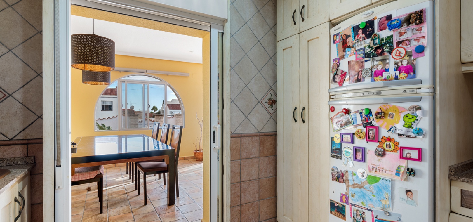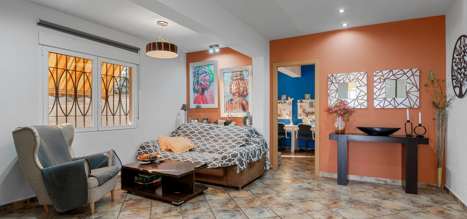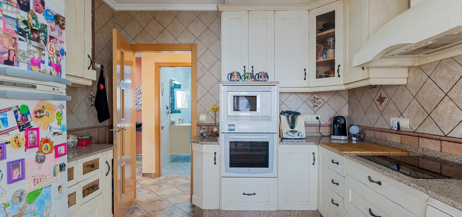 As you enter the home, you are greeted by a living area that leads to a glazed terrace with views of the surrounding green zones. The layout connects the living room to the fully furnished kitchen, providing a space for family gatherings.