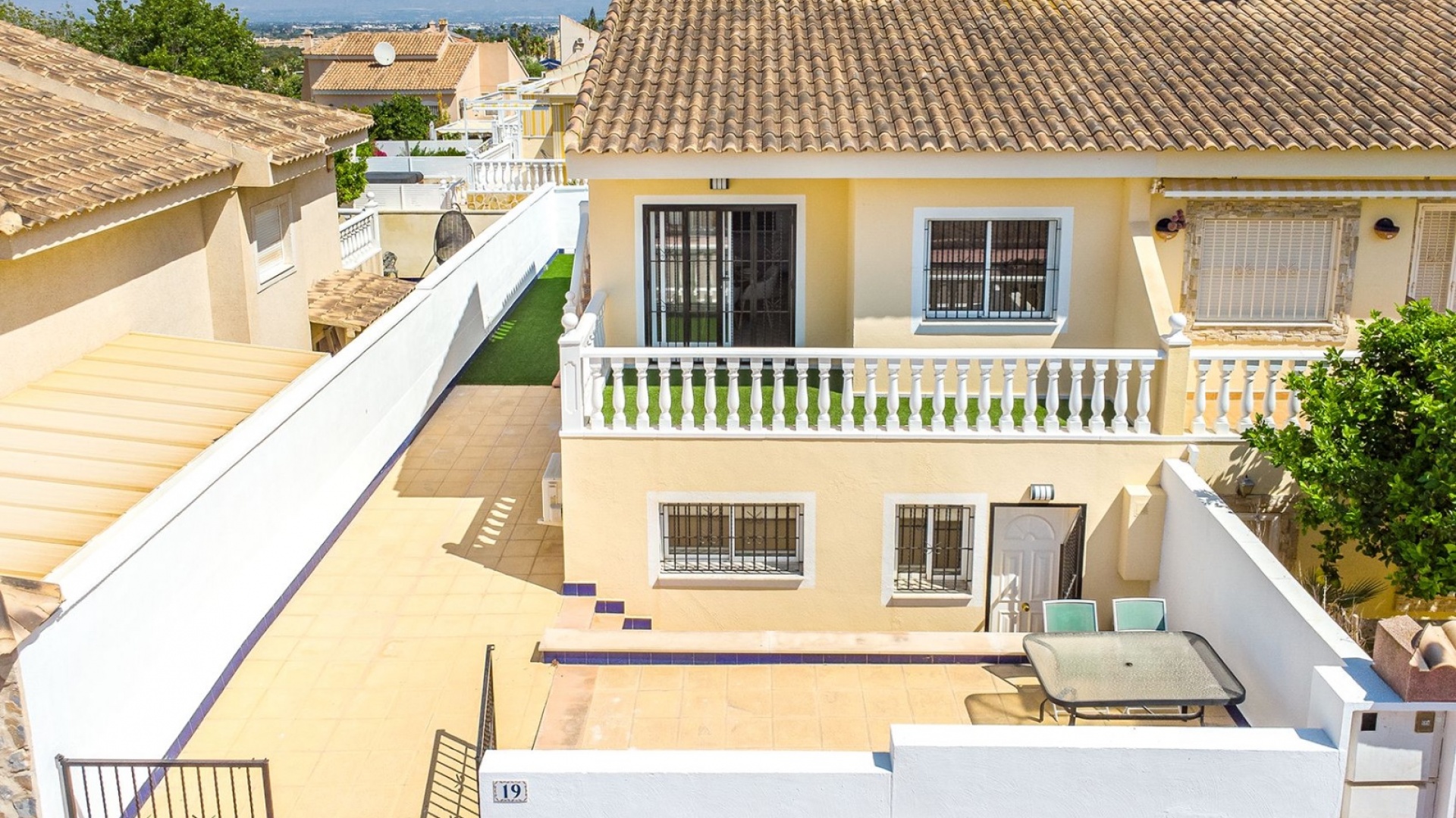 Outdoor spaces are a true highlight. A private rooftop solarium offers panoramic mountain views and the perfect spot for sunbathing or relaxing. The property also features a private garden, driveway, and access to a beautifully maintained communal pool shared by only seven homes.