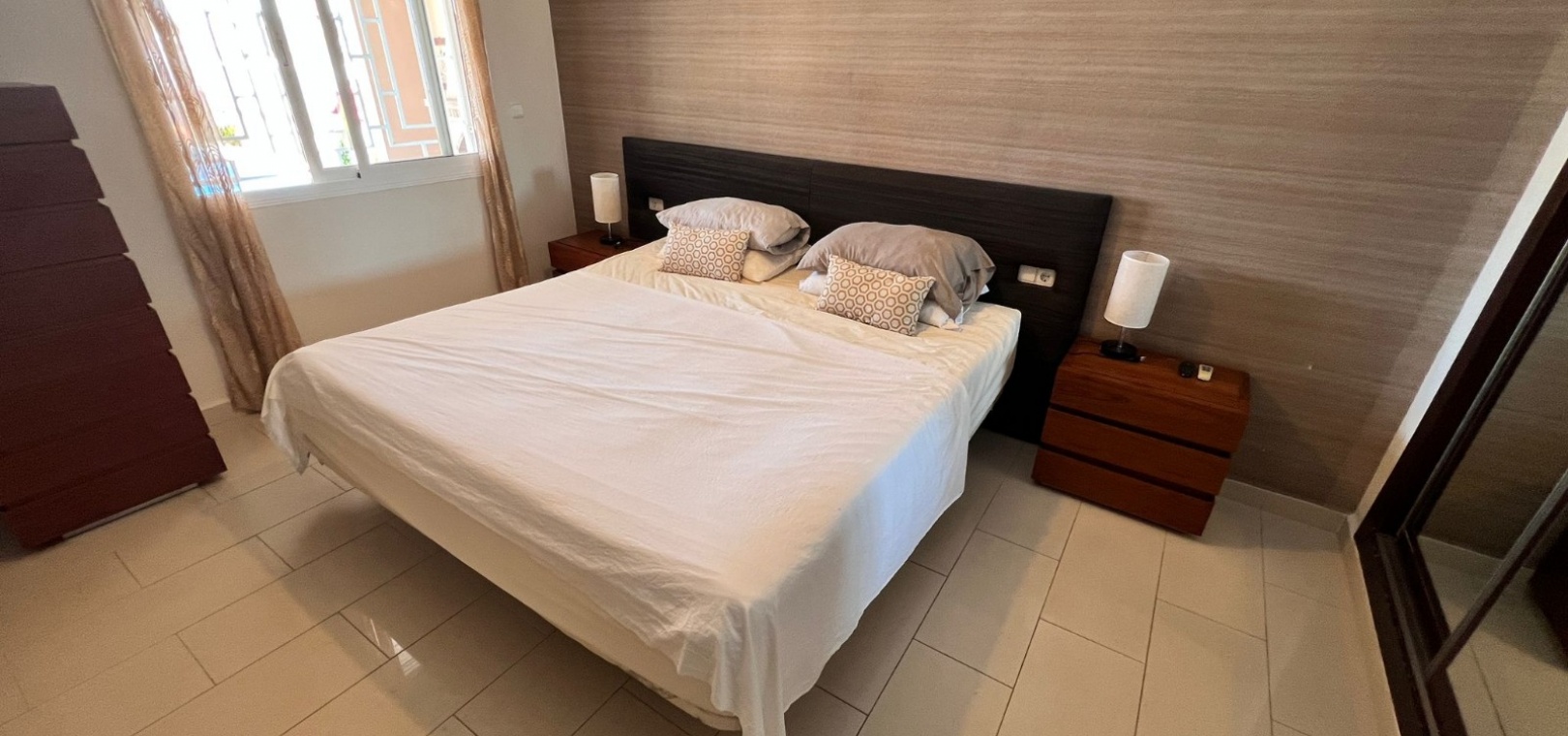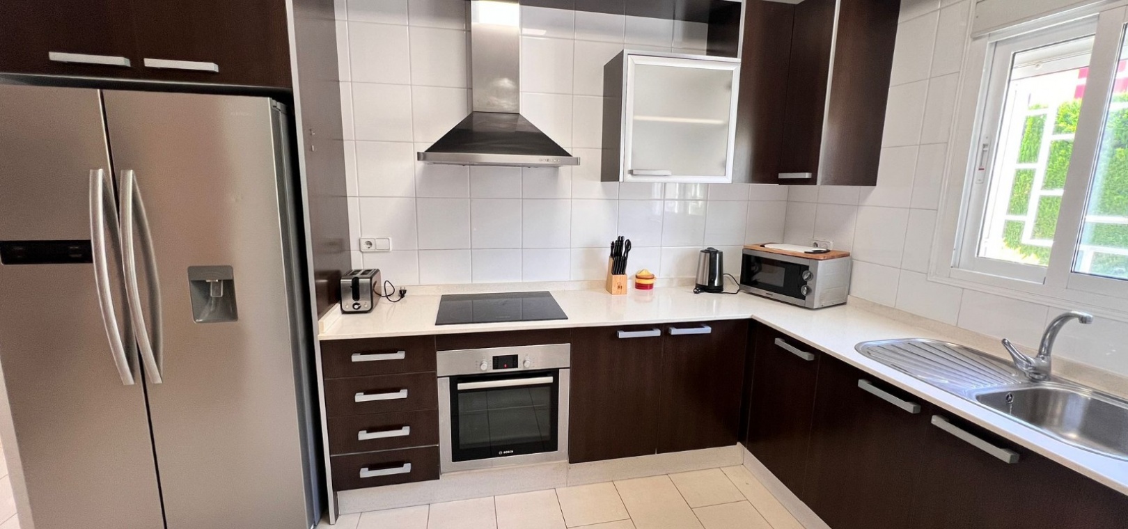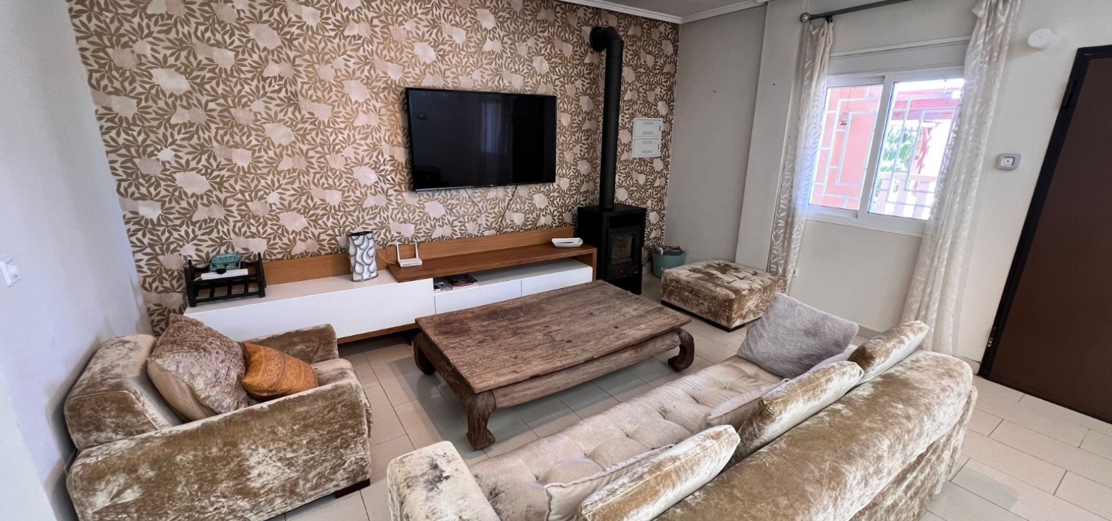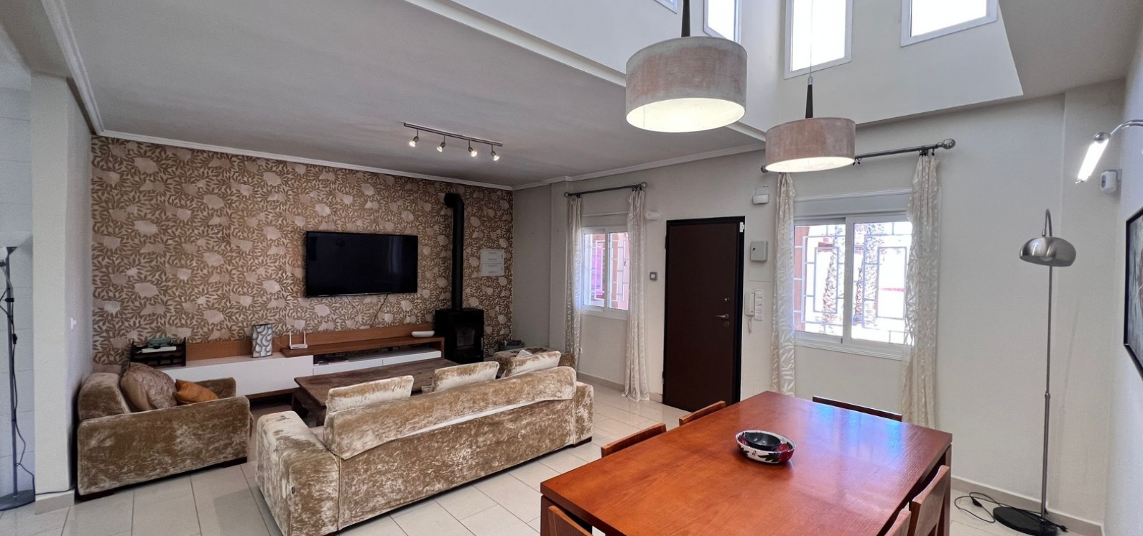 The property has 3 spacious bedrooms with fitted wardrobes, 2 complete bathrooms, a fully equipped open kitchen and a living room with a high vaulted ceiling and a wood burning stove, perfect to enjoy all year round. The property is sold furnished and ready to move into.
