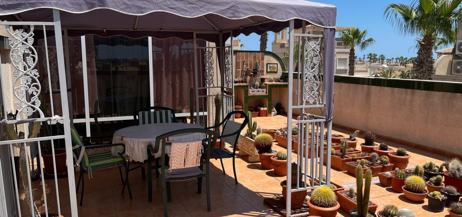 The property offers two spacious bedrooms and two bathrooms, and comes fully furnished for your convenience. The southwest-facing orientation fills the interior with warm natural light throughout the day, creating a bright and welcoming atmosphere. From the private solarium, enjoy partial sea views — an ideal spot for sunbathing, dining, or entertaining guests while watching stunning sunsets.