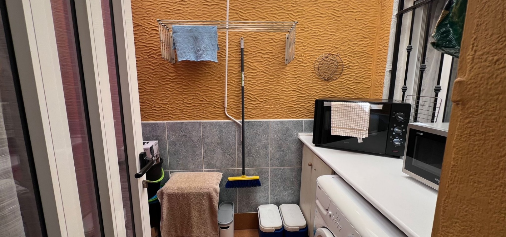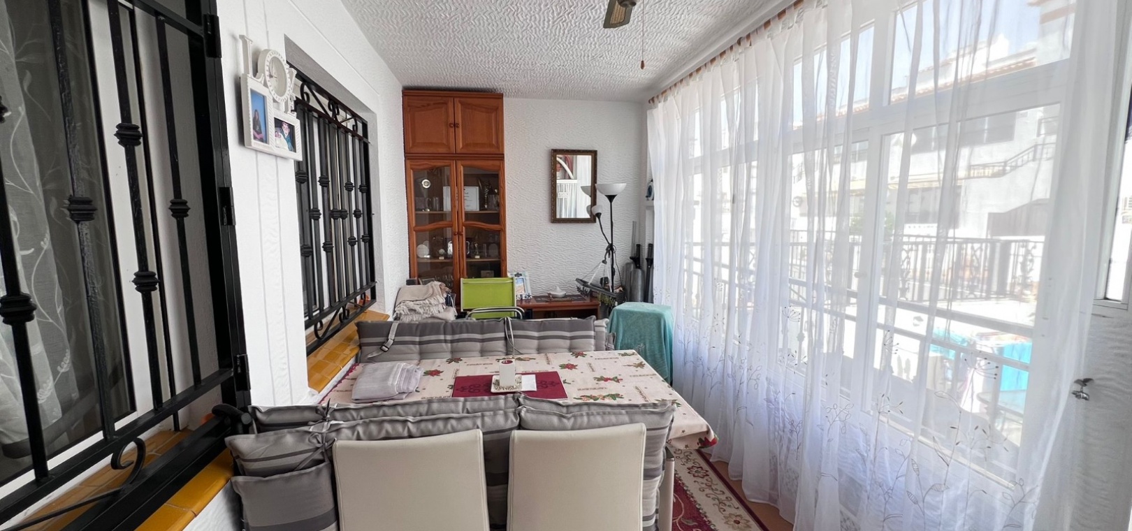 The apartment features a charming enclosed conservatory that serves as an ideal dining area or extended living space. Inside, you’ll find a comfortable lounge, a separate fully equipped kitchen, and a built-in rear patio with a washing area.