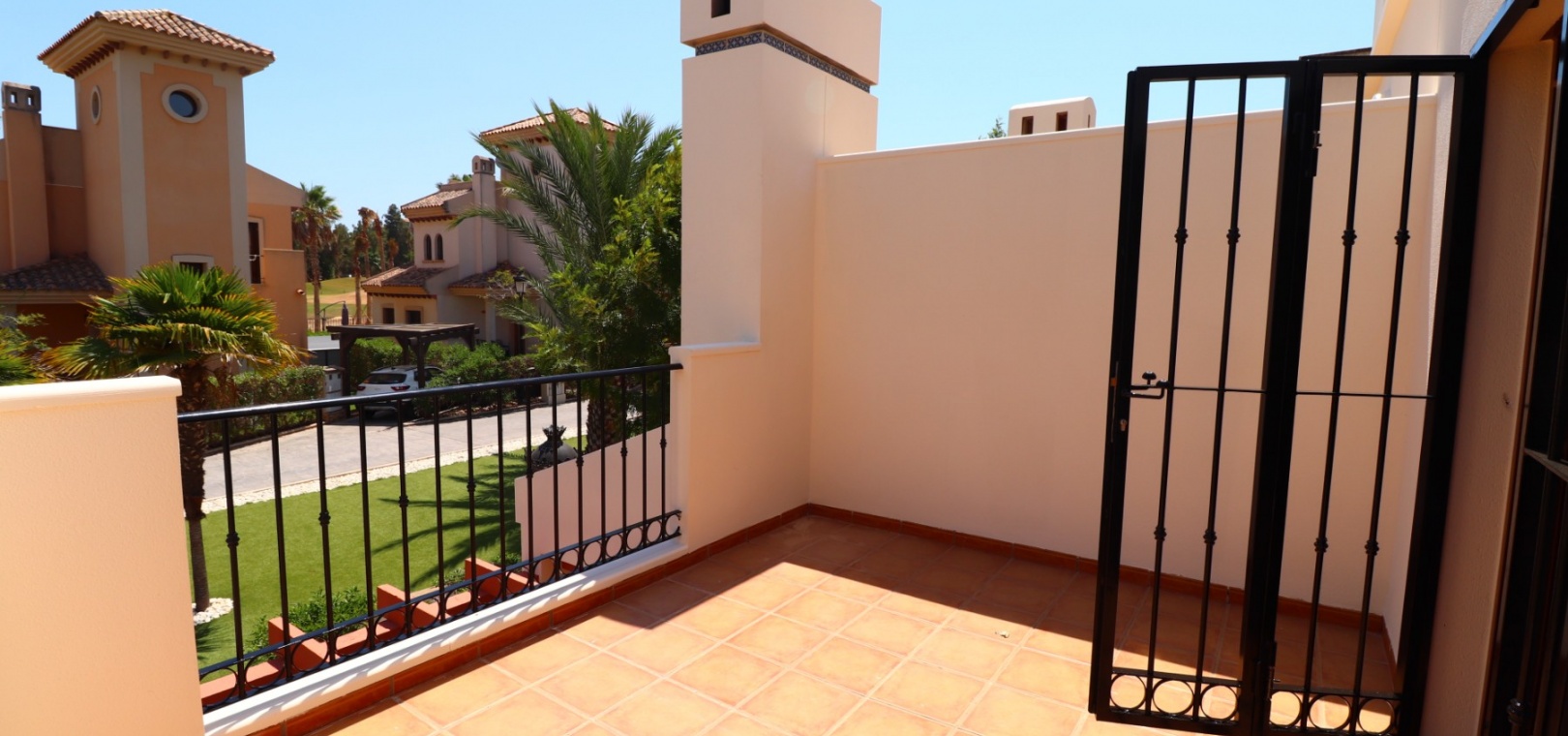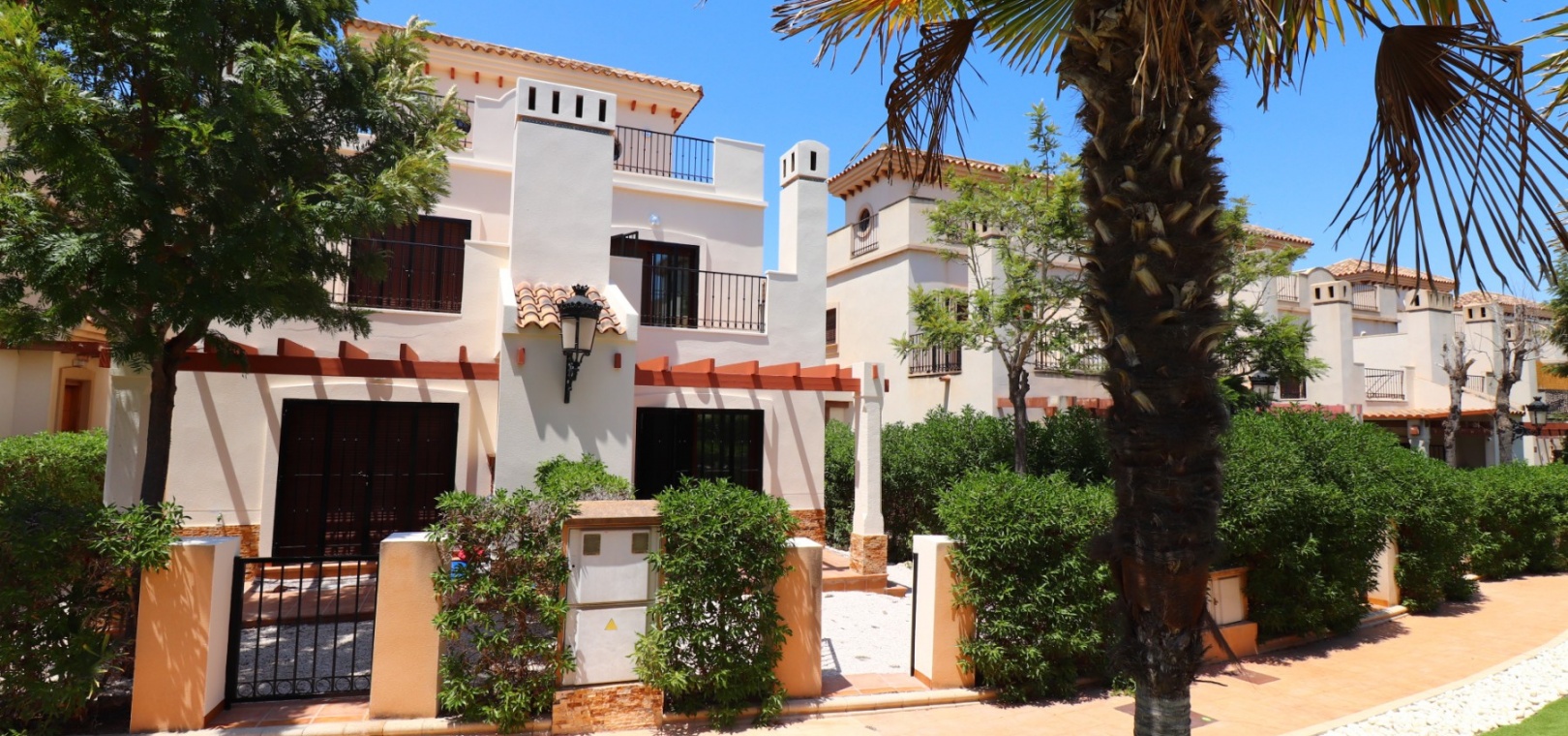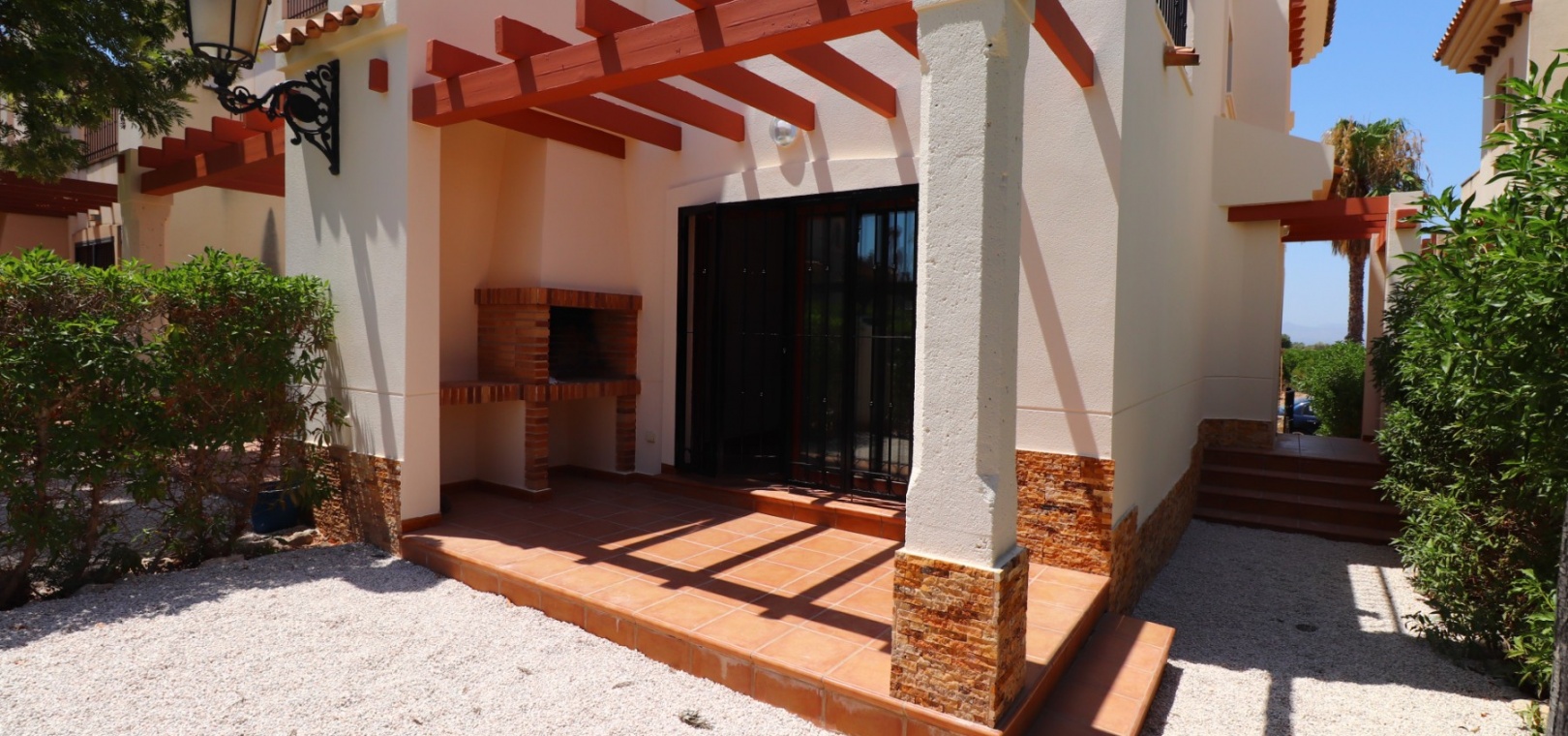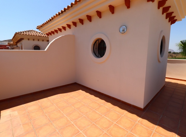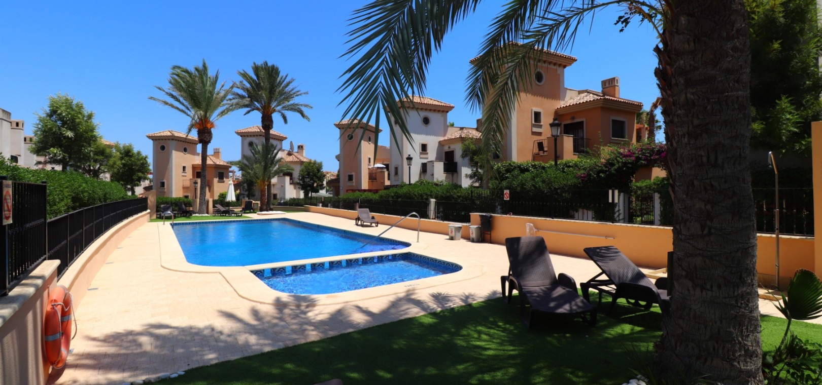 This South East Facing, Three Bedroom, Semi Detached Villa on La Finca Golf 5* Hotel Spa Resort is located just a few minutes’ drive from the charming village of Algorfa. The 5* hotel, spa, and golf course are within a 7-minute walk, while an array of eating places, café bars, and shops can be reached within a 3-minute drive. Quesada and Benijofar are just 10 minutes away by car, and the beautiful beaches of the Costa Blanca South are approximately a 20-minutes. This 100m² villa offers both front and rear access and boasts a desirable outlook with views through to the golf course and over the immense citrus groves to the mountains. The spacious living area features a characterful beamed ceiling, an open fireplace, and double sliding glazed doors leading out to the garden — creating a warm and inviting atmosphere. Stairs from the lounge lead up to the first floor. The separate fitted kitchen is functional and well-equipped, with an adjoining utility area. Also on the ground floor is a double bedroom and a modern shower room. Upstairs, you’ll find two further double bedrooms, both with access to terraces one benefitting from thos delightful views over the citrus groves and nearby mountains. A family bathroom serves this level, and all bedrooms benefit from built-in wardrobes, with ducted air conditioning installed throughout the property. Internal stairs provide access to the private solarium, ideal for relaxing or entertaining with panoramic views. The exterior of the villa includes both front and rear gardens, a BBQ area, off-road parking, and access to beautifully maintained communal gardens and a lovely communal pool area — all set within a well-kept and sought-after community. A fantastic opportunity for golf lovers and those seeking a peaceful yet well-connected lifestyle in one of the most popular areas of the Costa Blanca South.