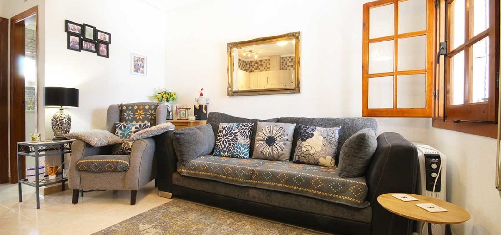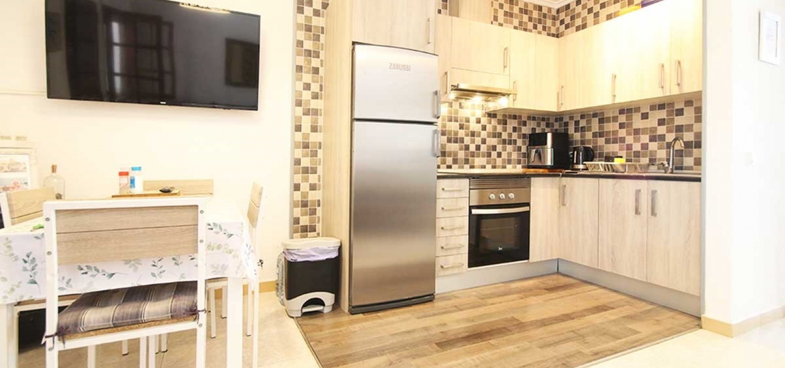 Open-Plan Living Area – Featuring a cozy lounge, defined dining space, and a refurbished kitchen with modern touches.