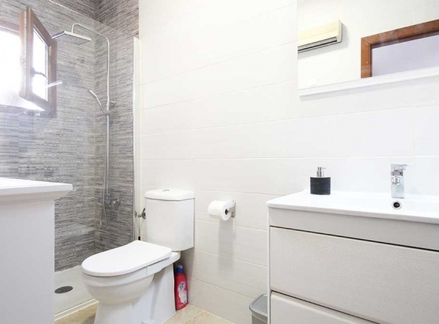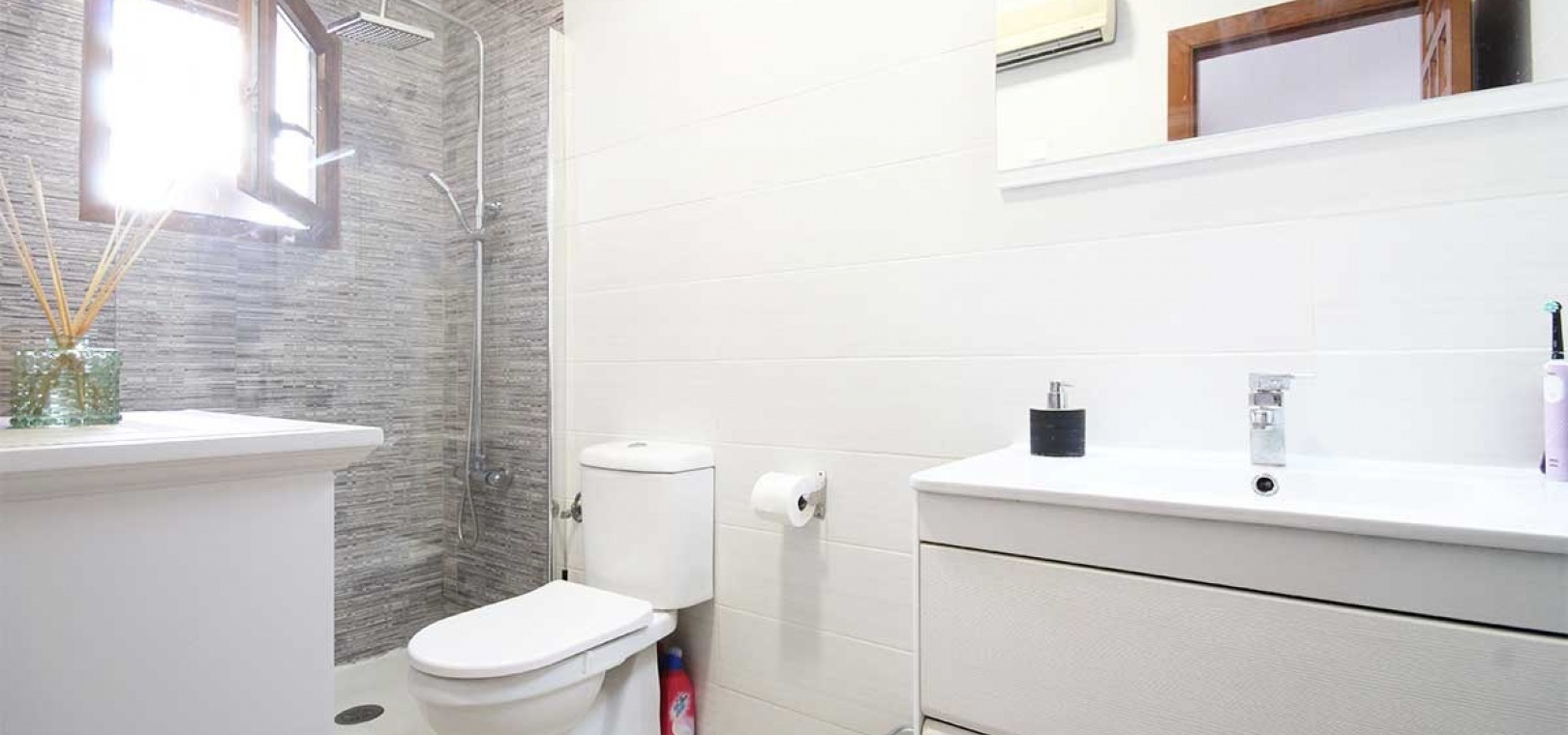Modern Bathroom – Refurbished and well-lit, with walk-in shower, vanity unit, WC, and extra storage.