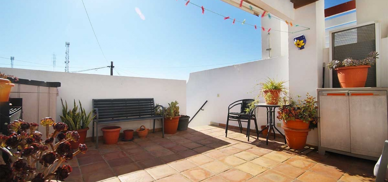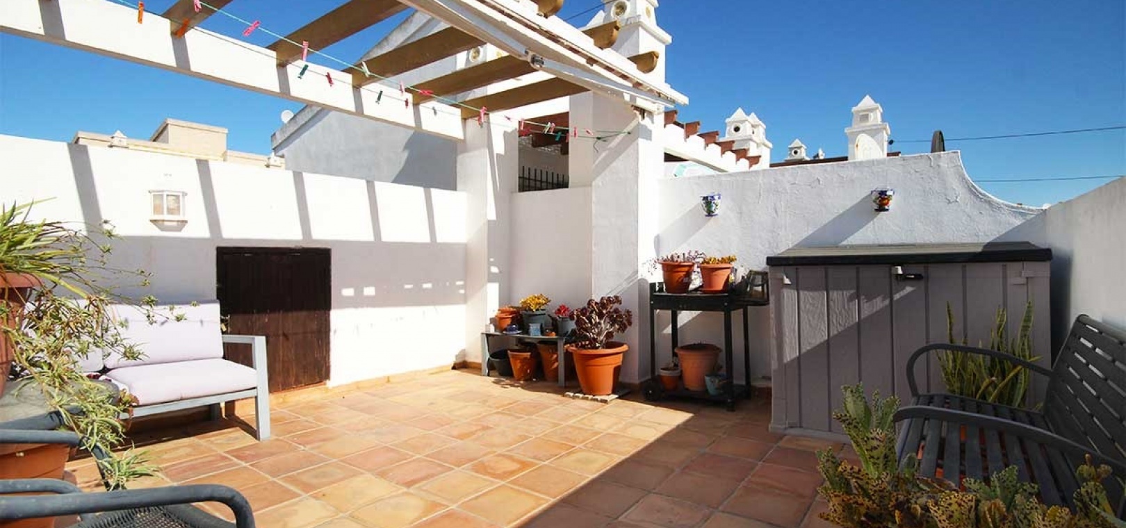 Rooftop Solarium – Sunny and private with open views across the neighbourhood, fitted with an awning for shade and access to a storage cupboard.