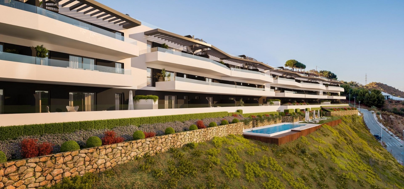 Both its avant-garde homes and its complete communal areas are laid out to blend in with the surroundings. With the vegetation and landscape as a backdrop, it opens up to the spectacular views of the bay of Malaga, without renouncing the panoramic views that surround the complex, sheltered by the natural parks of the Sierra de Tejada and the Montes de Malaga.