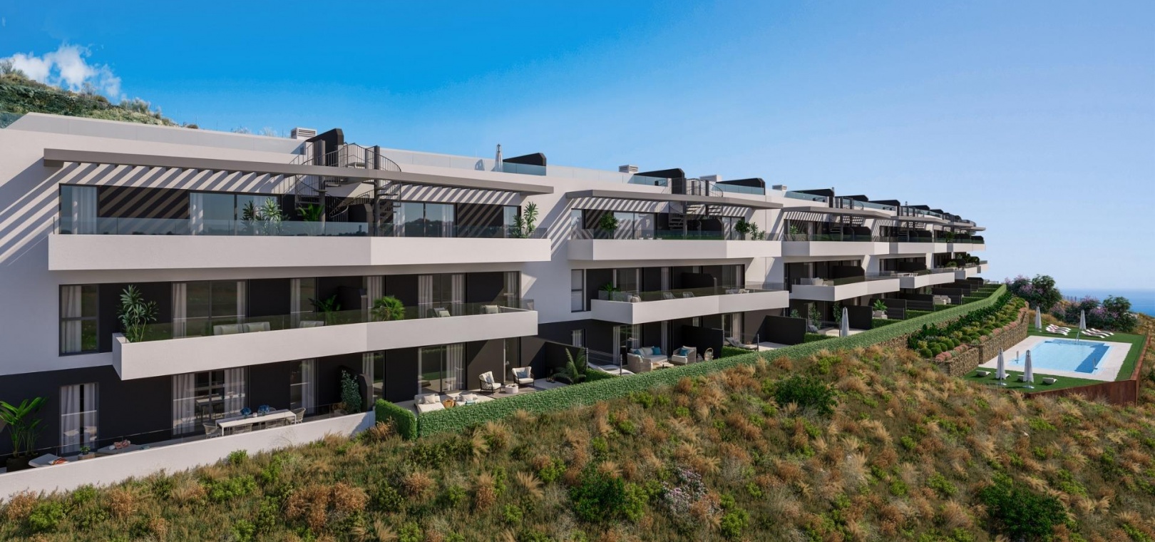 Swimming in the communal swimming pool is like floating over the horizon. Situated on the hillside that crowns the development, its views extend unobstructed, both inland towards the coast.