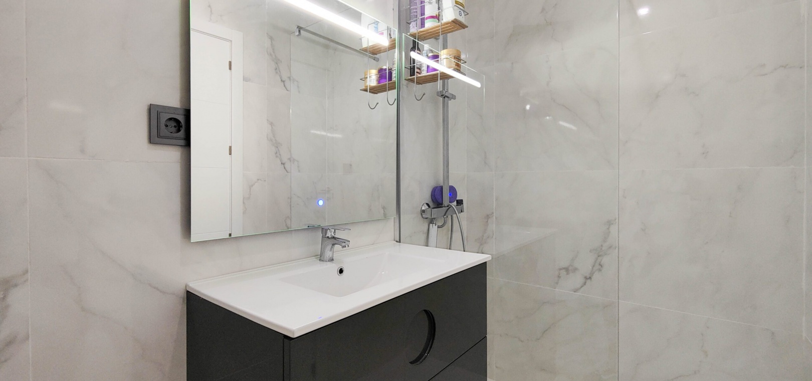 The apartment features 2 spacious bedrooms with fitted wardrobes and terrace access, 2 modern bathrooms with showers, and a bright living/dining room with a brand-new integrated kitchen.