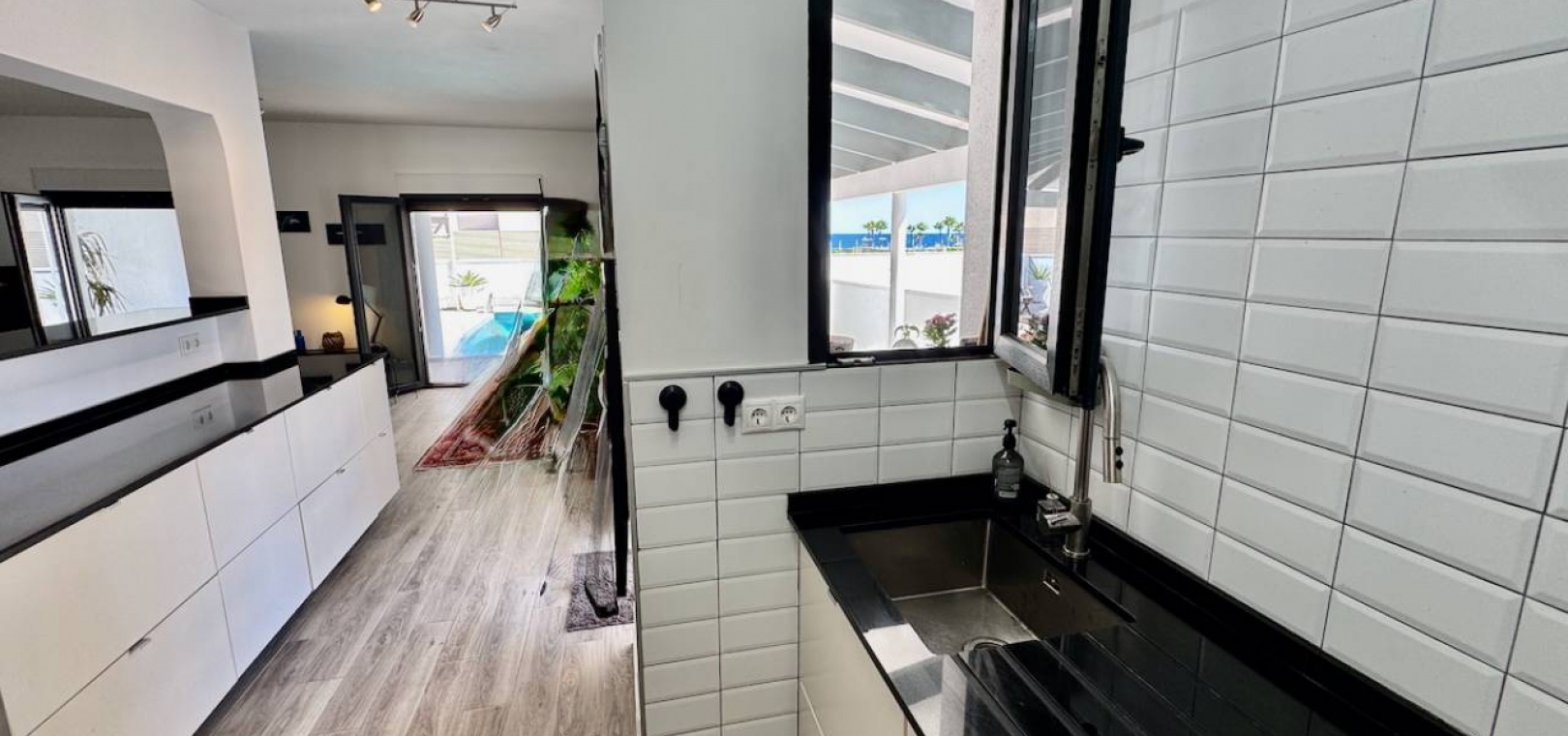 Bright, open-plan living and dining area with abundant natural light, paired with a contemporary American-style kitchen complete with white goods. The villa has views of the sea from nearly every room, offers 3 generous bedrooms with fitted wardrobes and 2 well-appointed bathrooms. Practical extras include a utility room and a separate storage room for added convenience.