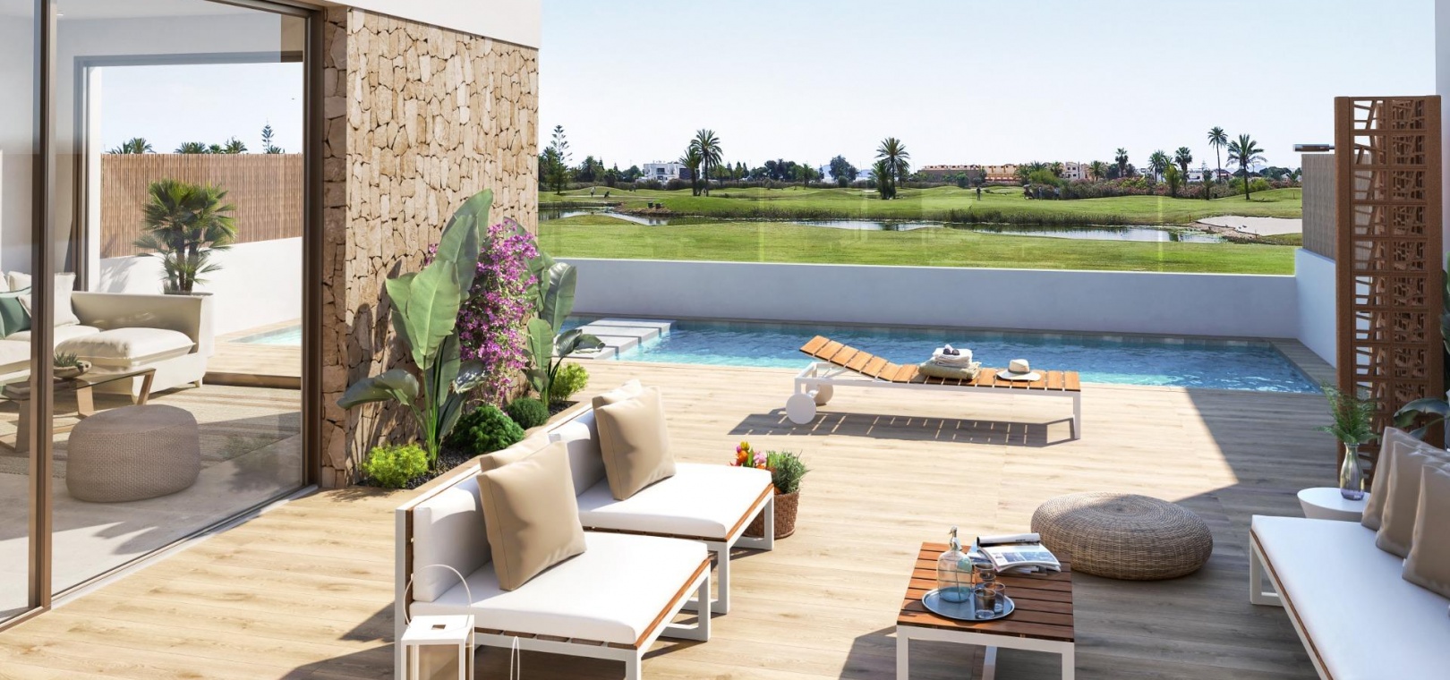 The development includes 13 contemporary apartments with 2, 3, or 4 bedrooms and 4 exclusive golf front line one-level villas with 3 bedrooms. Each property combines modern design with high-quality finishes and functional layouts. Villas offer private plots with gardens and pools, and the option of a private solarium for an extra touch of luxury. All homes enjoy impressive views of the golf course and the Mar Menor.