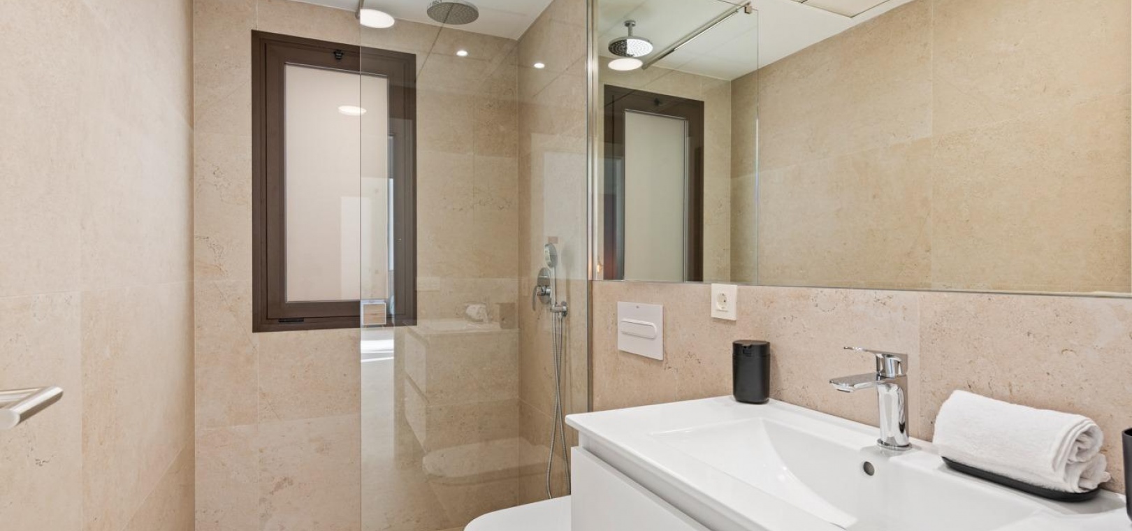 Fully equipped bathrooms with furniture and shower screens