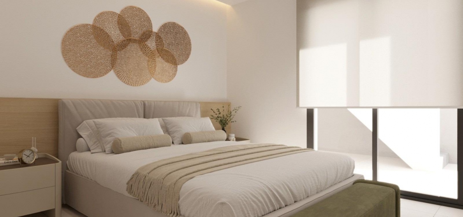 Top-floor bungalows: 2 bedrooms, 2 bathrooms, open-plan kitchen with large living area, terrace, and private solarium, perfect for enjoying the Mediterranean sun.