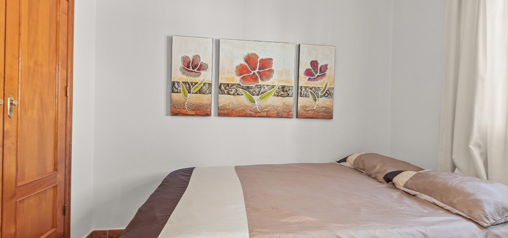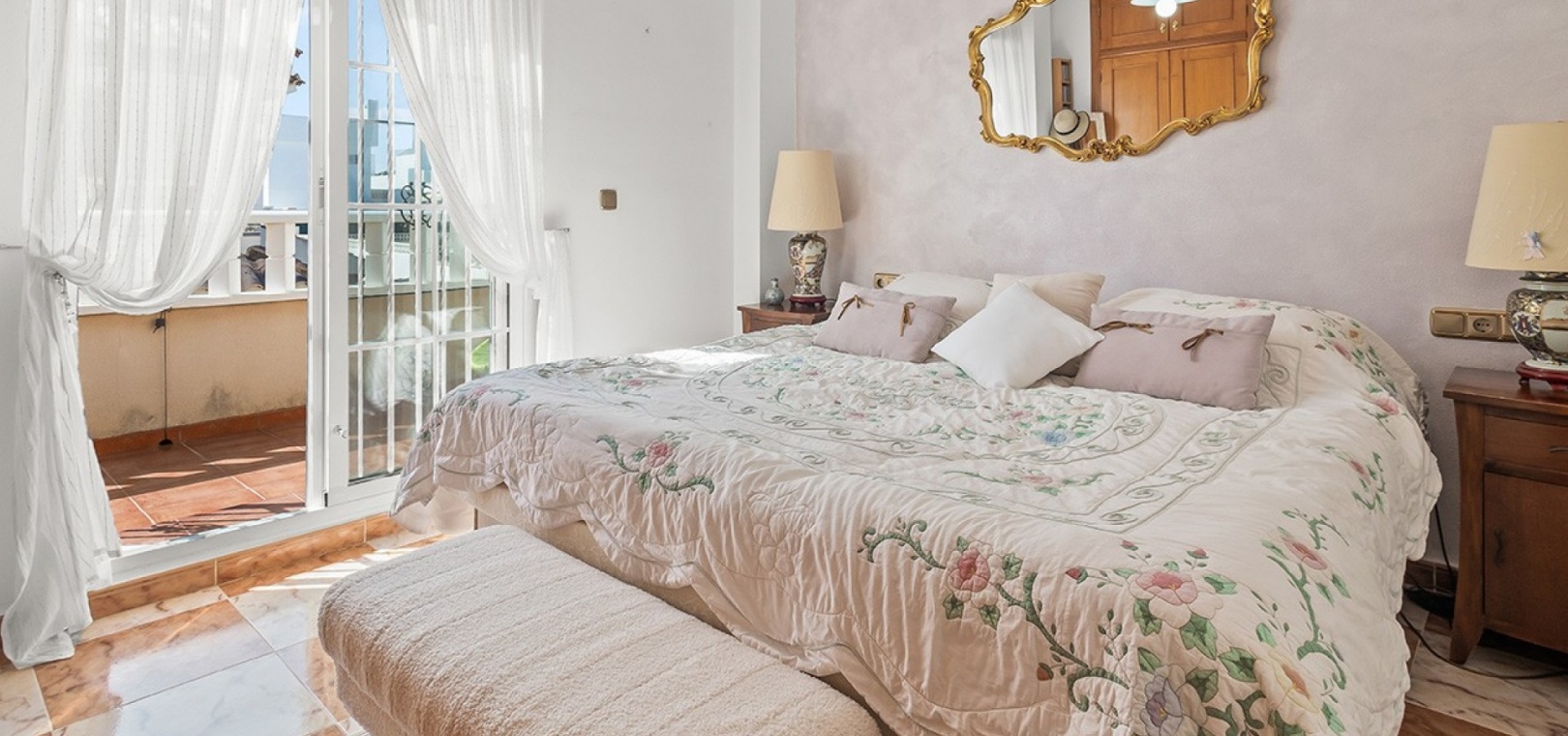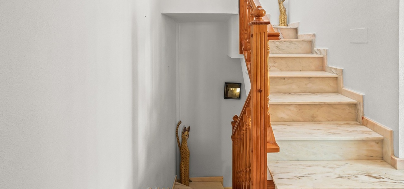 Upstairs, there are two large bedrooms. The main bedroom is south-facing and has access to a private terrace. From there, stairs lead to the private solarium offering beautiful distant sea views—a peaceful retreat for relaxation and sunbathing.