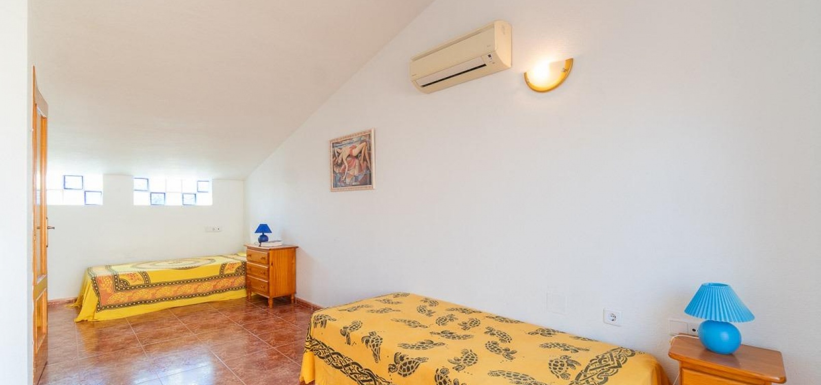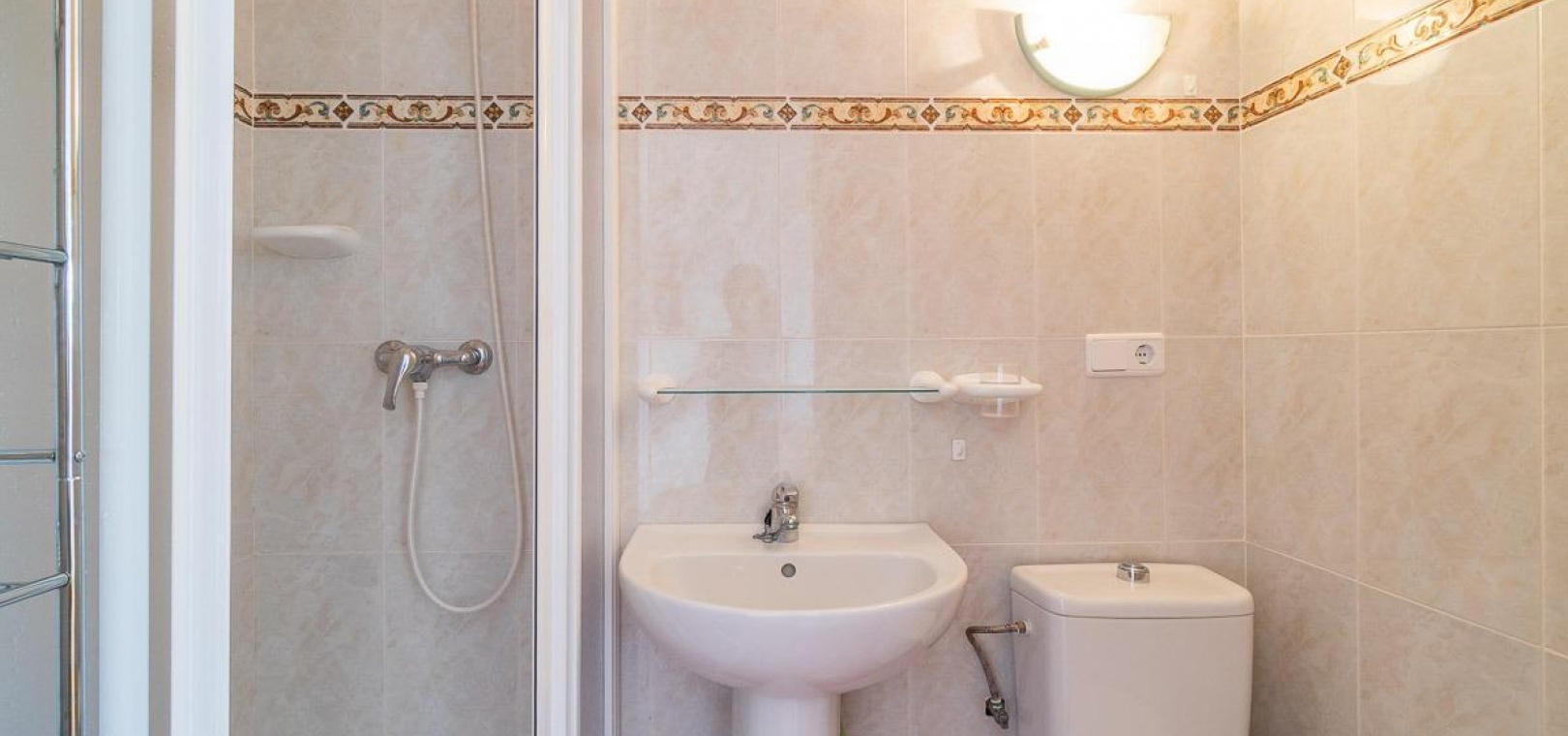 The first floor comprises two bedrooms with built-in wardrobes, one with a balcony, and a full bathroom with a walk-in shower. The top floor houses a third attic bedroom with an en-suite bathroom and access to a private solarium-terrace, ideal for children or teenagers.