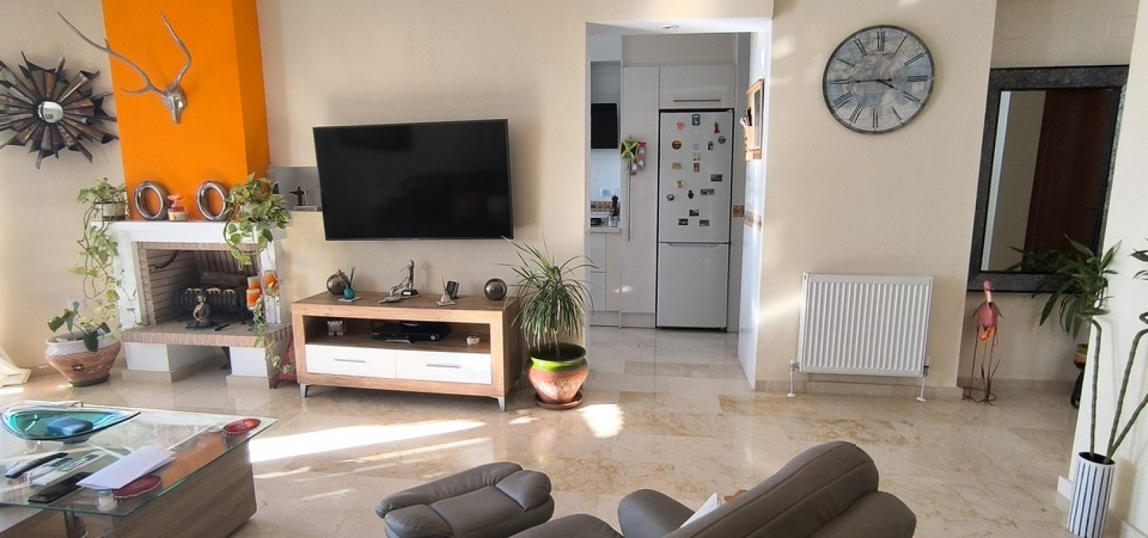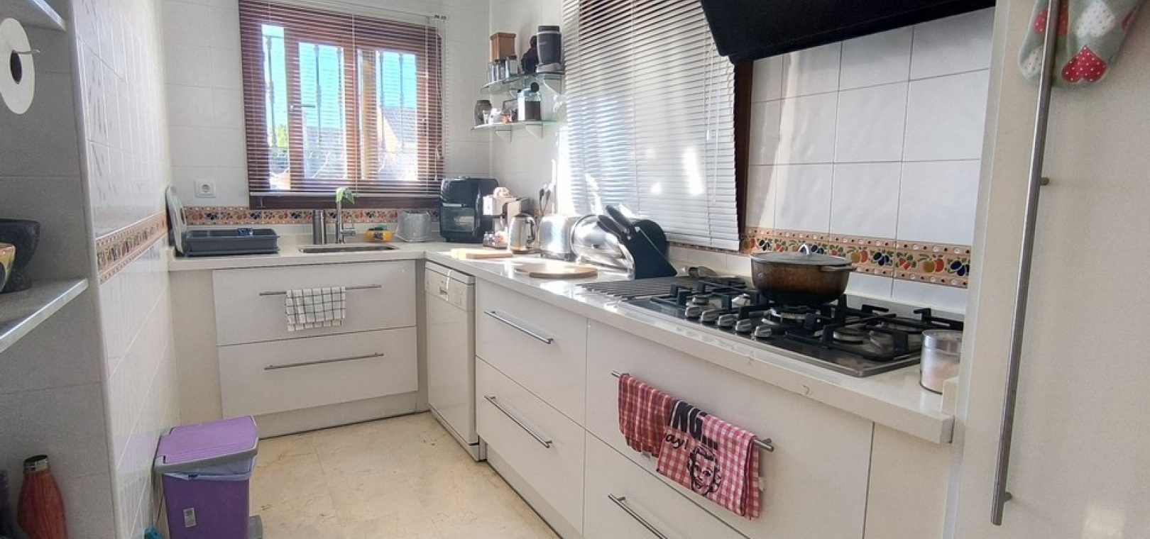 A charming side terrace captures the morning sun—an ideal spot for enjoying breakfast outdoors. Inside, the villa has been thoughtfully reconfigured to create a larger, more open living area. The bright and spacious lounge provides the perfect place to relax and entertain, while the separate, well-equipped kitchen offers convenient access to the garage.