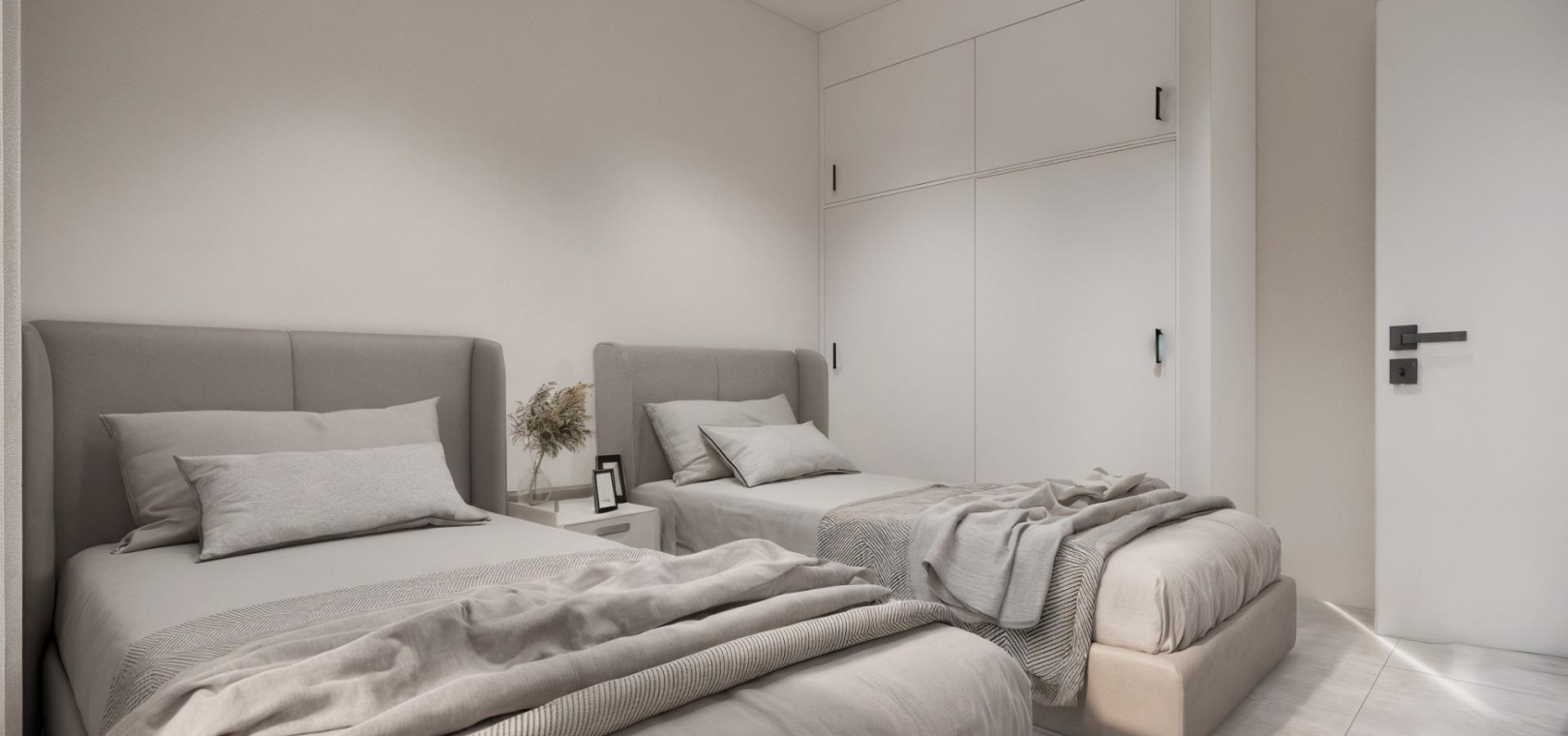 On the upper floor, there are two spacious bedrooms, each with its own bathroom, one of them en suite. Both bedrooms enjoy access to a private open terrace of 17 m². For those who want even more outdoor space, there is an optional rooftop solarium available at an additional cost.