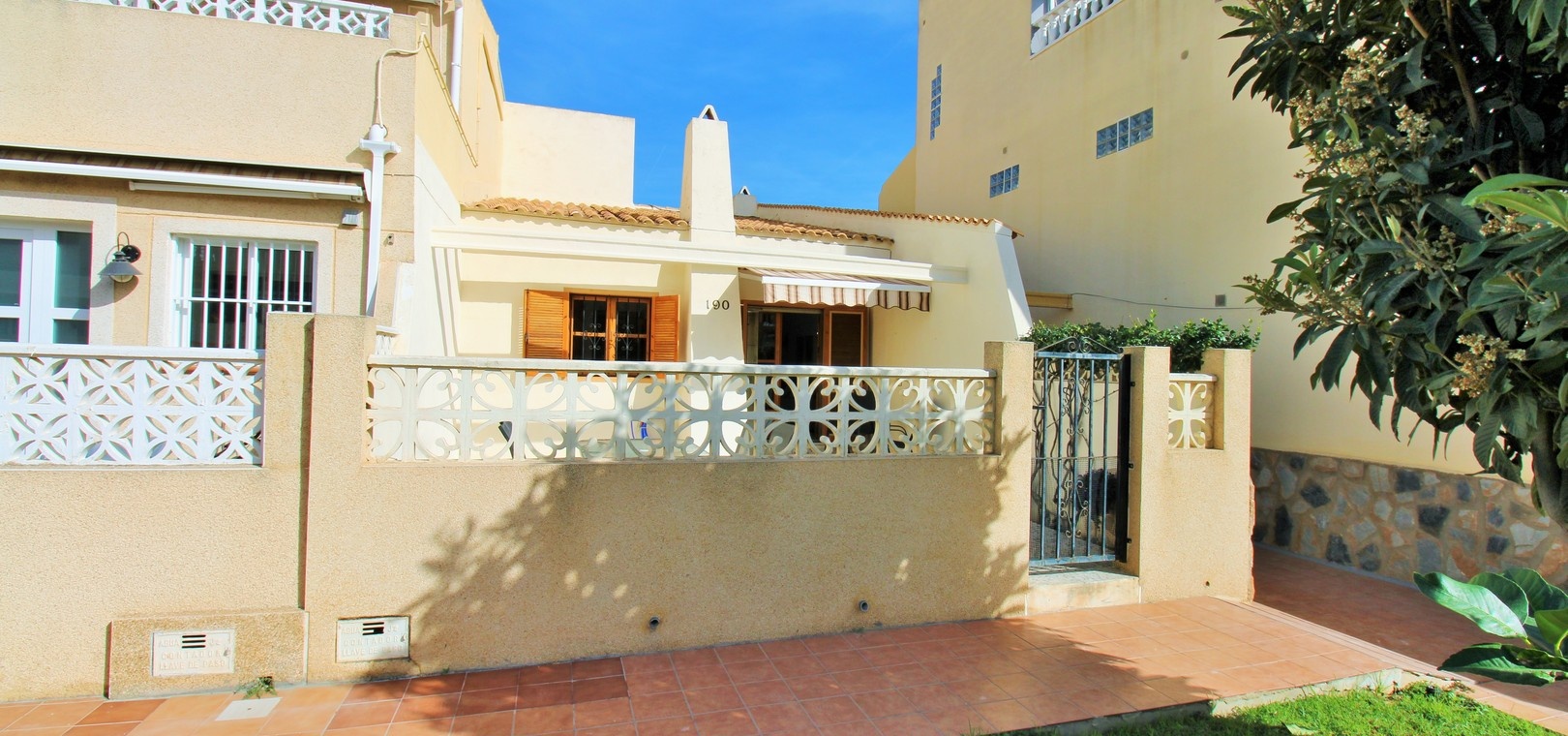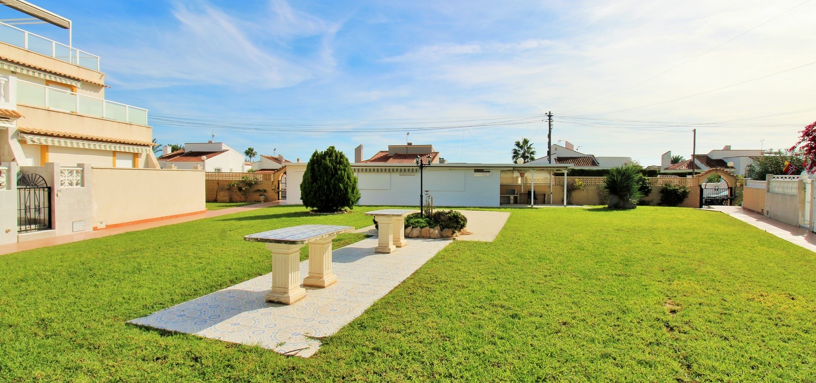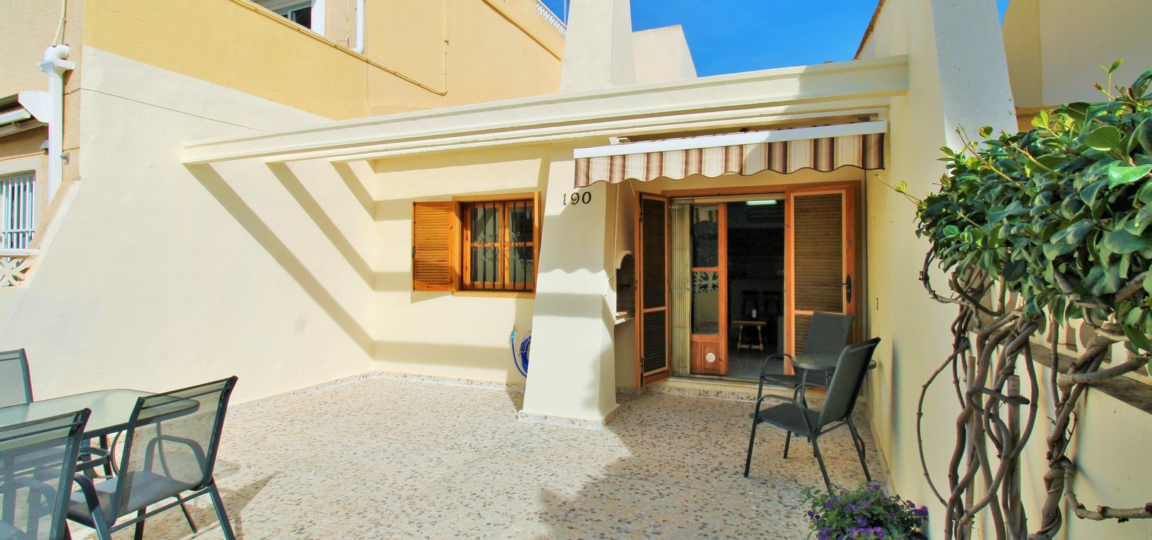 An exceptional end-of-terrace bungalow offering superb value in the gated community of Manzana 7, Las Chismosas, Playa Flamenca. With a desirable south-west orientation, the property enjoys sunshine throughout the day and features a generous front terrace with built-in BBQ and retractable awnings—perfect for relaxing or entertaining. Residents also benefit from beautifully maintained communal green areas.