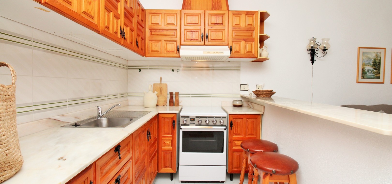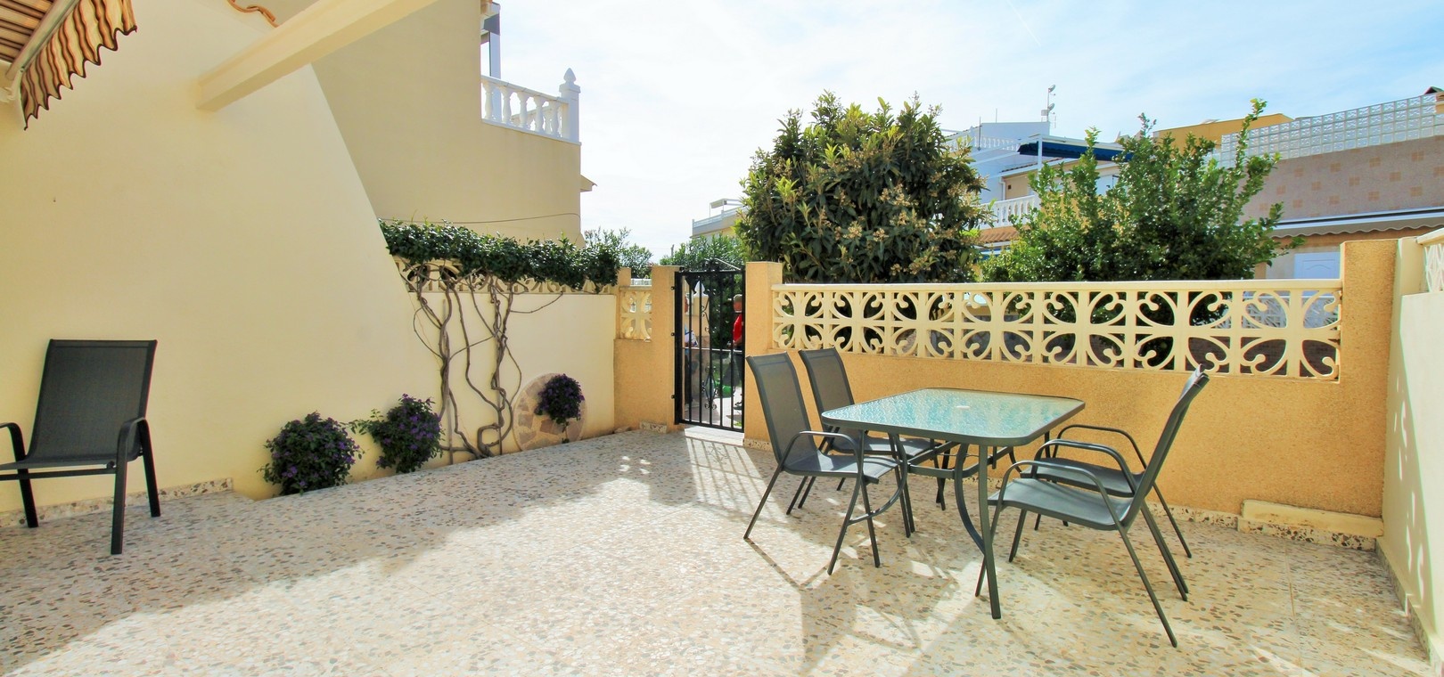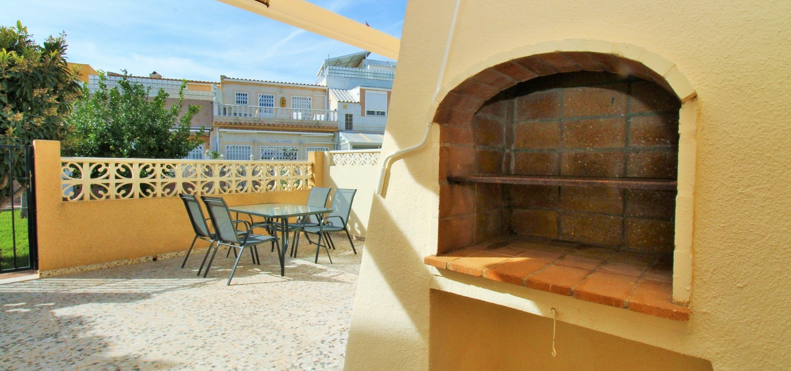 An exceptional end-of-terrace bungalow offering superb value in the gated community of Manzana 7, Las Chismosas, Playa Flamenca. With a desirable south-west orientation, the property enjoys sunshine throughout the day and features a generous front terrace with built-in BBQ and retractable awnings—perfect for relaxing or entertaining. Residents also benefit from beautifully maintained communal green areas.