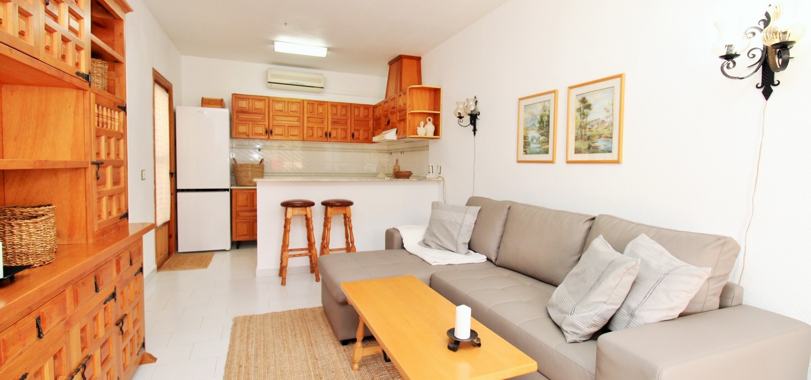 All living accommodation is arranged on one level, comprising a bright living room with a feature fireplace, an open fully fitted kitchen to the rear with access to an exterior utility area, and a small hallway leading to a light and airy double bedroom with fitted wardrobes and a bathroom with a walk-in shower. The property is offered fully furnished and includes air conditioning.Ideally located within walking distance of local bars and restaurants in La Chismosa and La Florida, and just a short drive to the blue-flag beaches of the Orihuela Costa, Zenia Boulevard, and several top-class golf courses, this bungalow presents a fantastic opportunity in a sought-after location. Early viewings are highly recommended!