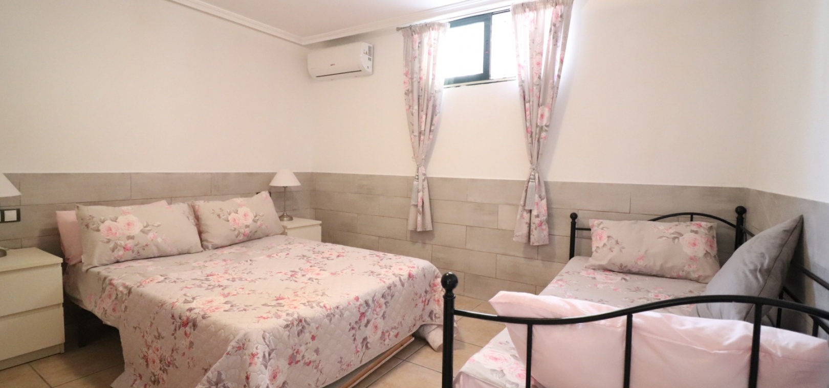 Set on a 226 m² plot with a 151 m² build, the villa features a welcoming lounge leading onto a covered front terrace, perfect for morning coffee or shaded al fresco dining. The separate fully fitted kitchen offers ample workspace and storage, while all bedrooms include fitted wardrobes and air conditioning for year-round comfort. The master bedroom boasts a private en-suite bathroom.