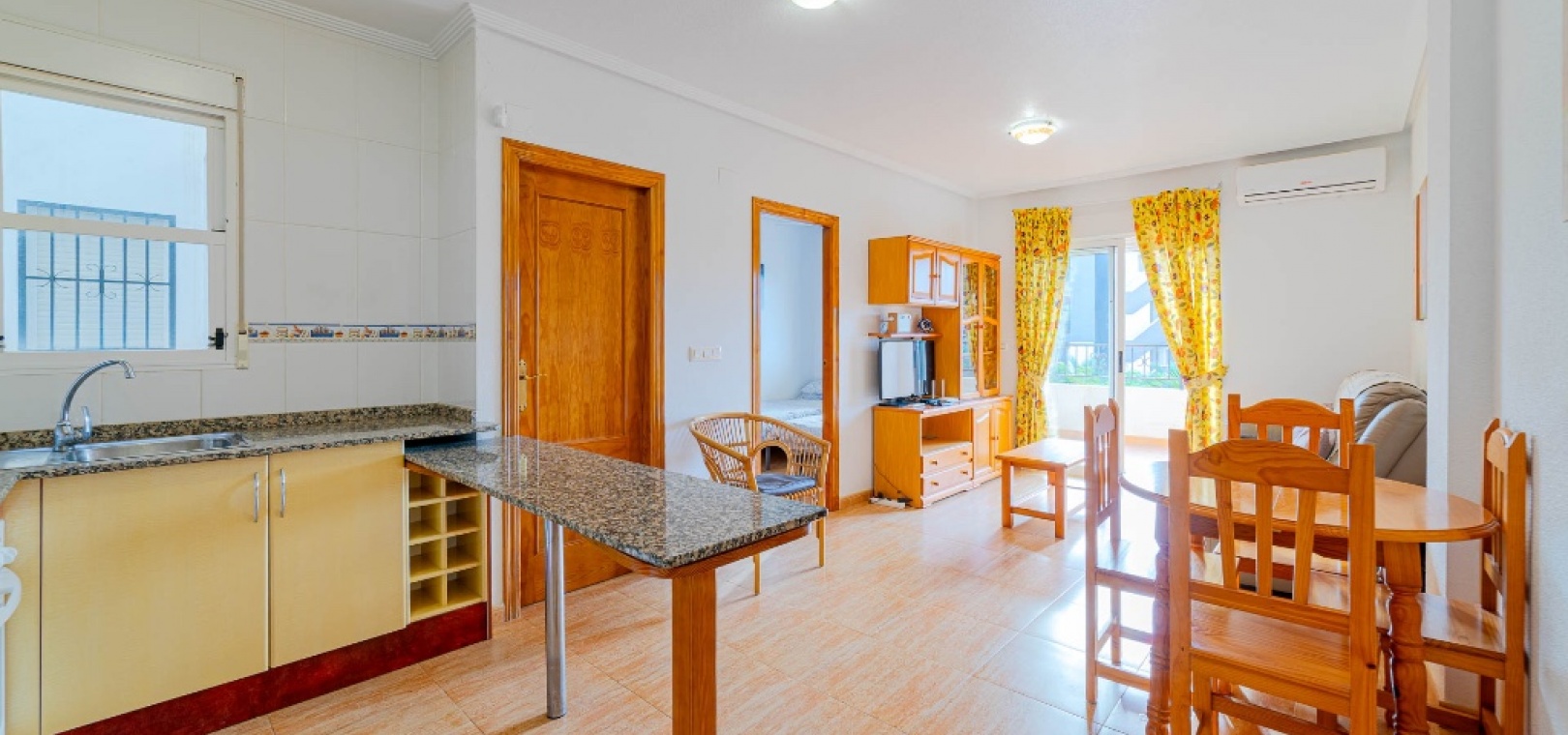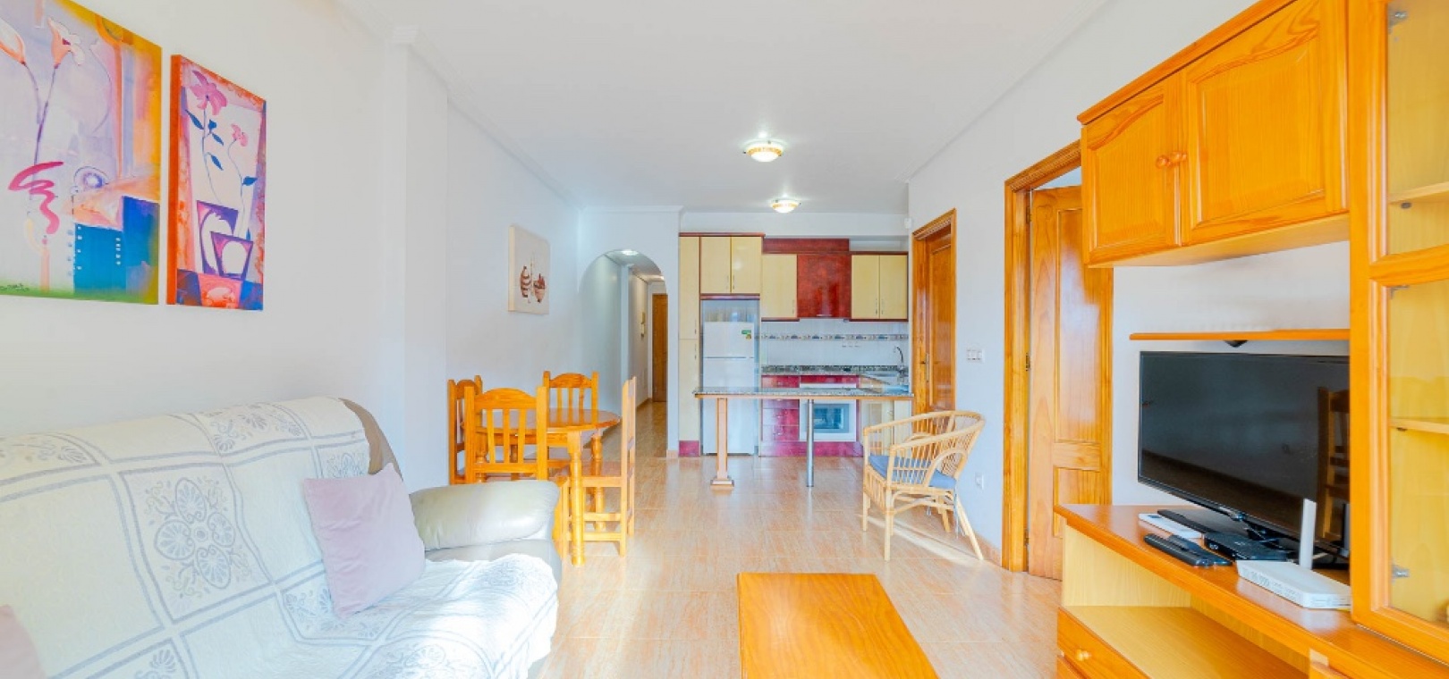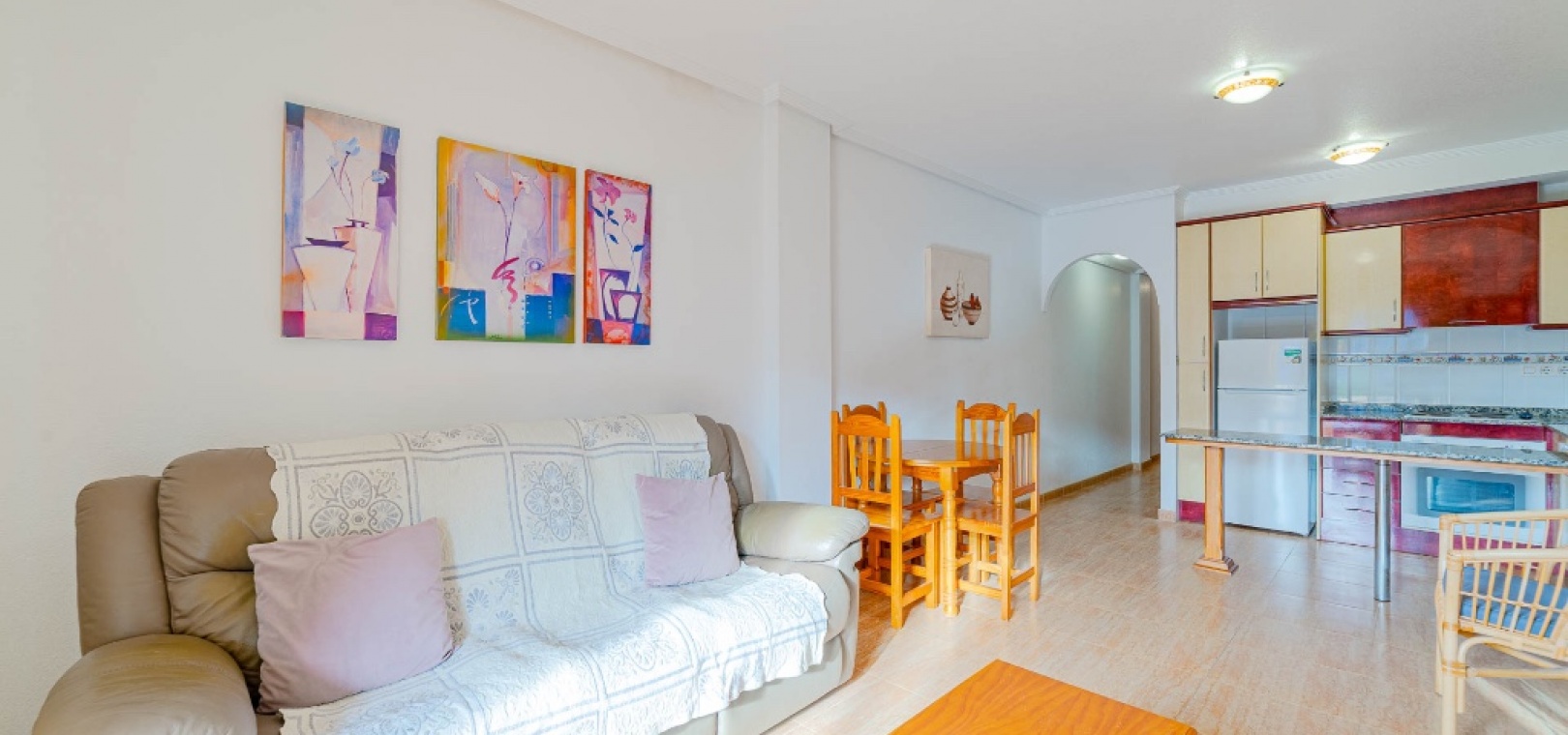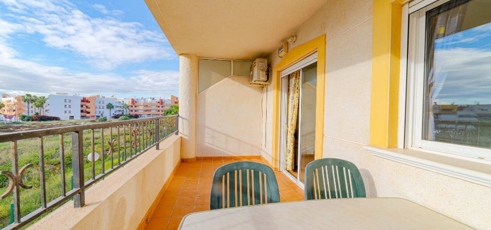 This first-floor apartment between Punta Prima and Playa Flamenca delivers a combo that's getting harder to find: a move-in ready home with two double bedrooms with fitted wardrobes and a full bathroom. The open-plan living area brings together a comfortable lounge, dining space and a kitchen and a sunny terrace .