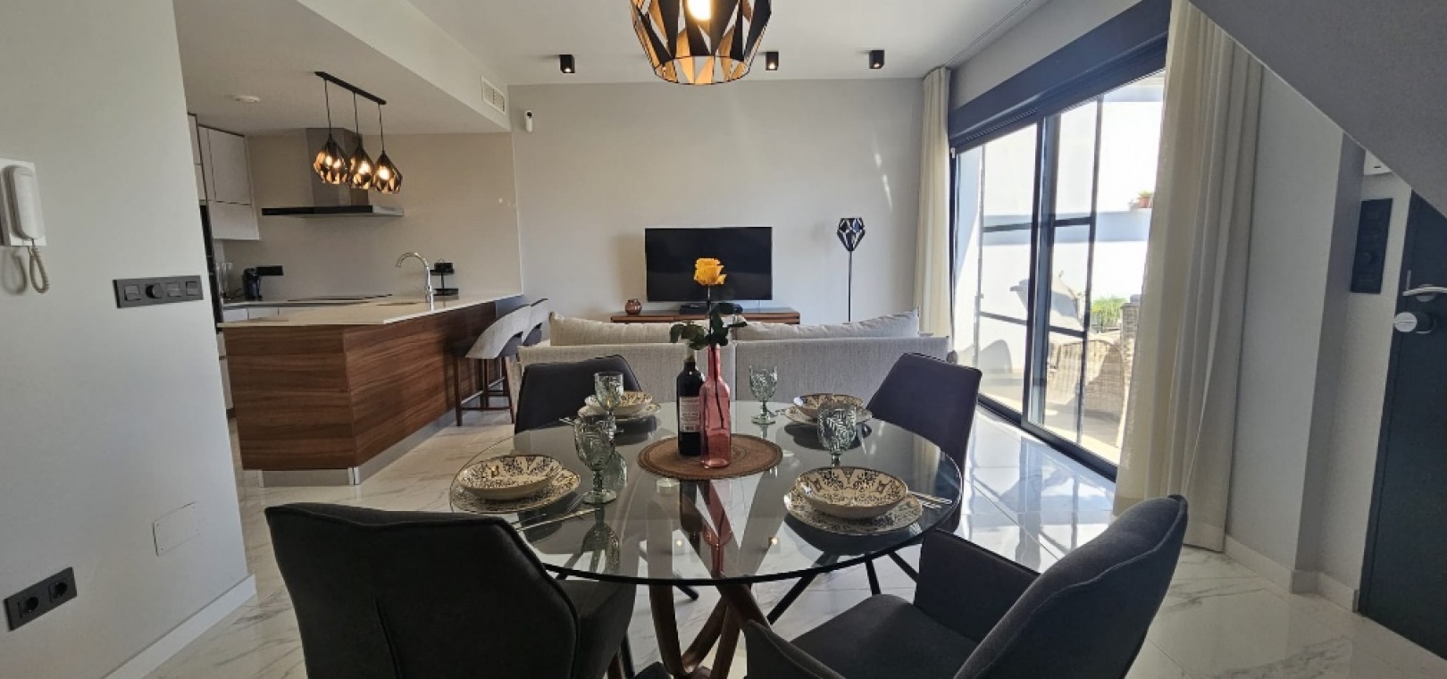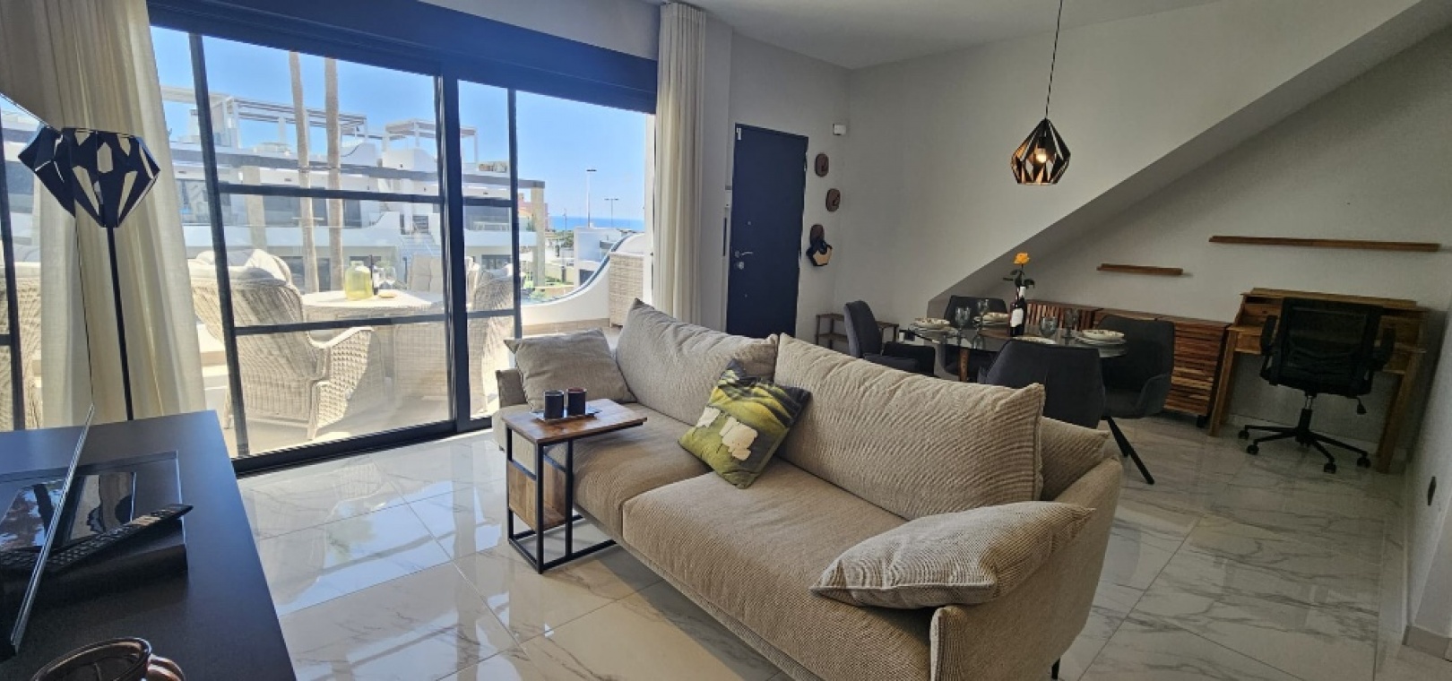 The property has : 2 bedrooms and 2 bathrooms , living room area with open style kitchen and a solarium overlooking the sea and community area.