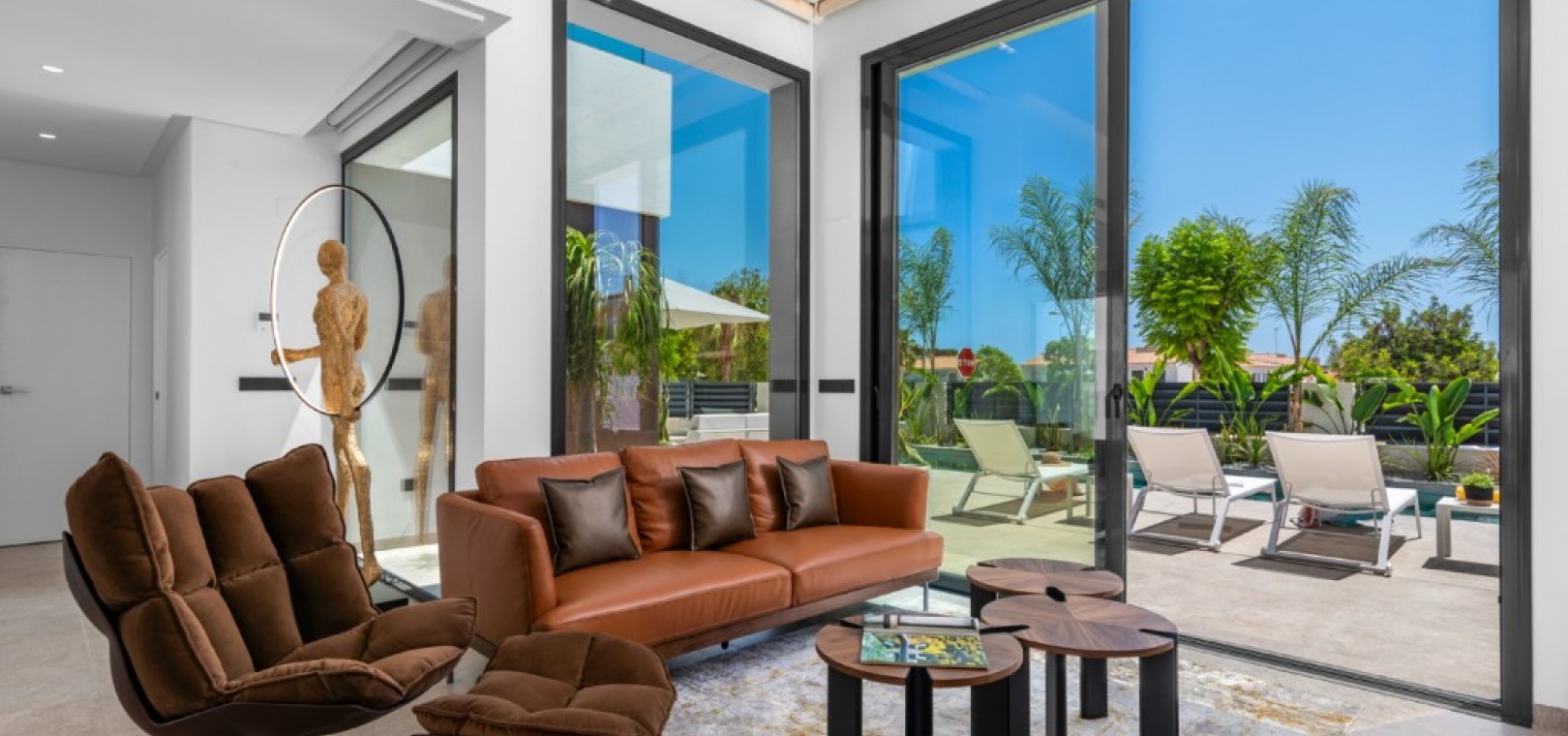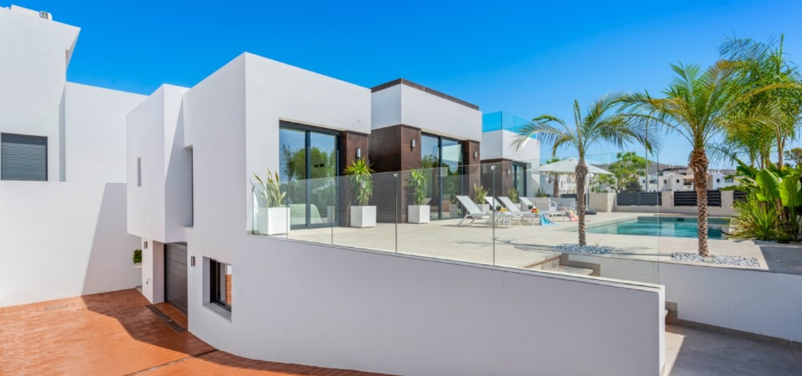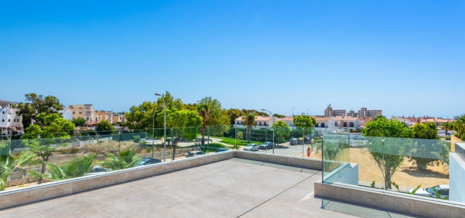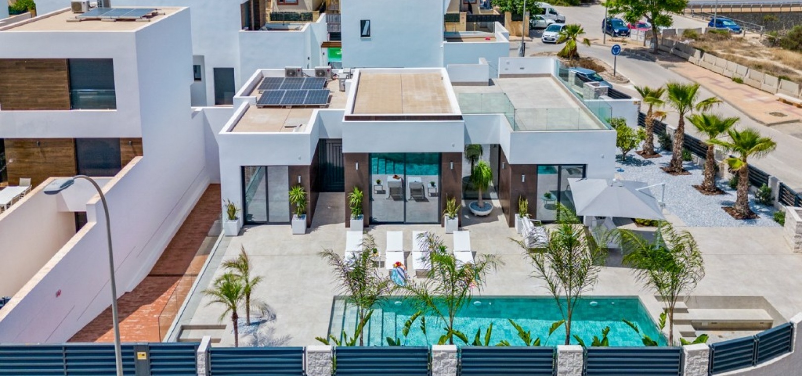 This newly built villa could be your dream come true: modern and close to all amenities.It features three spacious bedrooms with built-in wardrobes, three bathrooms, and a large terrace. All finishes are high-quality and feature a contemporary design. The house features a security door, a fully landscaped garden with a terrace, electric blinds, double-glazed windows, underfloor heating, and much more.The villa is ideally located: Alicante Airport is just a 20-minute drive away. A shopping area with bars and shops is nearby, and all necessary amenities are within a 5-minute drive, including schools, a medical center, and several shops.This 220 m² villa sits on a 500 m² plot. Construction was completed in mid-2024. The villa is located on a beautiful corner plot facing southeast.Additional features of the villa include a garage, solar panels, storage, a tiled garden with palm trees, air conditioning, laundry facilities, and greenery views. The villa is fully furnished and features a spacious laundry room.