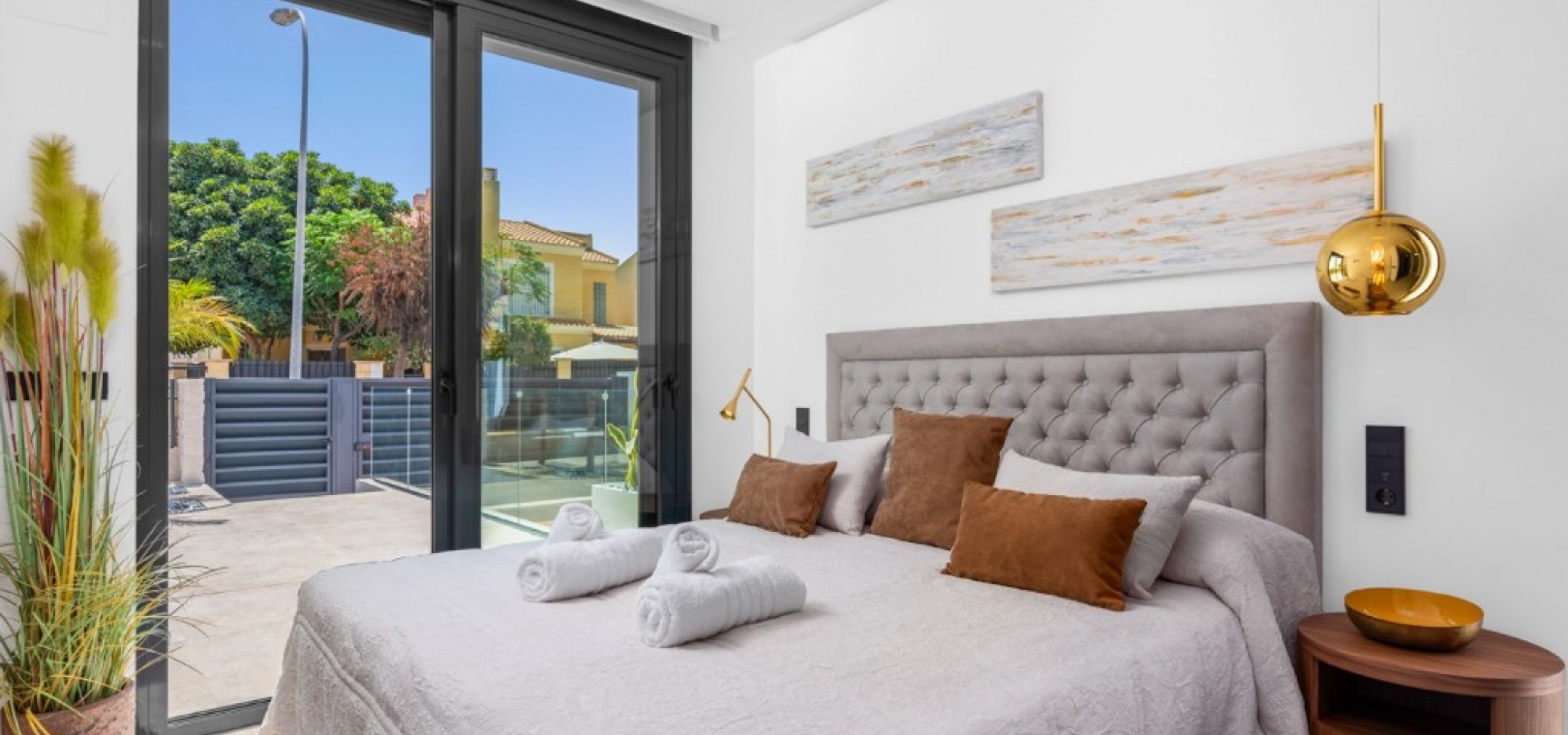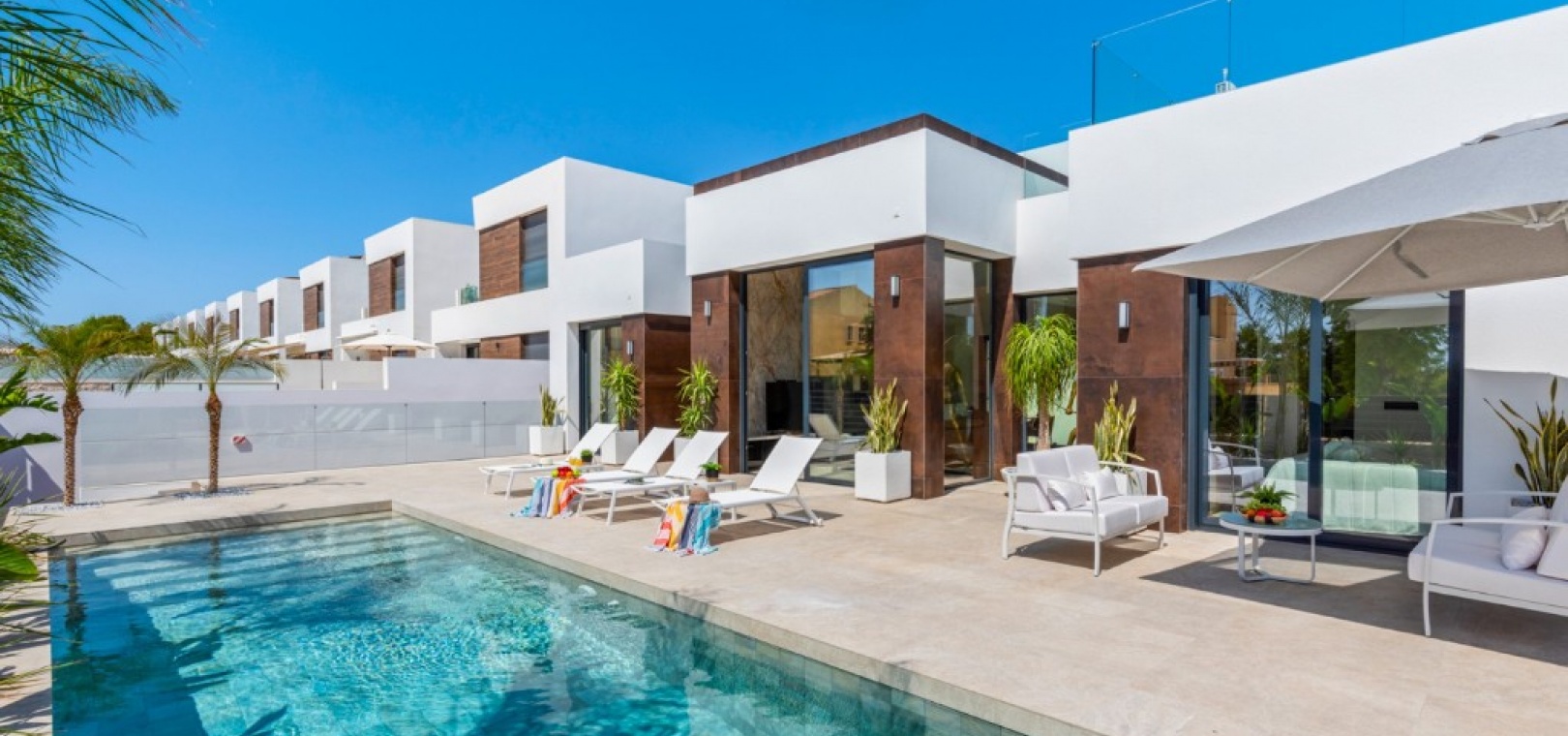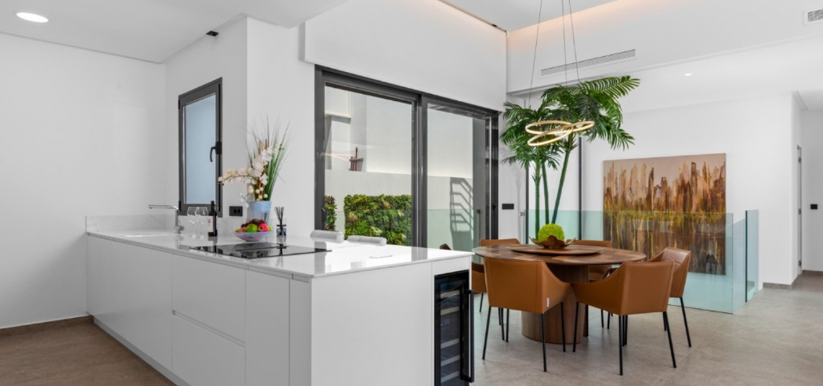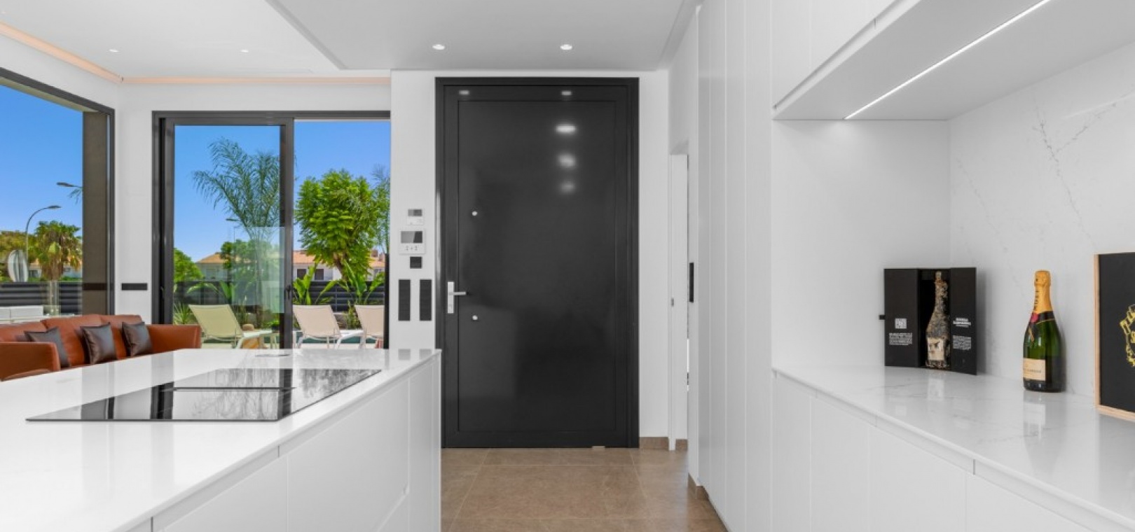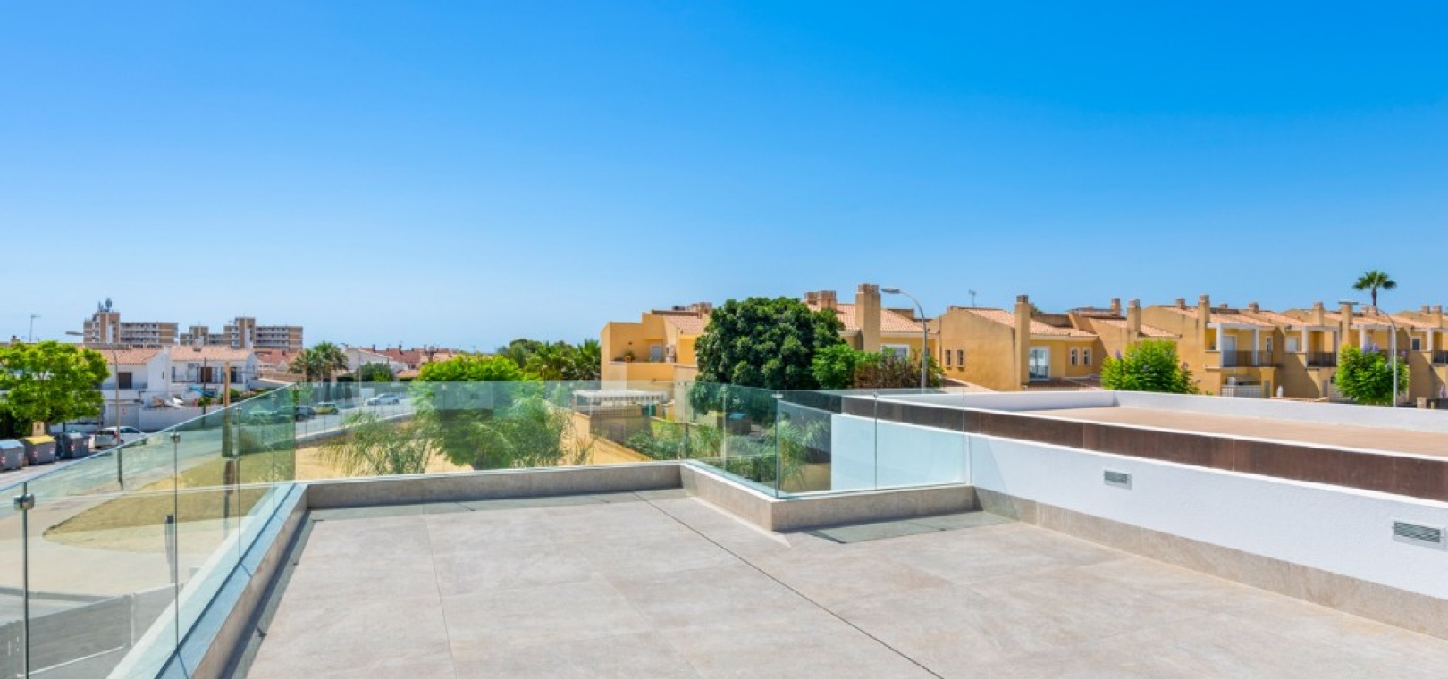 This newly built villa could be your dream come true: modern and close to all amenities.It features three spacious bedrooms with built-in wardrobes, three bathrooms, and a large terrace. All finishes are high-quality and feature a contemporary design. The house features a security door, a fully landscaped garden with a terrace, electric blinds, double-glazed windows, underfloor heating, and much more.The villa is ideally located: Alicante Airport is just a 20-minute drive away. A shopping area with bars and shops is nearby, and all necessary amenities are within a 5-minute drive, including schools, a medical center, and several shops.This 220 m² villa sits on a 500 m² plot. Construction was completed in mid-2024. The villa is located on a beautiful corner plot facing southeast.Additional features of the villa include a garage, solar panels, storage, a tiled garden with palm trees, air conditioning, laundry facilities, and greenery views. The villa is fully furnished and features a spacious laundry room.