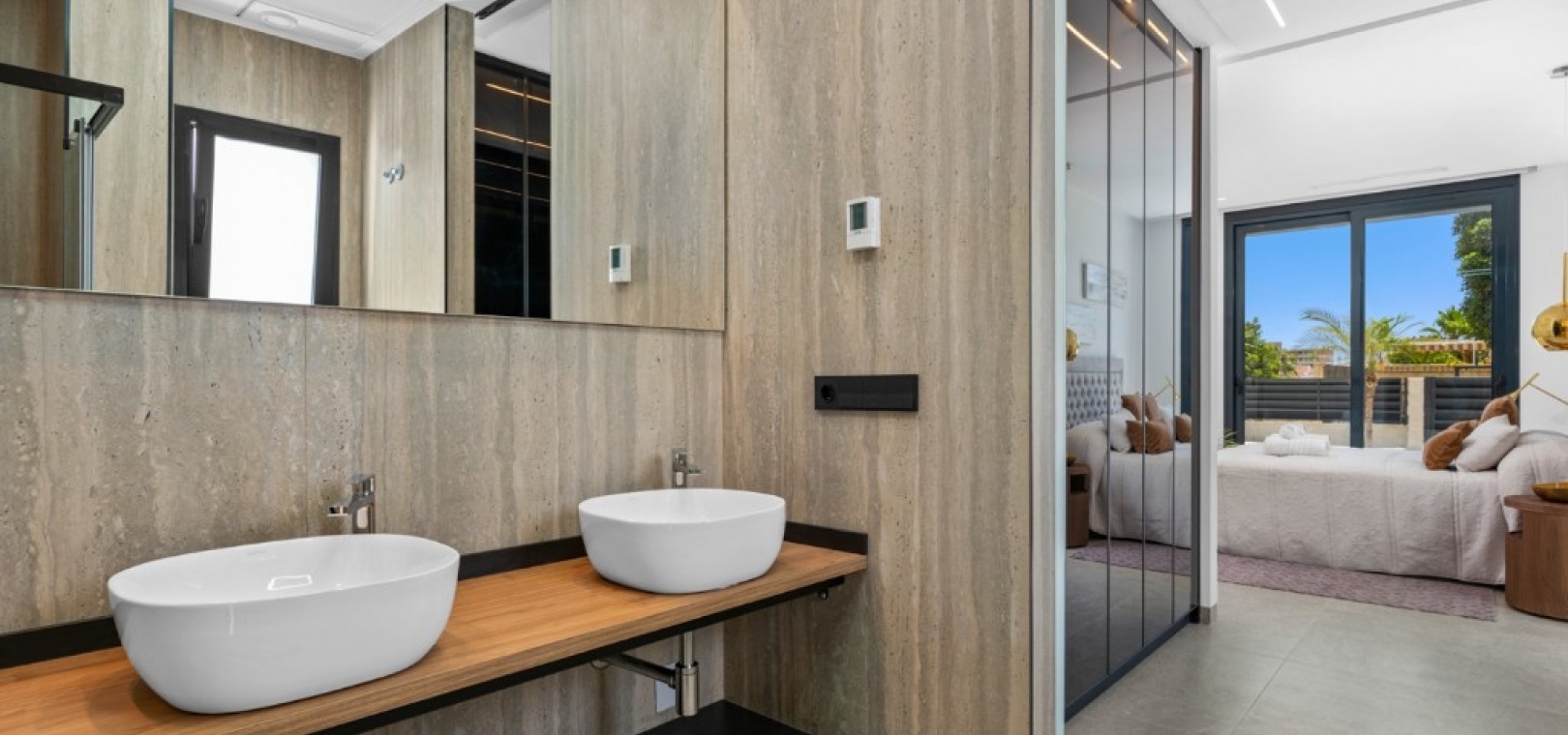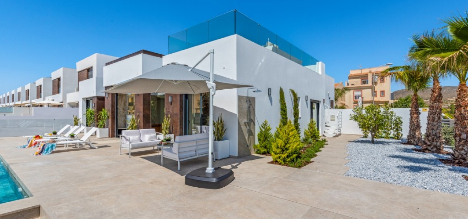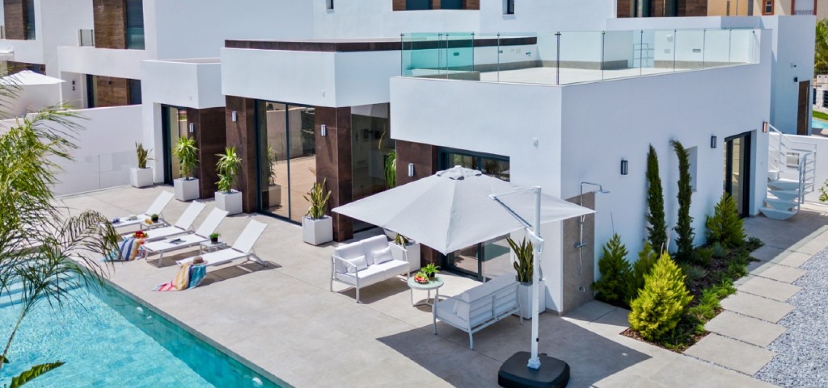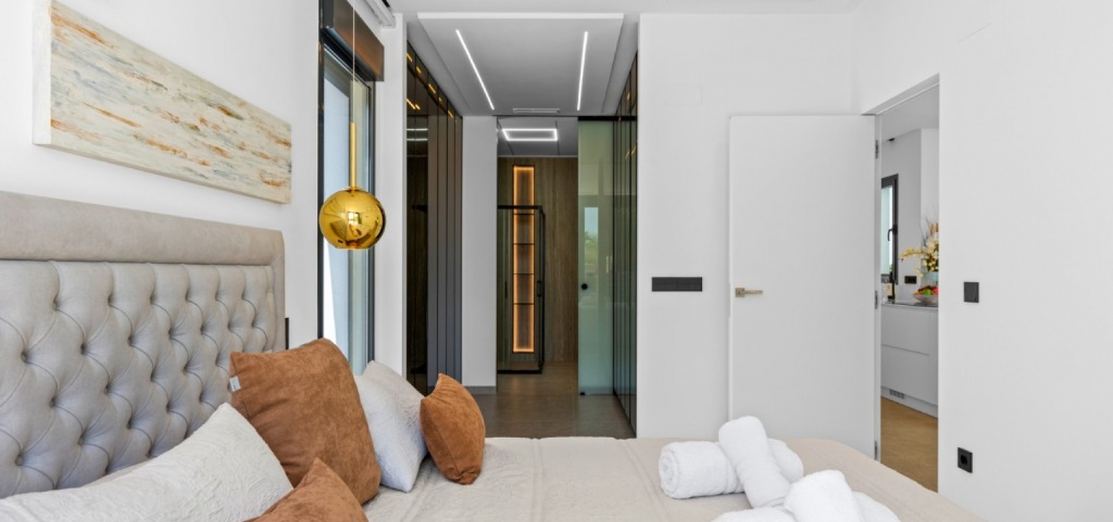 This newly built villa could be your dream come true: modern and close to all amenities.It features three spacious bedrooms with built-in wardrobes, three bathrooms, and a large terrace. All finishes are high-quality and feature a contemporary design. The house features a security door, a fully landscaped garden with a terrace, electric blinds, double-glazed windows, underfloor heating, and much more.The villa is ideally located: Alicante Airport is just a 20-minute drive away. A shopping area with bars and shops is nearby, and all necessary amenities are within a 5-minute drive, including schools, a medical center, and several shops.This 220 m² villa sits on a 500 m² plot. Construction was completed in mid-2024. The villa is located on a beautiful corner plot facing southeast.Additional features of the villa include a garage, solar panels, storage, a tiled garden with palm trees, air conditioning, laundry facilities, and greenery views. The villa is fully furnished and features a spacious laundry room.