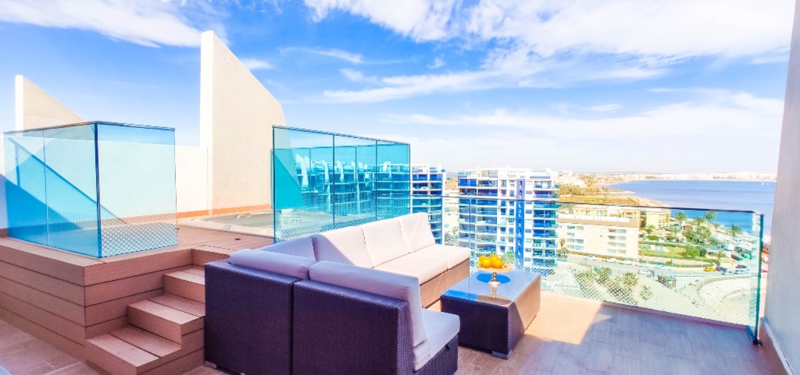 For sale an exceptional frontline apartment in first sea line in Punta Prima. Penthouse consists of 2 bedrooms, 2 bathroom, 9 floor apartment in the Sea Senses development in Punta Prima with spectacular all round panoramic sea views and only 50 meters from the Rocio del Mar beach. Hot and cold air conditioning. Lift access is available.
