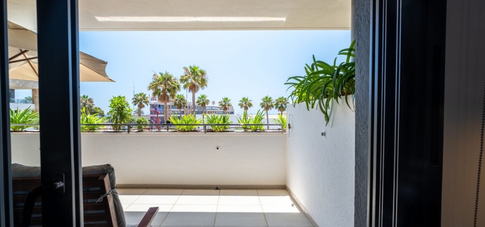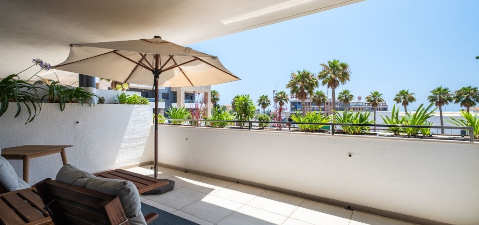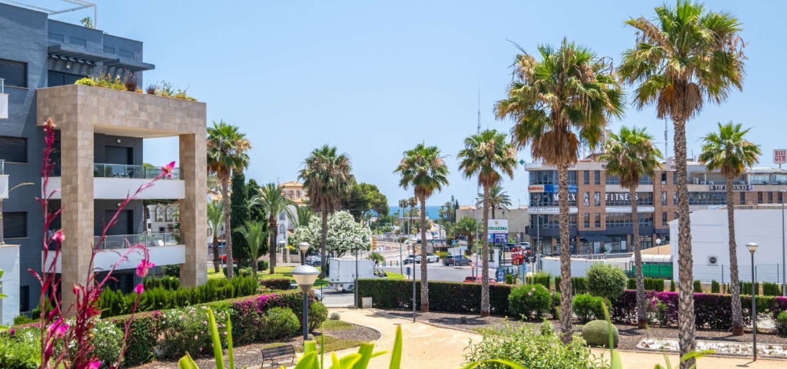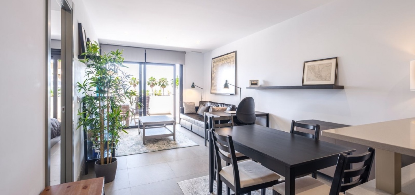 For sale modern apartment close to the sea in ¨Flamenca Village¨, Playa Flamenca,The property was completed as recently as the fall 2021 and is in very good condition. The property has two spacious bedrooms, one of which has direct access to the large terrace of 19 sqm, and two tastefully decorated bathrooms equipped with showers and underfloor heating.The open-plan living room and kitchen provide a very bright and welcoming atmosphere. The kitchen is equipped with high quality appliances. There is also a separate storage room with plenty of space for suitcases, golf bags etc. Adjacent to the kitchen, there is a separate laundry room equipped with a water heater and a washing machine. A water filter has also been installed on the inlet water, which means that you have drinking water, free of lime scale, in all taps. The water filter also helps to significantly extend the life of the dishwasher and the washing machine.From the living room as well as from master bedroom you have access, via sliding glass doors, to the spacious terrace of 19 sqm which offers afternoon sun and a lovely view over the heated pool. There is plenty of space for both dining table and a lounge group.The apartment also includes a garage space. In the garage you also have access to a large bicycle storage.The apartment is sold fully furnished with high quality furnitures as good as new.Flamenca Village is a gated community that offers its members facilities usually found in better hotel resorts. There are four large pool areas, two of which are heated winter time. Each pool area also has a children's pool and two heated jacuzzis. There is a nice playground for the little ones and a well-equipped indoor gymnasium with changing rooms, showers and a sauna. In the center pool area there is a nice chillout bar where you can order snacks and refreshments.Flamenca village is centrally located in the heart of Playa Flamenca. It is only a short walk to two fantastic beaches, a supermarket, bakery, pharmacy and restaurants. In addition, it is only a five-minute walk to the popular Saturday market and the famous Zenia Boulevard shopping centre.