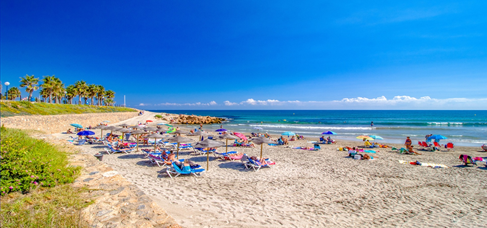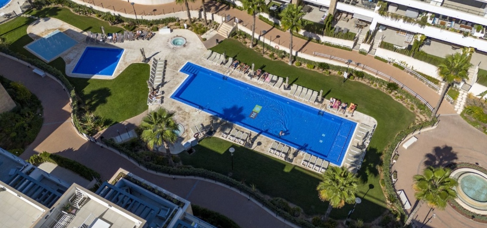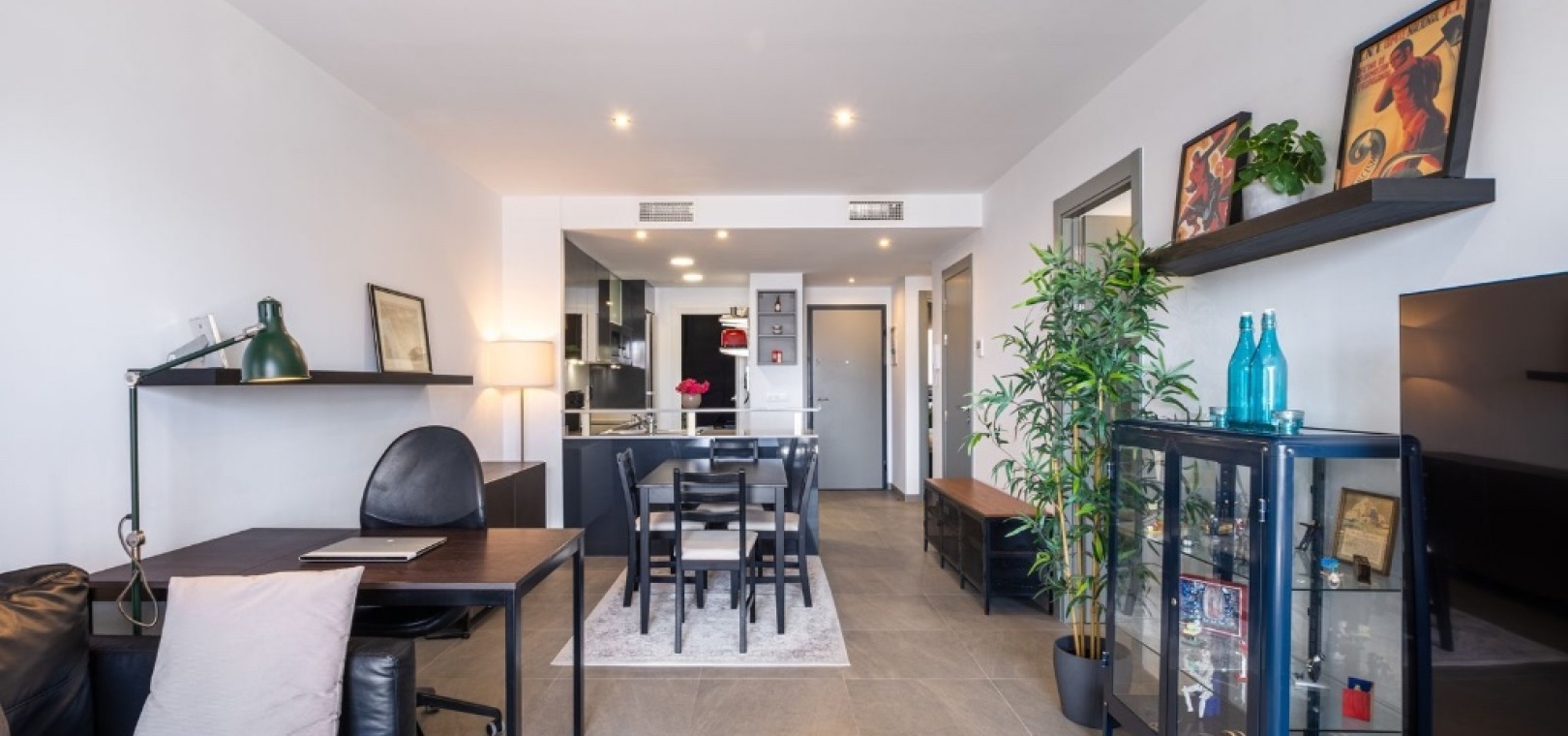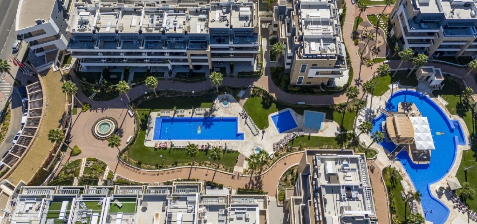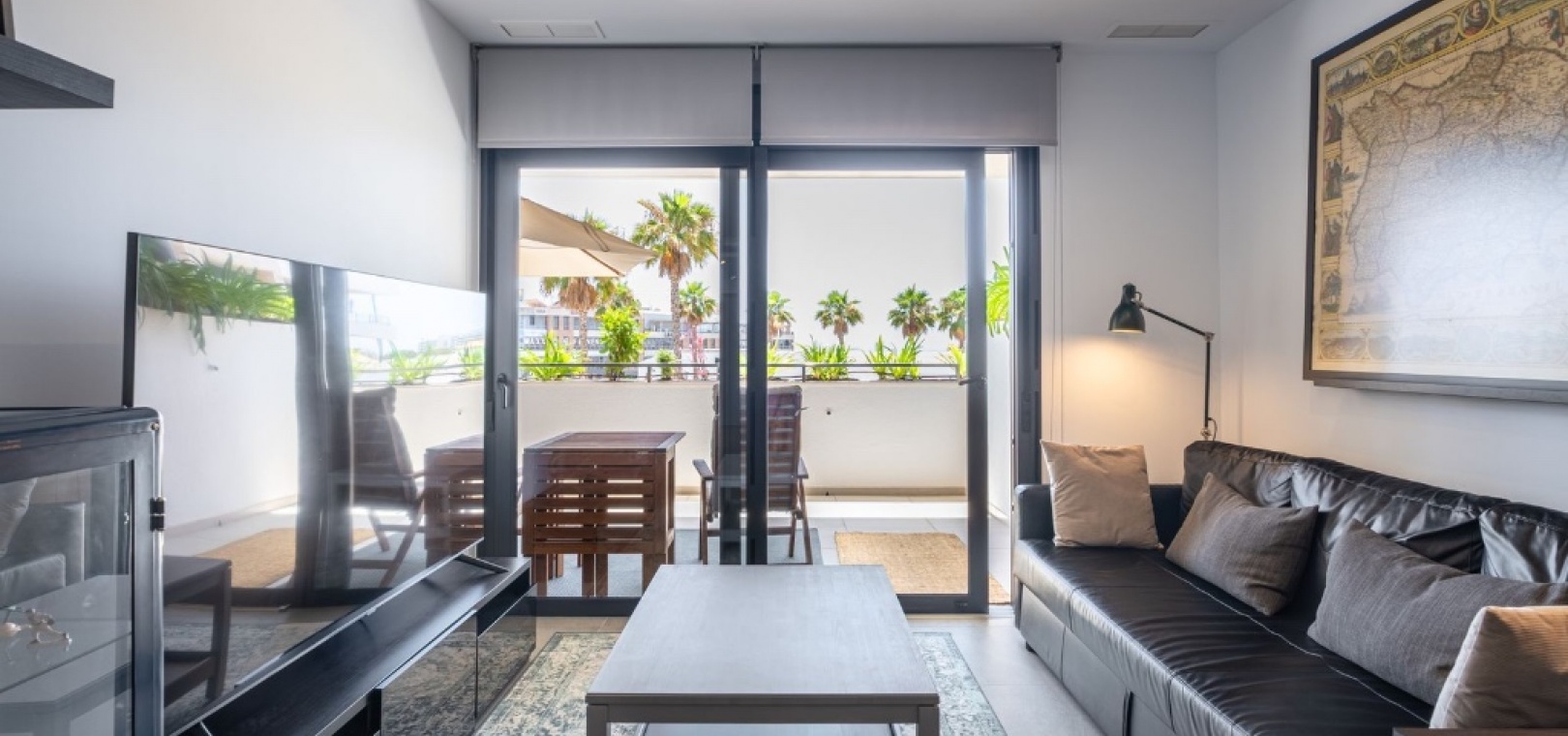 For sale modern apartment close to the sea in ¨Flamenca Village¨, Playa Flamenca,The property was completed as recently as the fall 2021 and is in very good condition. The property has two spacious bedrooms, one of which has direct access to the large terrace of 19 sqm, and two tastefully decorated bathrooms equipped with showers and underfloor heating.The open-plan living room and kitchen provide a very bright and welcoming atmosphere. The kitchen is equipped with high quality appliances. There is also a separate storage room with plenty of space for suitcases, golf bags etc. Adjacent to the kitchen, there is a separate laundry room equipped with a water heater and a washing machine. A water filter has also been installed on the inlet water, which means that you have drinking water, free of lime scale, in all taps. The water filter also helps to significantly extend the life of the dishwasher and the washing machine.From the living room as well as from master bedroom you have access, via sliding glass doors, to the spacious terrace of 19 sqm which offers afternoon sun and a lovely view over the heated pool. There is plenty of space for both dining table and a lounge group.The apartment also includes a garage space. In the garage you also have access to a large bicycle storage.The apartment is sold fully furnished with high quality furnitures as good as new.Flamenca Village is a gated community that offers its members facilities usually found in better hotel resorts. There are four large pool areas, two of which are heated winter time. Each pool area also has a children's pool and two heated jacuzzis. There is a nice playground for the little ones and a well-equipped indoor gymnasium with changing rooms, showers and a sauna. In the center pool area there is a nice chillout bar where you can order snacks and refreshments.Flamenca village is centrally located in the heart of Playa Flamenca. It is only a short walk to two fantastic beaches, a supermarket, bakery, pharmacy and restaurants. In addition, it is only a five-minute walk to the popular Saturday market and the famous Zenia Boulevard shopping centre.