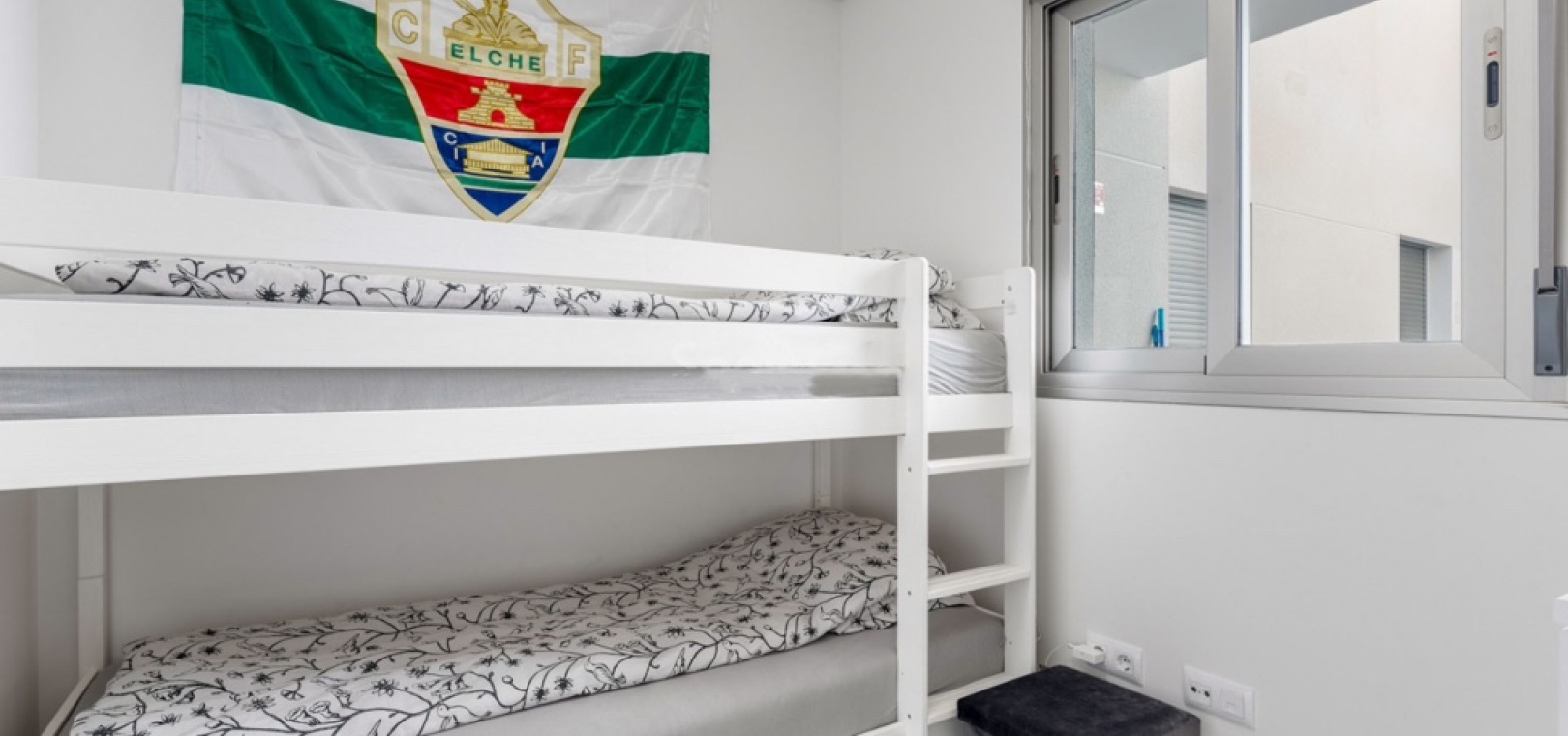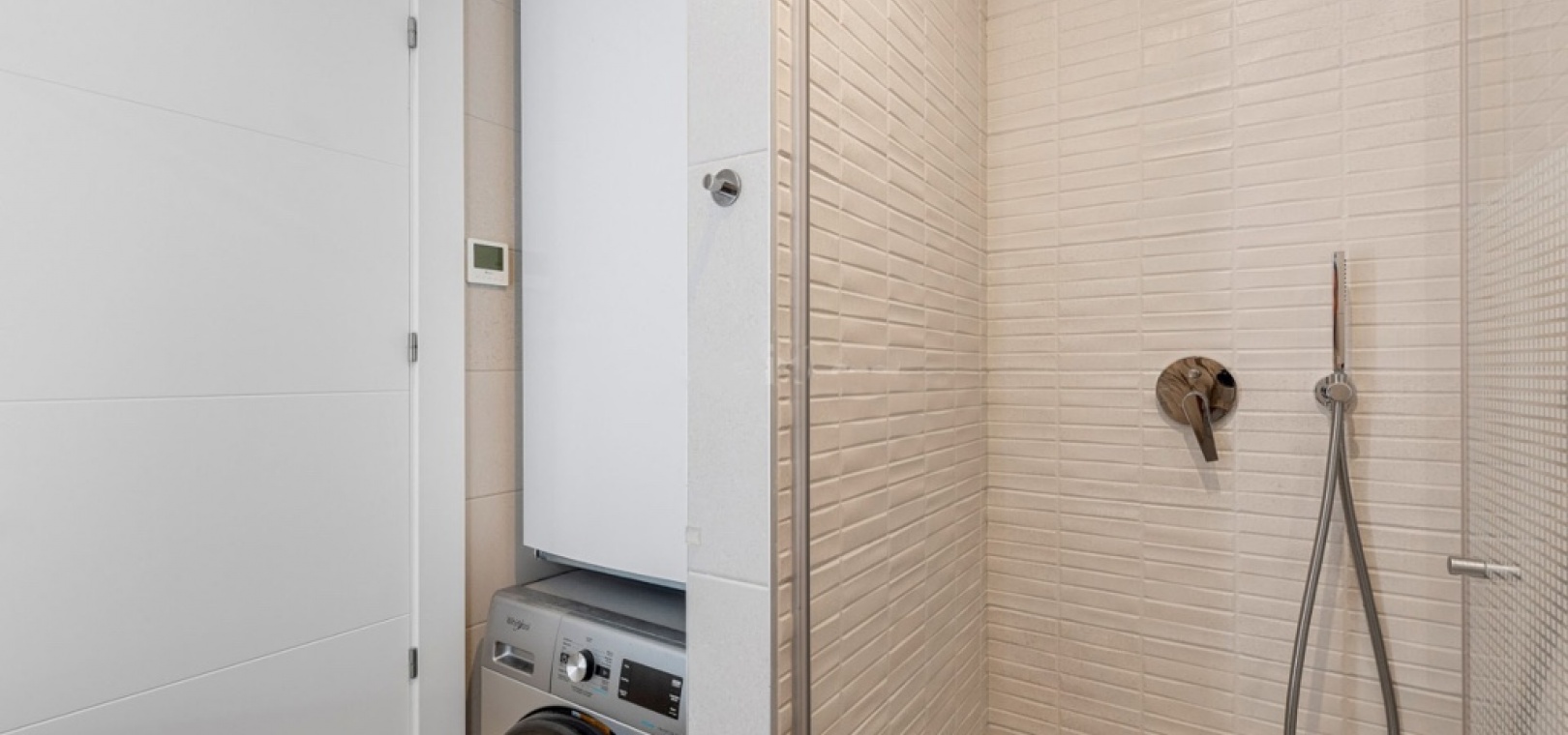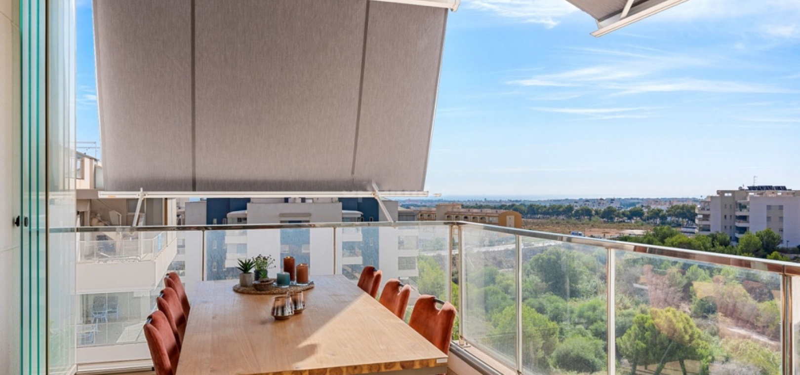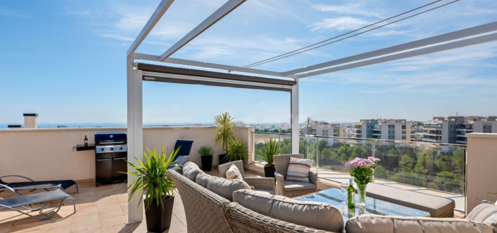 For sale penthouse in a short walking distance from the Zenia Boulevard shopping centre. The home has a good floor plan and contains three bedrooms as well as an open living room-kitchen with access to a south-facing terrace of approx. 20 sq m. 1 garage space and 1 storage room in the underground parking facility are included. There is a lift in the building.The apartment maintains a high standard and appears bright and modern with top-of-the-line material choices. This includes underfloor heating in the bathroom, air conditioning for cold and heat, a glazed terrace with sun protection and a dining table for 6-8 people as well as a furnished roof terrace of nearly 50 square metres.The common area in the complex is something completely unto itself, with a total of 3 pools, one of which is enclosed and heated. There is also a Finnish sauna and a fitness room. Villamartin is 2 km from the white beaches of La Zenia and a 20 minute walk from the Zenia Boulevard shopping centre. It is important to mention that the housing complex has a protected green area directly in front, which provides air and a green view from the common area.