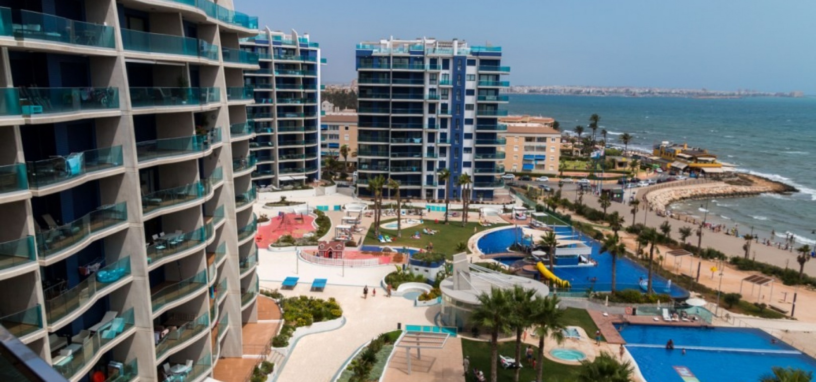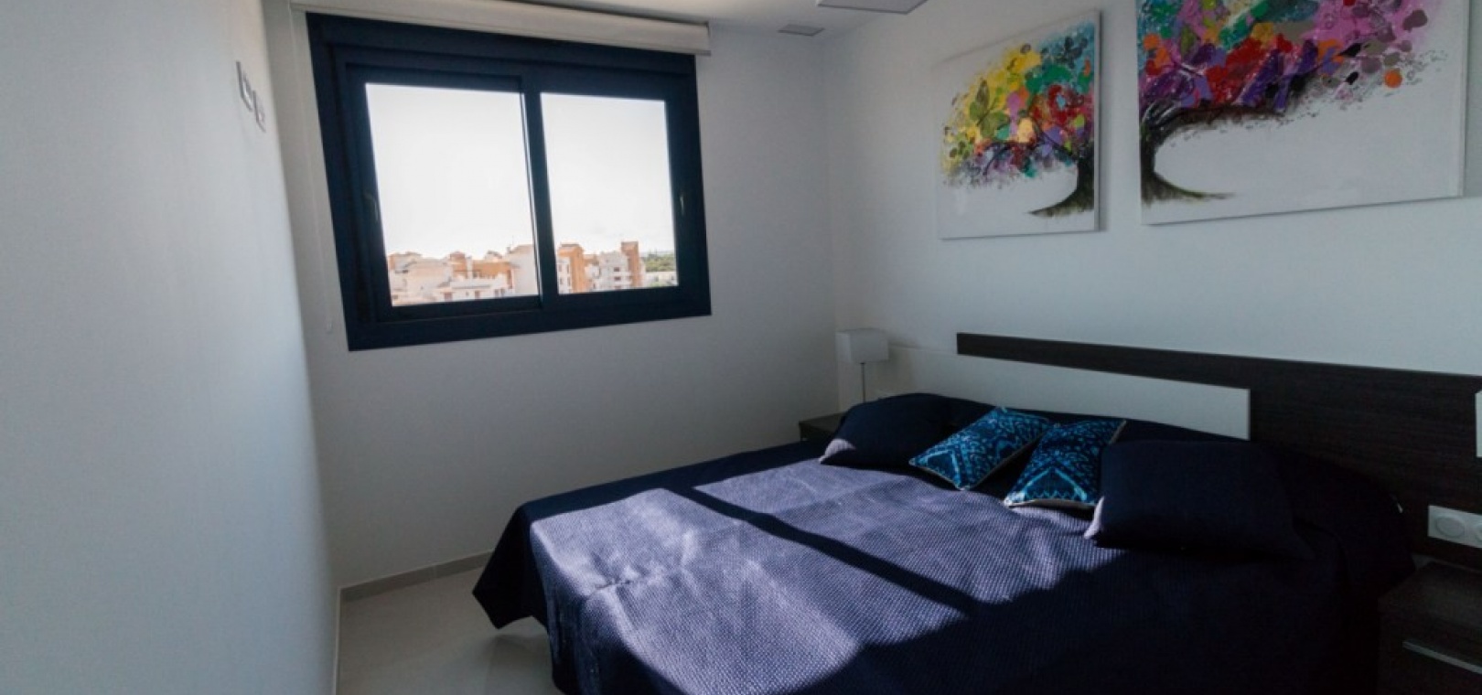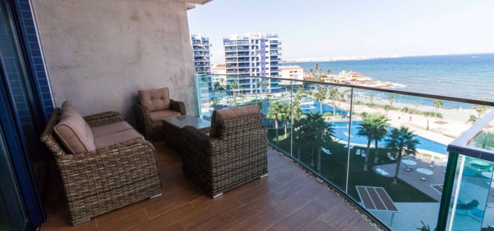 LUXURY APARTMENT FOR SALE IN A RESIDENTIAL "SEA SENSES", PUNTA PRIMA, 1ST LINE FROM THE BEACHES WITH PANORAMIC SEA VIEWSSpacious apartment for sale in a closed residential complex "Sea Senses" in Punta Prima, 50 meters next to the sea and the beaches of Orihuela Costa. This southeast side modern property on 5th floor has 2 bedrooms with fitted wardrobes, 2 bathrooms, large bright living room with open kitchen, terrace with PANORAMIC VIEWS to the sea and open views of the residential complex. Modern kitchenette is fully equipped and includes all necessary appliances. The house has installed central air conditioning: hot/cold. The price includes a parking space in the underground parking. In the luxurious territory of the complex with communal swimming pools, large green areas to relax.Orihuela Costa is a popular place on the Costa Blanca coast with full range of amenities including parks and sandy beaches, shopping mall, shops, bars, restaurants, cafés and much more. Punta Prima is an ideal place for both vacation and permanent living. Here you can enjoy sunshine throughout the year. Orihuela Costa has a unique health environment due to large salt lakes, and is considered to be one of the healthiest places in the world according to medical science (WHO).Entertainment not only includes shopping in large shopping centers like La Zenia Boulevard, there are number of golf courses nearby, a yacht clubs, tennis courts, aqua parks, sailing schools, windsurfing, fly-boarding, banana boats, jet skis and more.Orihuela Costa is located approximately 45 kilometres from the international airport in Alicante and one can easily reach major cities in the area through modern highways, such as Elche, Alicante, Valencia, Murcia and Cartagena to name a few.