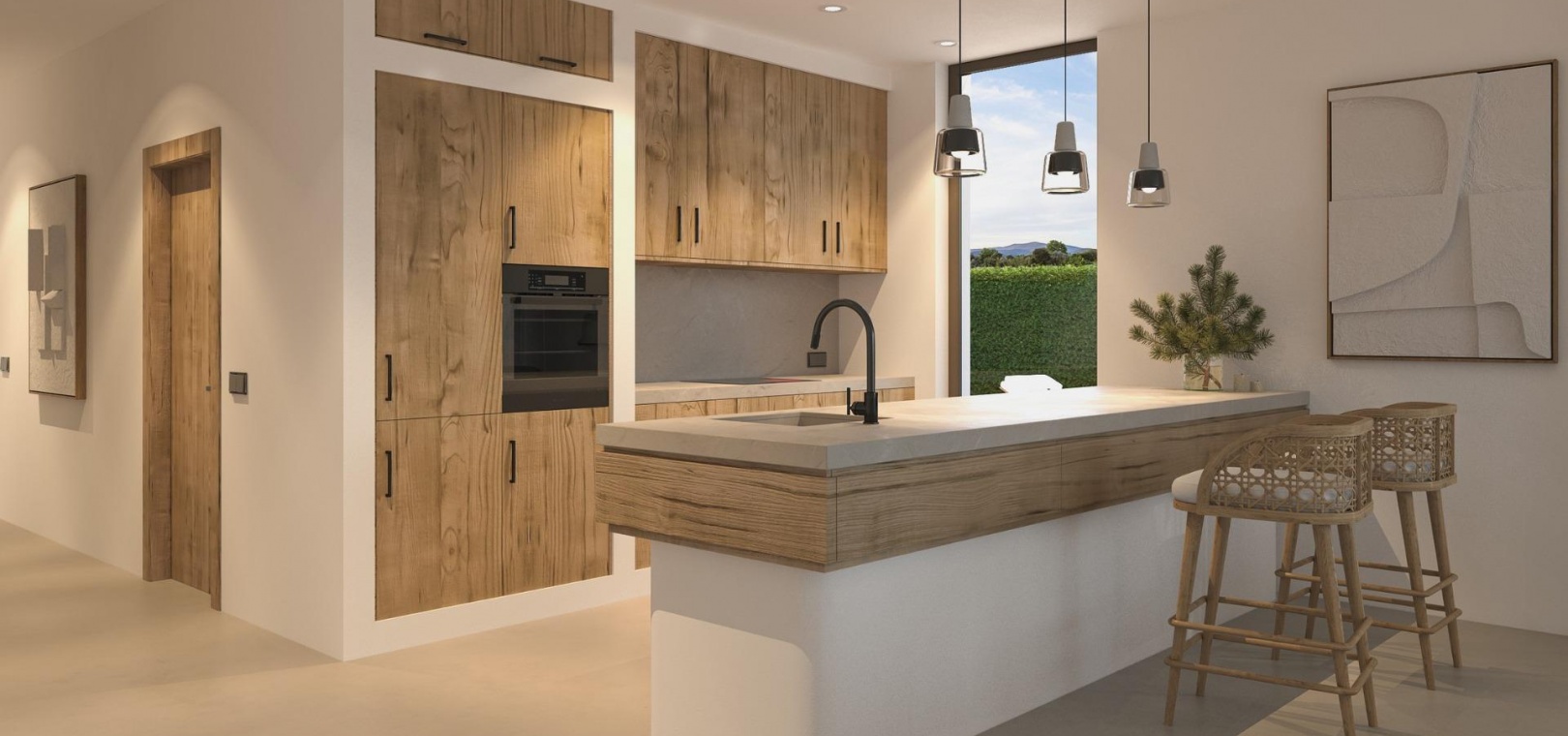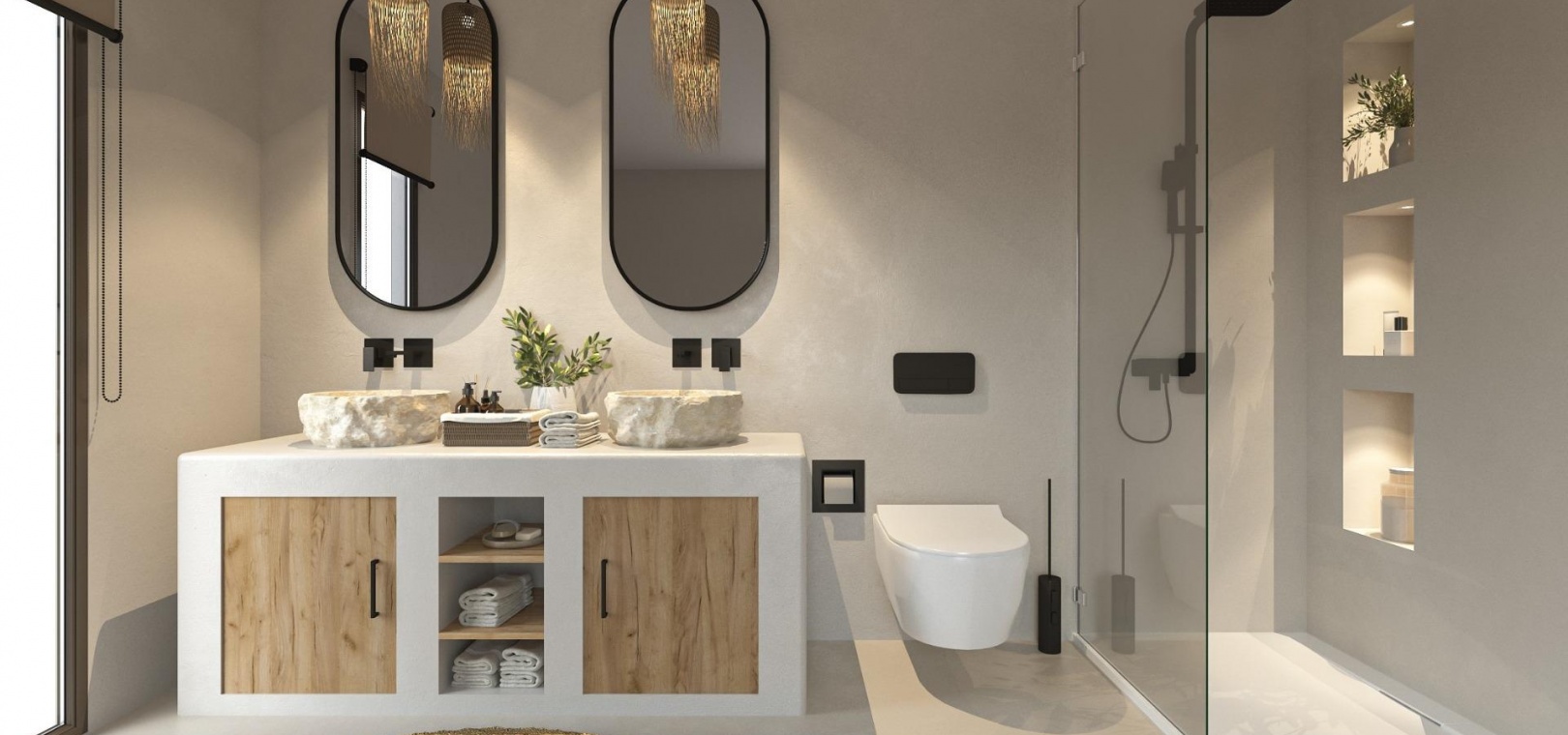 The villa stands out with its white façade, rounded corners and hand carved Montgó stone accents that add warmth and authenticity. High quality finishes such as microcement flooring, double glazed aluminium windows in rust colours and black taps in the bathrooms contribute to a refined and contemporary atmosphere. All bedrooms are equipped with electric exterior blinds to ensure comfort and privacy.