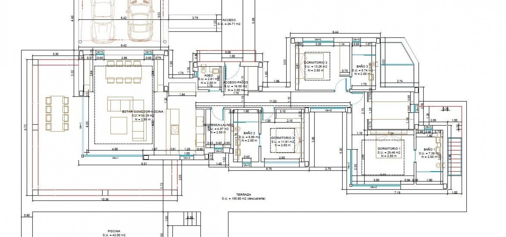 Inside, the villa offers a bright and spacious living dining area with direct access to the outdoor terraces and south facing swimming pool, allowing you to enjoy sunlight throughout the day. The modern open plan kitchen comes fully equipped and is complemented by an adjoining laundry room and a guest toilet.