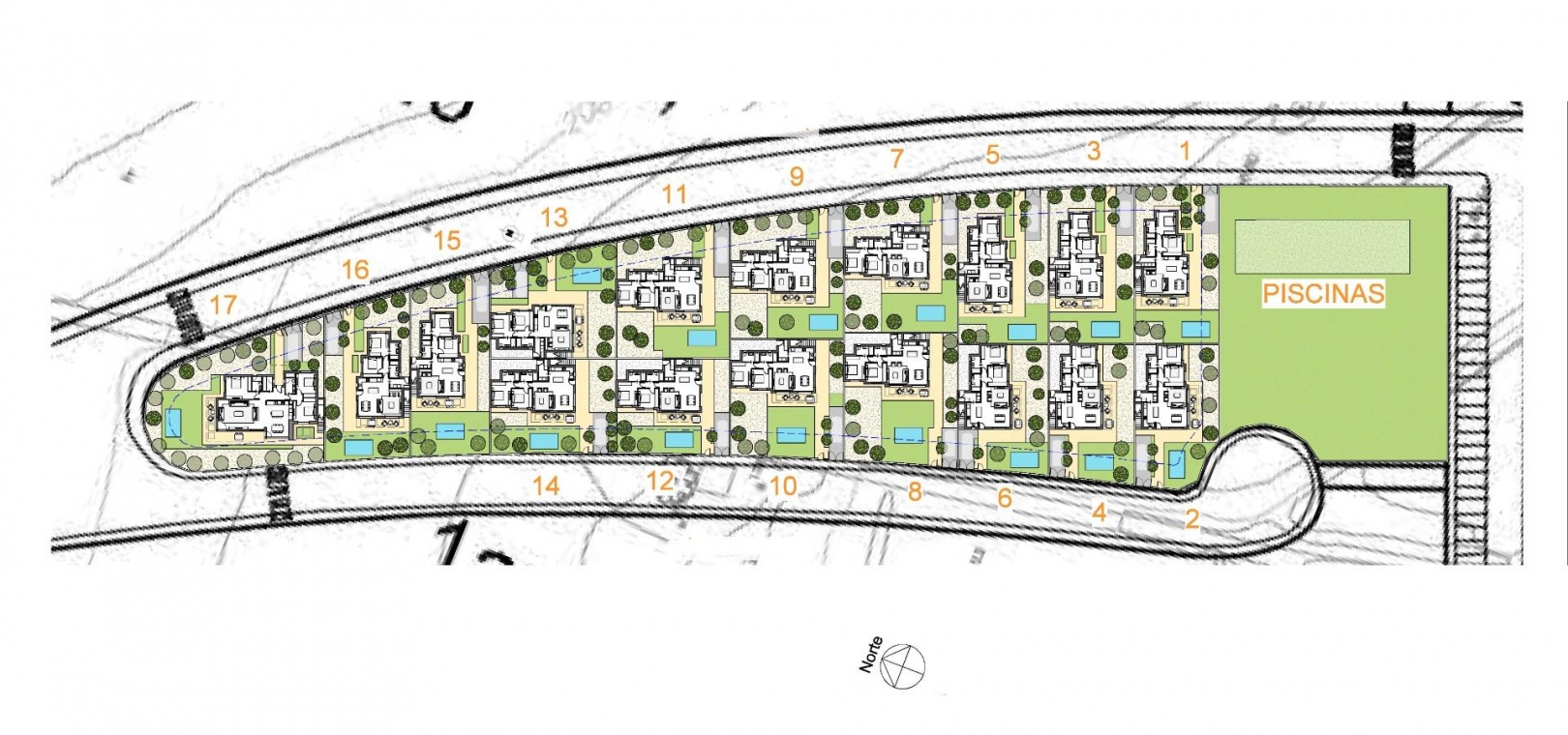 The residential complex consists of 17 villas on plots starting at 300 m2. You can choose between homes with 2 or 3 bedrooms and 2 full bathrooms on one floor, as well as a terrace area with a 6x2.4 private pool and a private solarium on the roof.