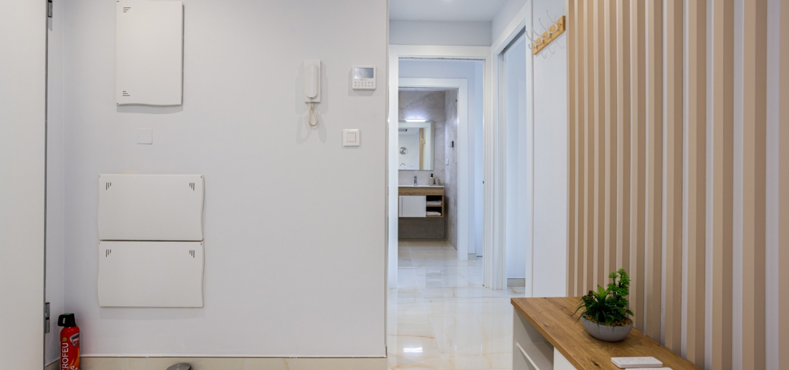 The apartment features two spacious bedrooms, both with fitted wardrobes that maximize space and add elegance to the overall design. The two modern and stylish bathrooms feature high-quality finishes, creating a relaxing and sophisticated atmosphere.