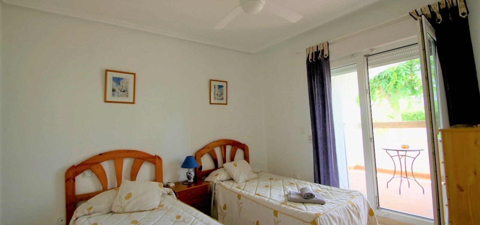 The property includes two double bedrooms and two bathrooms, with the master bedroom benefiting from an ensuite. It is sold furnished (subject to inventory) and comes equipped with white goods, air conditioning, and ceiling fans.