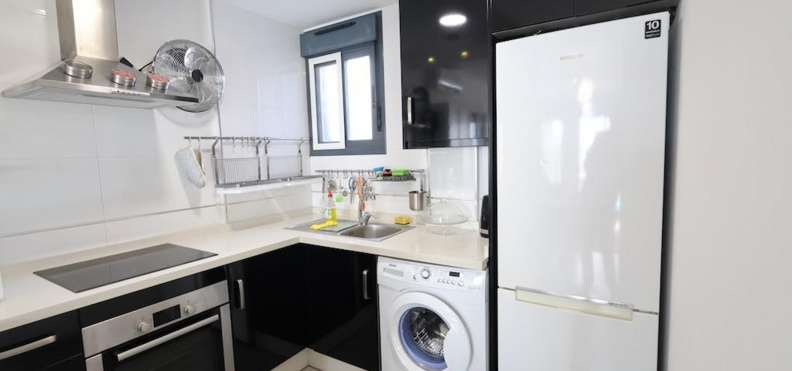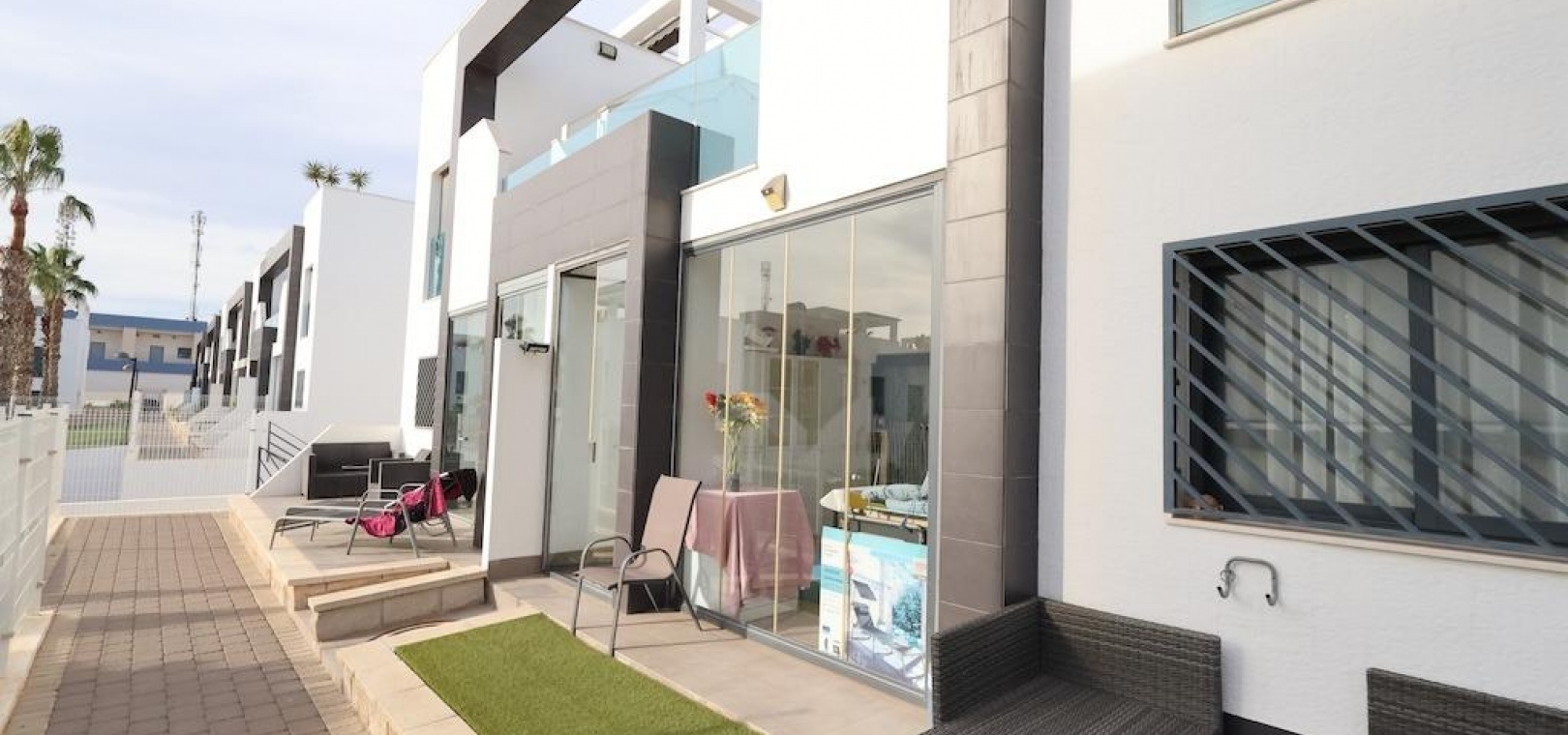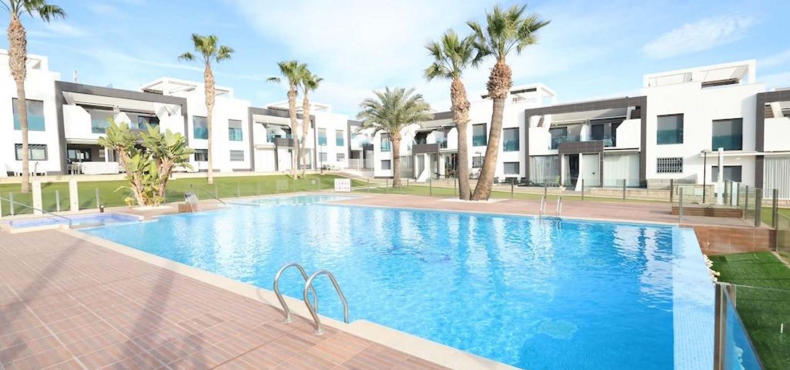 La Zenia, Oasis Beach II Residential. Ground-floor bungalow with South-East orientation, featuring 70 m² of living space and a 13.50 m² glazed terrace. The property offers 2 bedrooms, one of them en-suite, 2 bathrooms, and an open-plan kitchen connected to the living room. It is sold fully furnished and equipped with ducted air conditioning.~~The property also includes its own underground parking space. The residential complex boasts extensive landscaped areas, a beautiful swimming pool, a children’s play area, and more.~