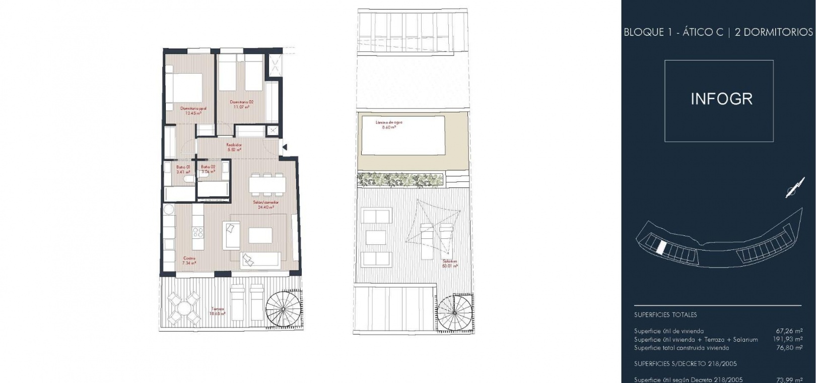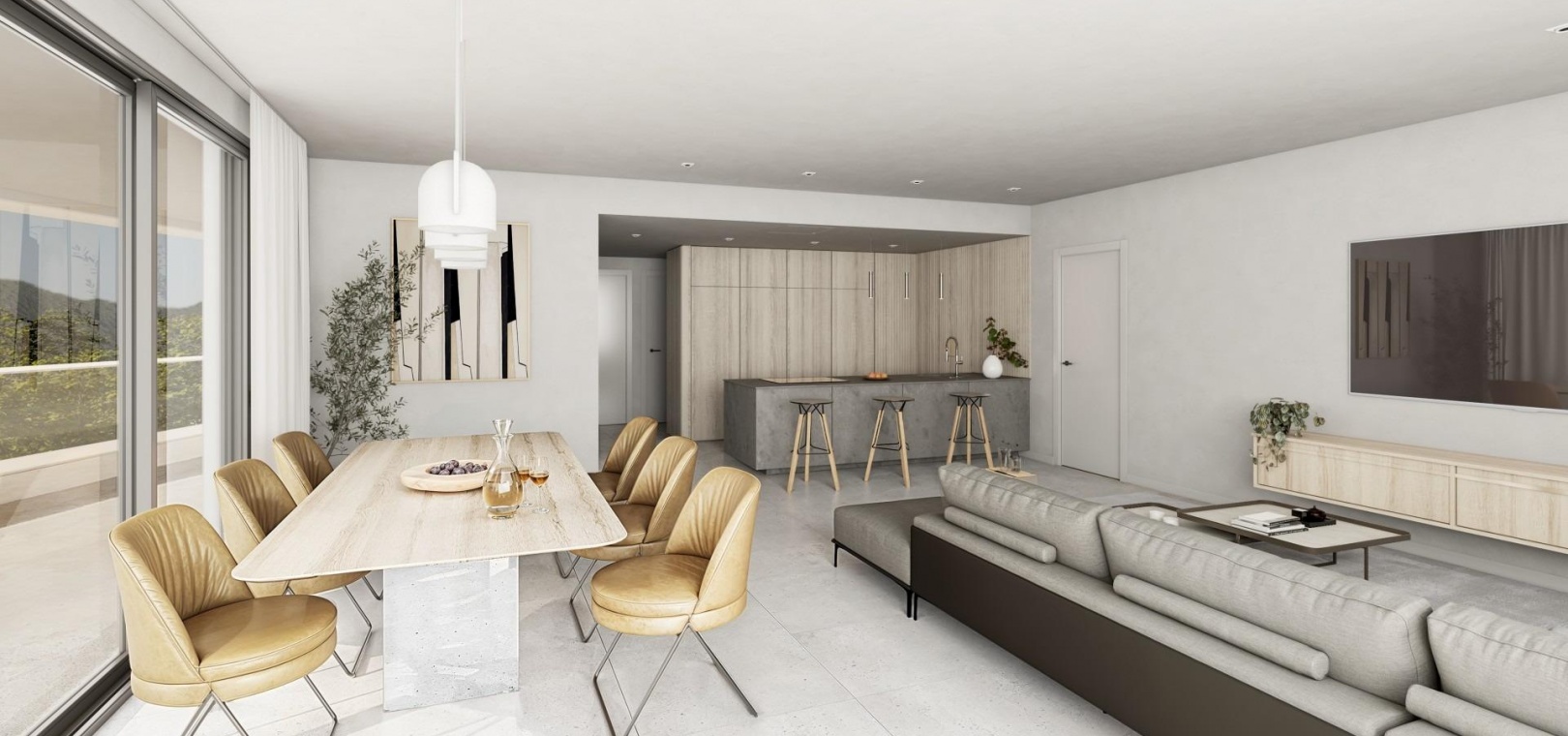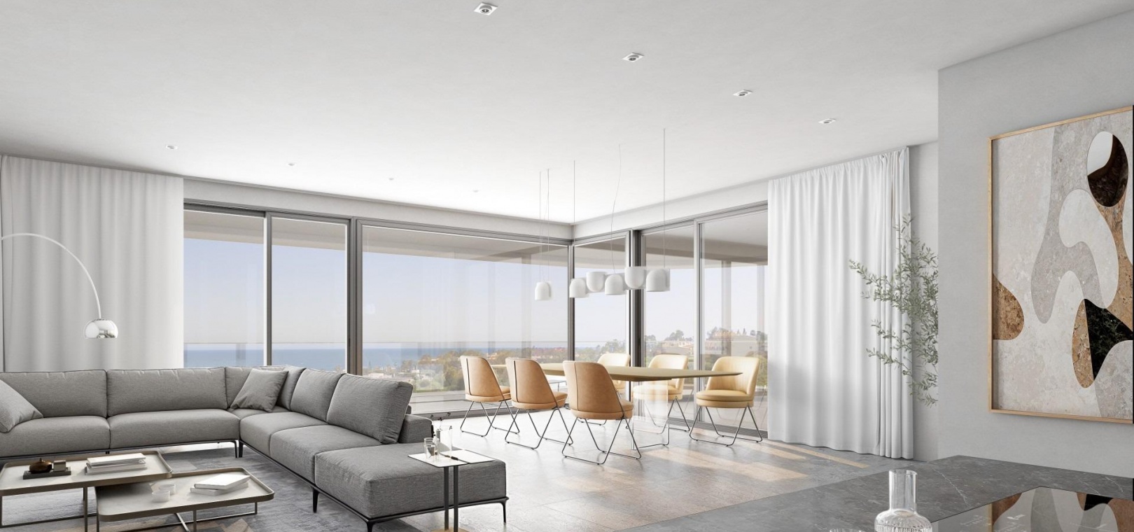 The development is composed of two elegant crescent shaped buildings, each with 32 homes distributed over four levels: ground floor, first floor, second floor and penthouses. The project offers a selection of 2 and 3 bedroom homes to suit different lifestyles. Sea views from selected units. Ground floor properties feature private gardens and private swimming pools, middle floor homes offer large panoramic terraces, and penthouses include private solariums with sea views and private pools. All homes include at least one parking space with pre installation for electric vehicles and a private storage room.