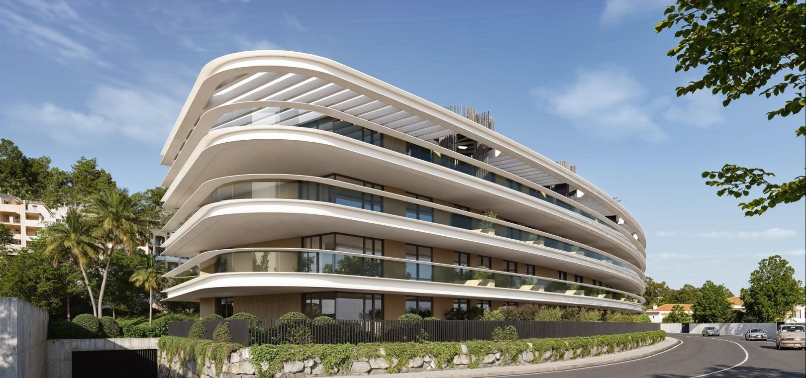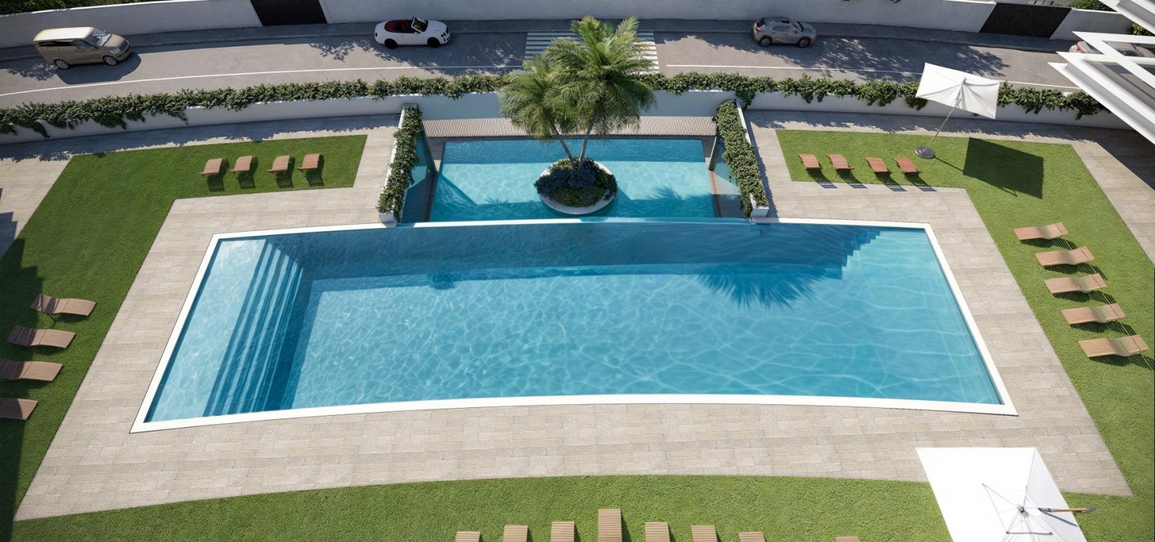 The development is composed of two elegant crescent shaped buildings, each with 32 homes distributed over four levels: ground floor, first floor, second floor and penthouses. The project offers a selection of 2 and 3 bedroom homes to suit different lifestyles. Sea views from selected units. Ground floor properties feature private gardens and private swimming pools, middle floor homes offer large panoramic terraces, and penthouses include private solariums with sea views and private pools. All homes include at least one parking space with pre installation for electric vehicles and a private storage room.
