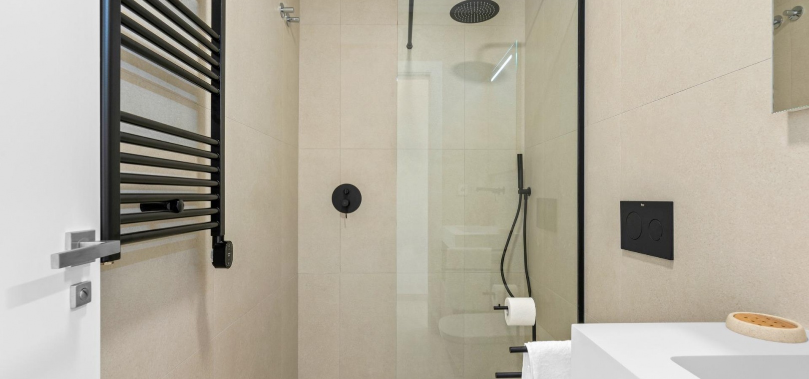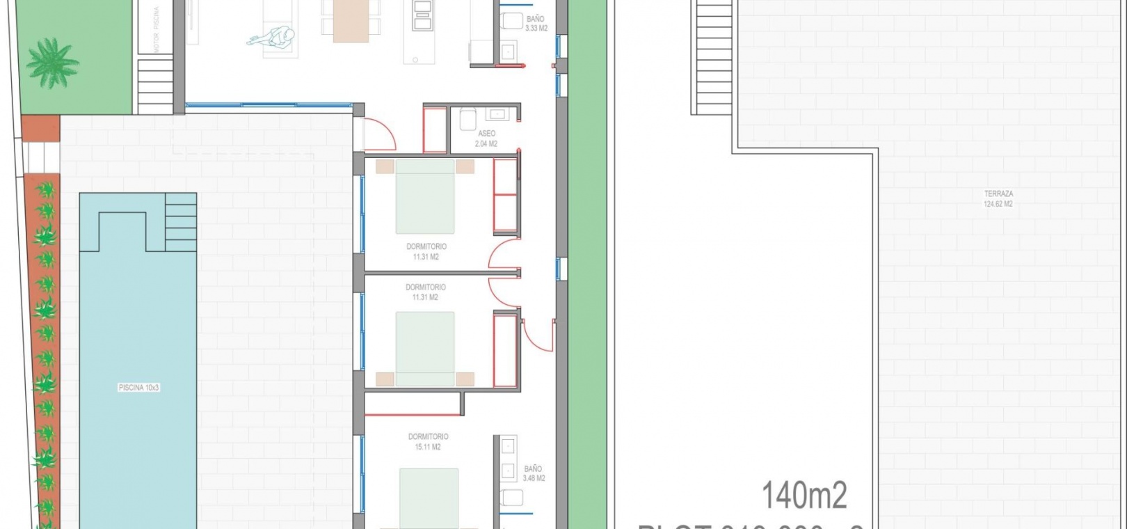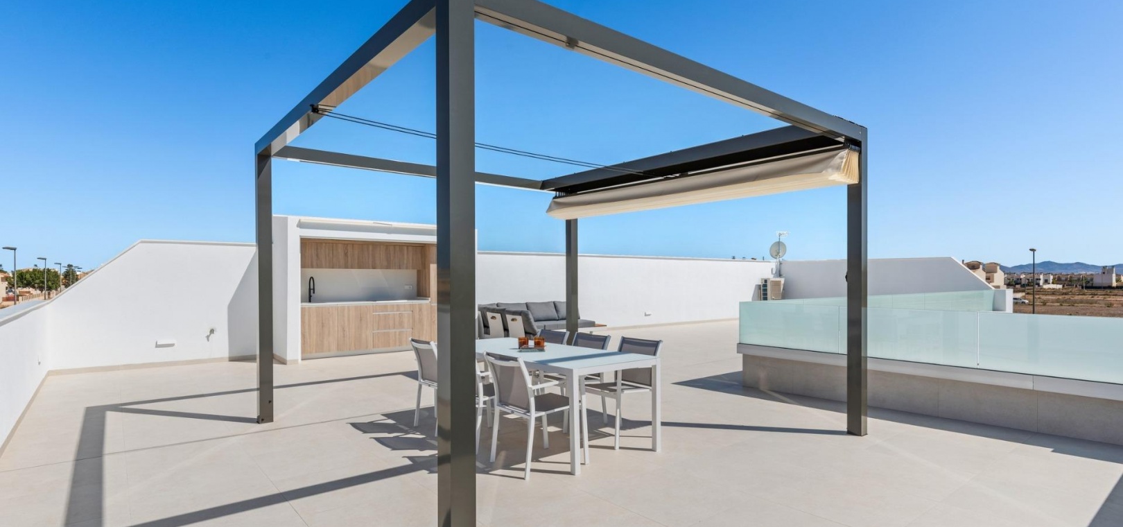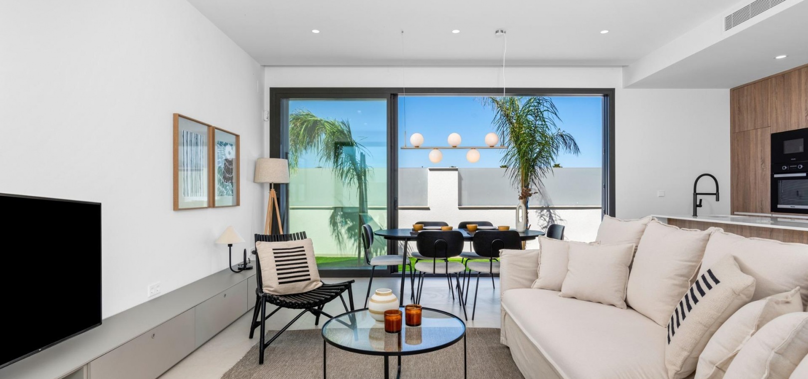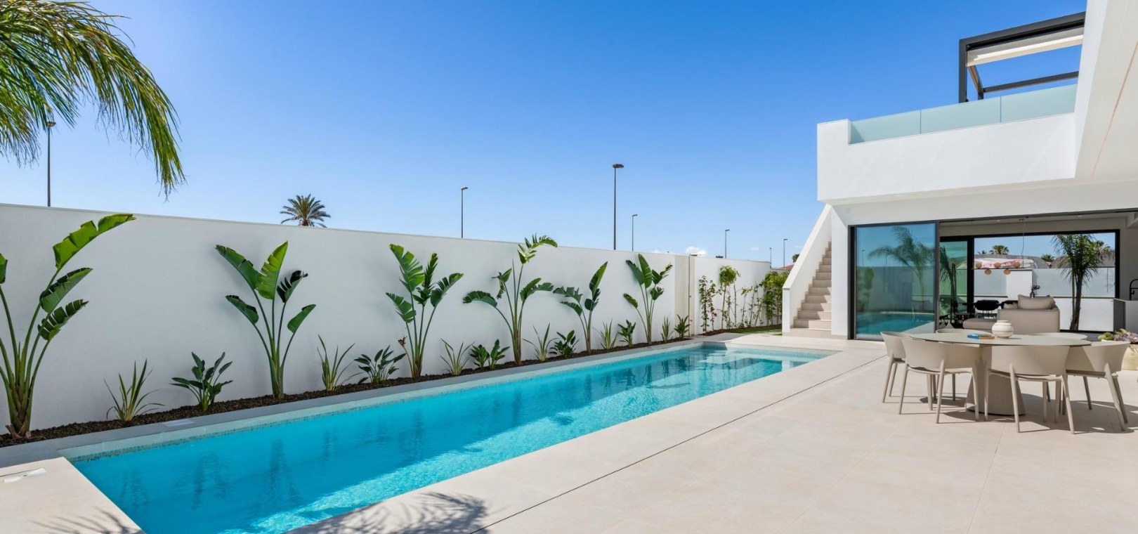 Villas built on one floor and consisting of 3 bedrooms, 2 bathrooms and 1 toilet, open-plan kitchen, living room with open views to the terrace, private garden with swimming pool and solarium.