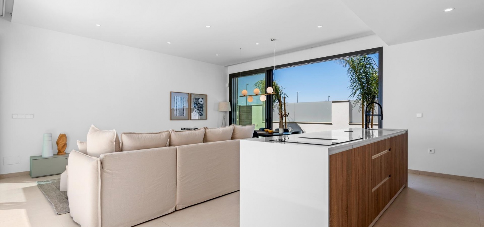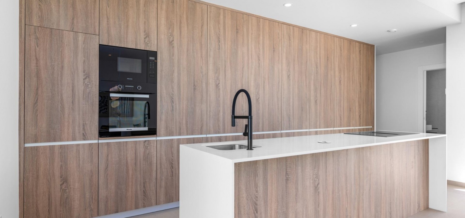 Fully fitted kitchen in gloss white or wood including induction hob with integrated extractor, oven, microwave, washing machine, integrated fridge and integrated dishwasher.