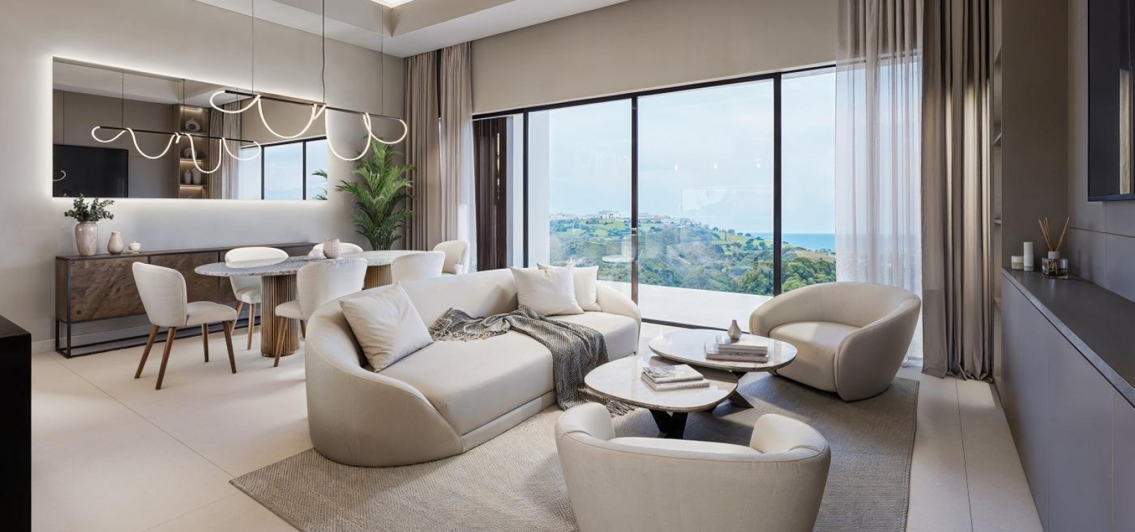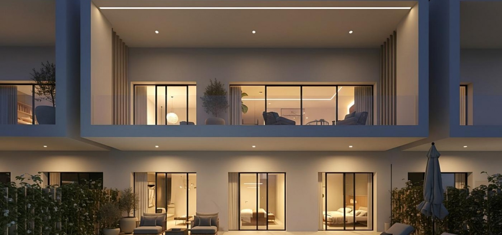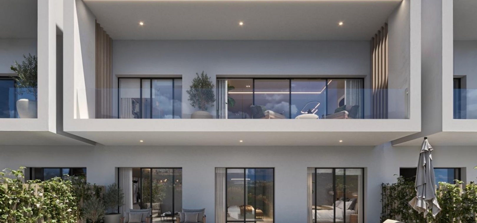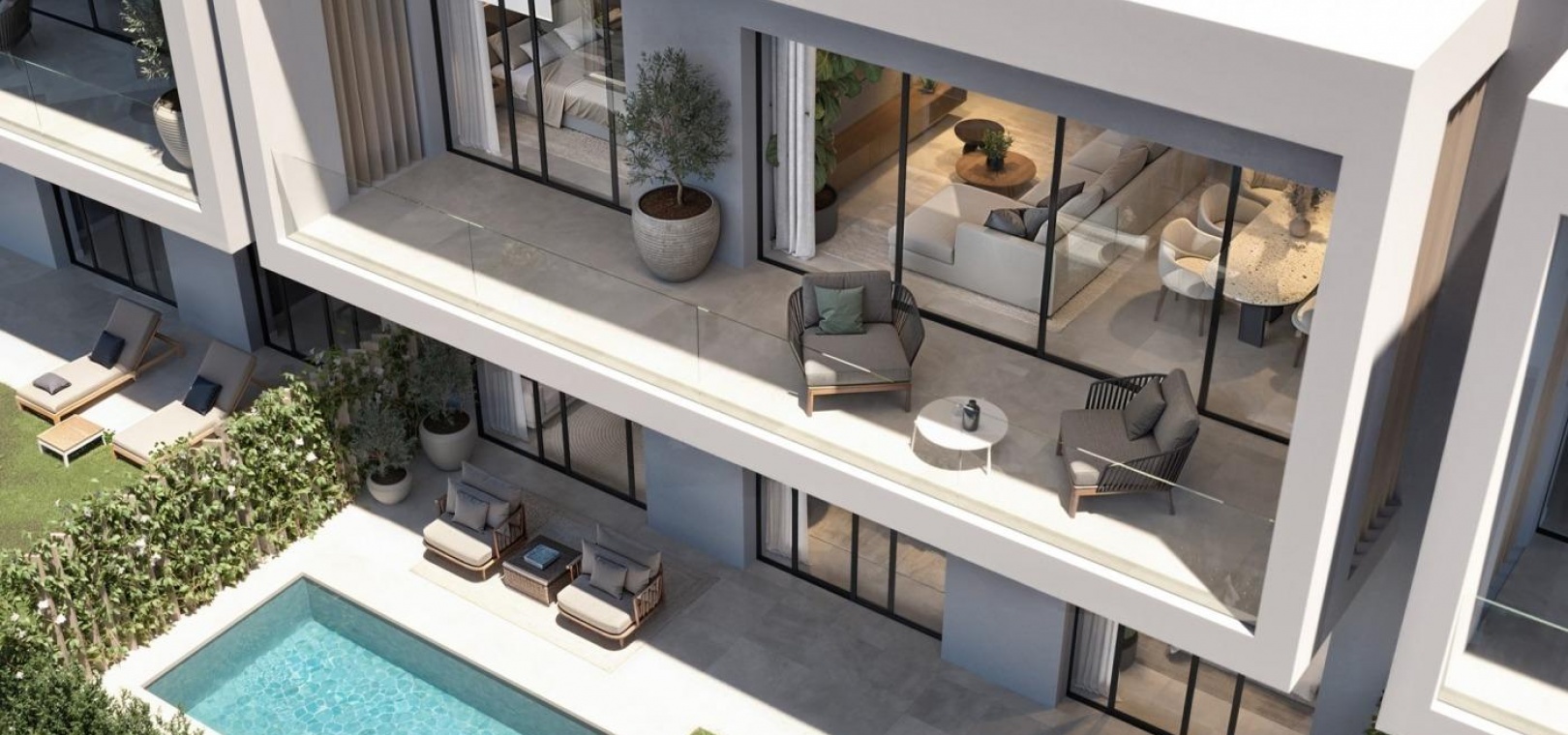 The residential complex is defined by its avant garde architecture and modern lines, with floor to ceiling windows that flood the interiors with natural light and seamlessly connect indoor and outdoor spaces. The open plan kitchen with a central island is fully equipped and becomes the heart of the home, combining functionality with sophisticated design. Spacious living areas open onto terraces and gardens, creating a harmonious atmosphere ideal for entertaining and relaxation.