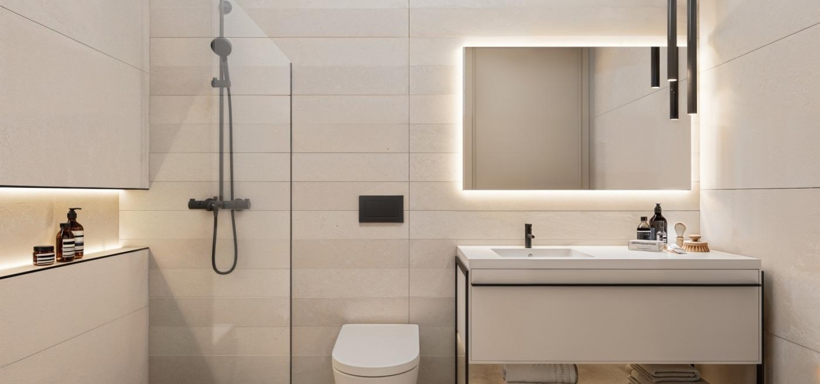 Bedrooms have been designed as peaceful sanctuaries, with soft tones, generous space and abundant natural light. En suite bathrooms feature contemporary fittings, full height porcelain tiling, minimalist shower areas with glass screens, integrated countertop basins, vanity units and backlit mirrors.