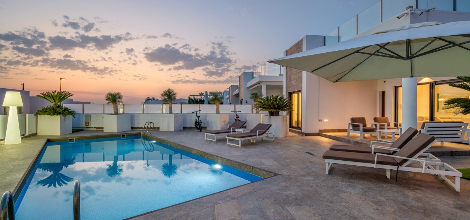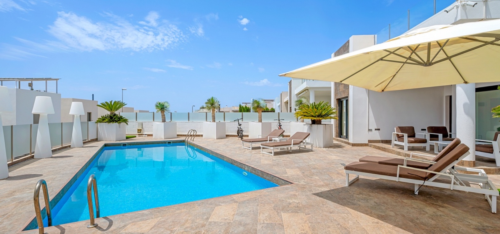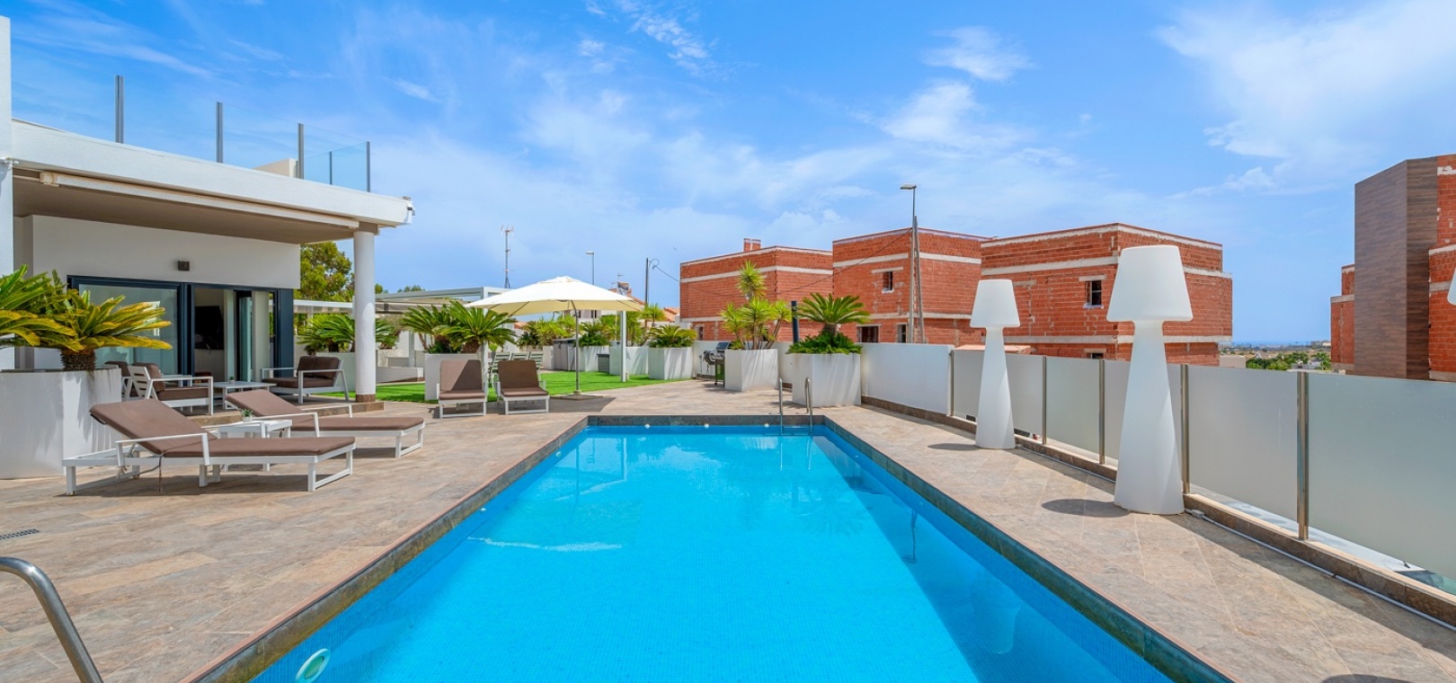 Private swimming pool with sunbathing areas.