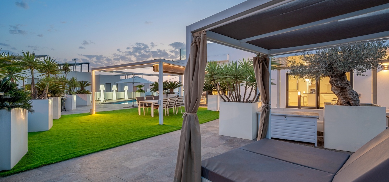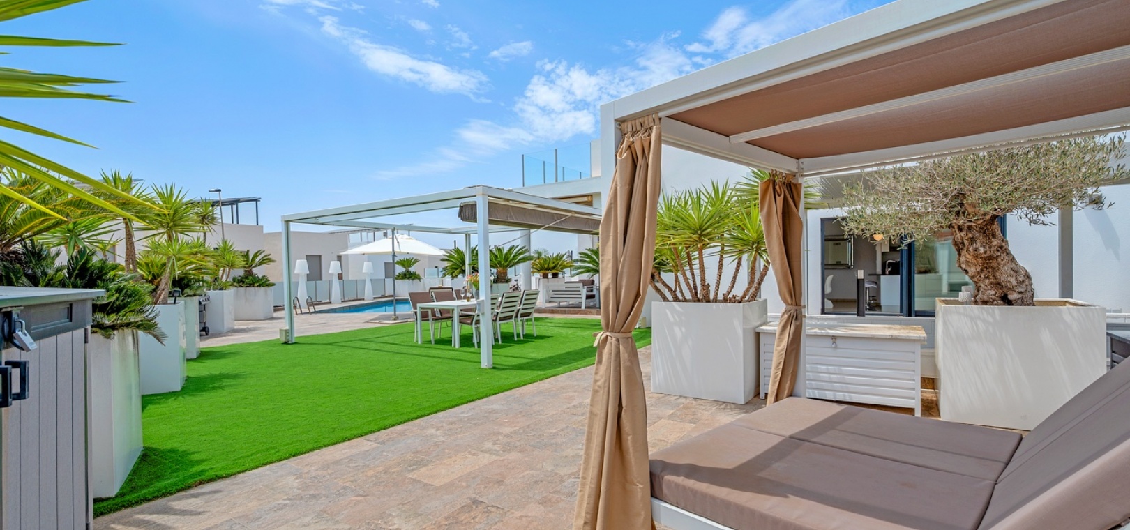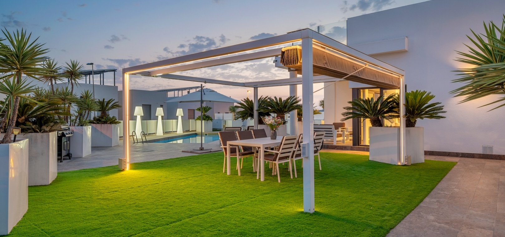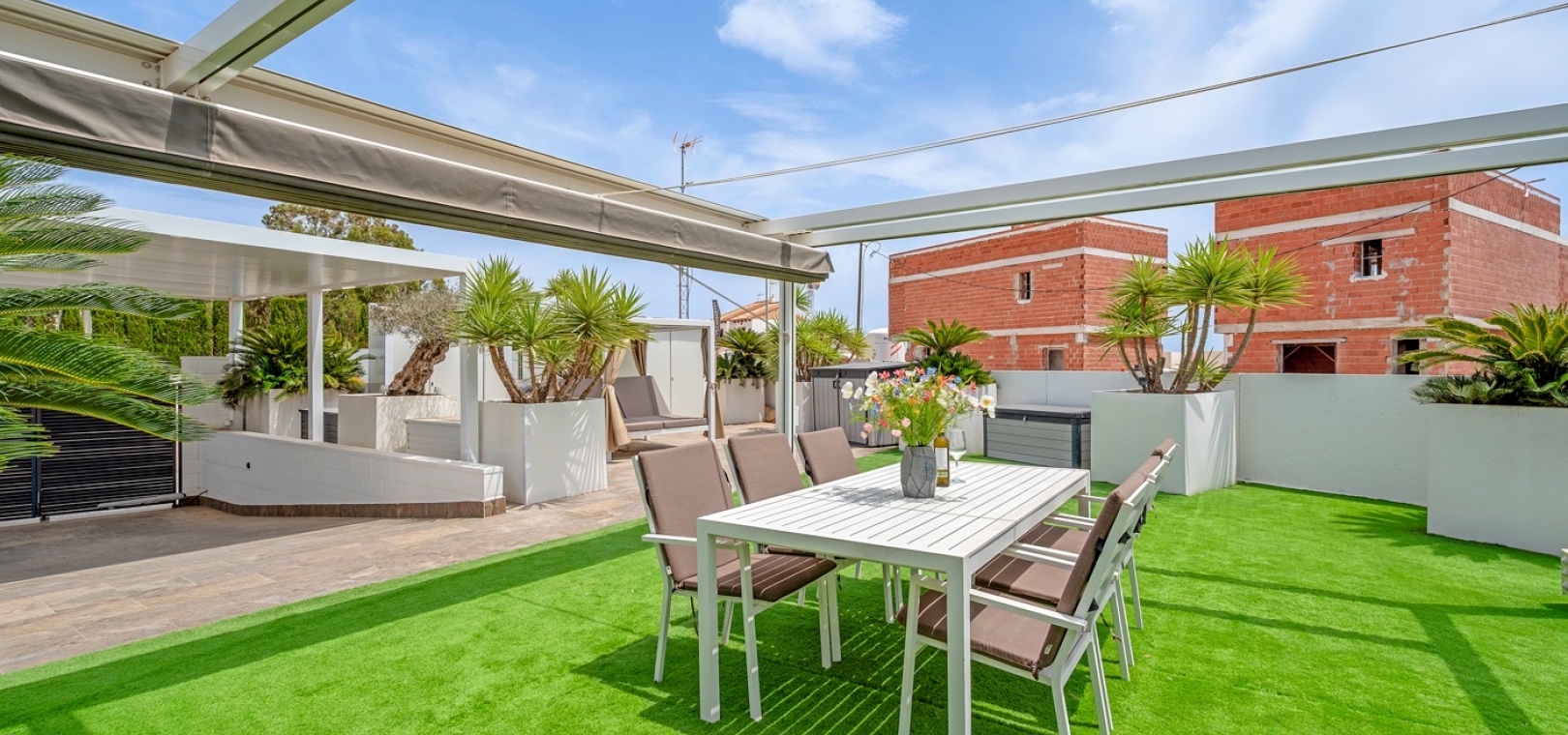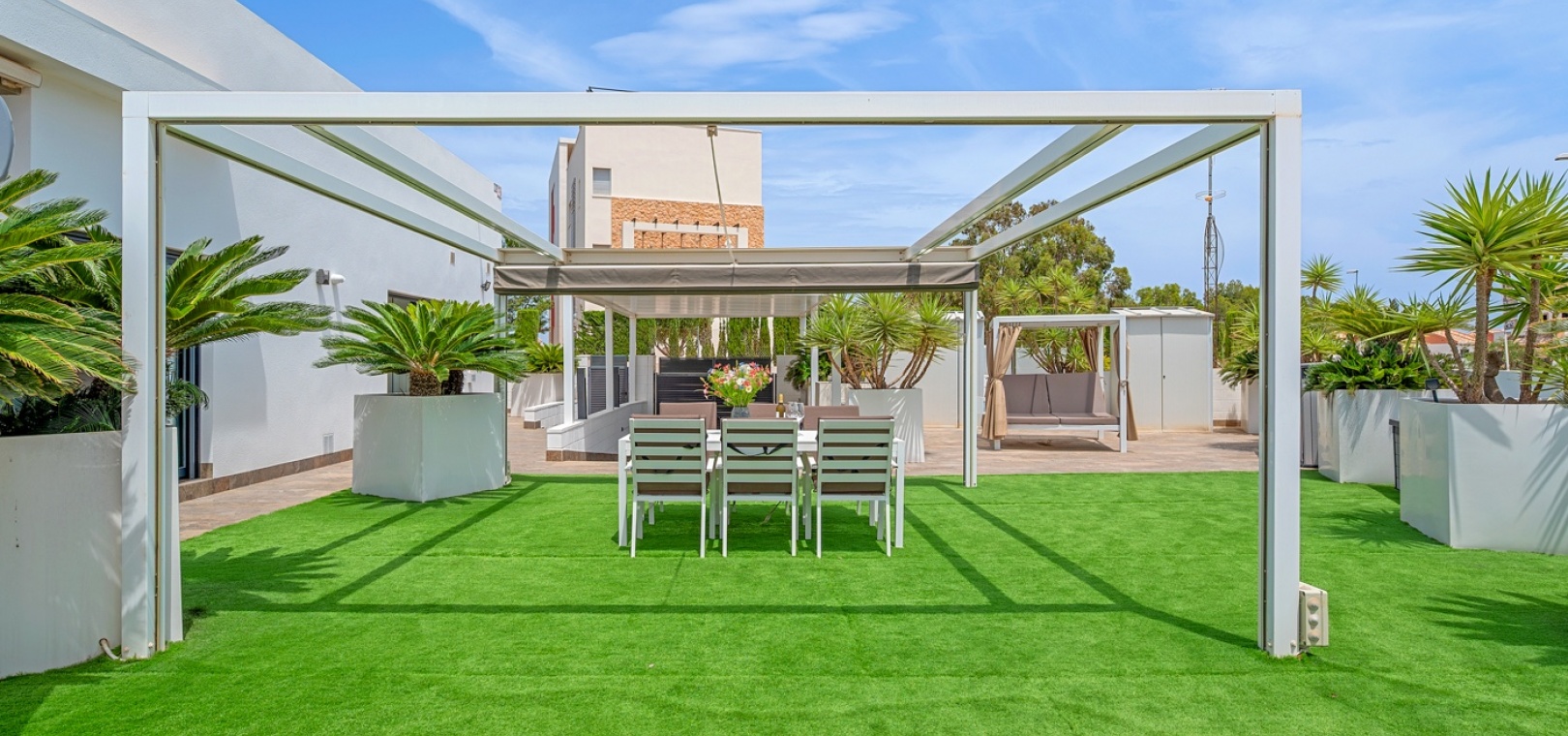 Pergola-shaded dining area with artificial grass.