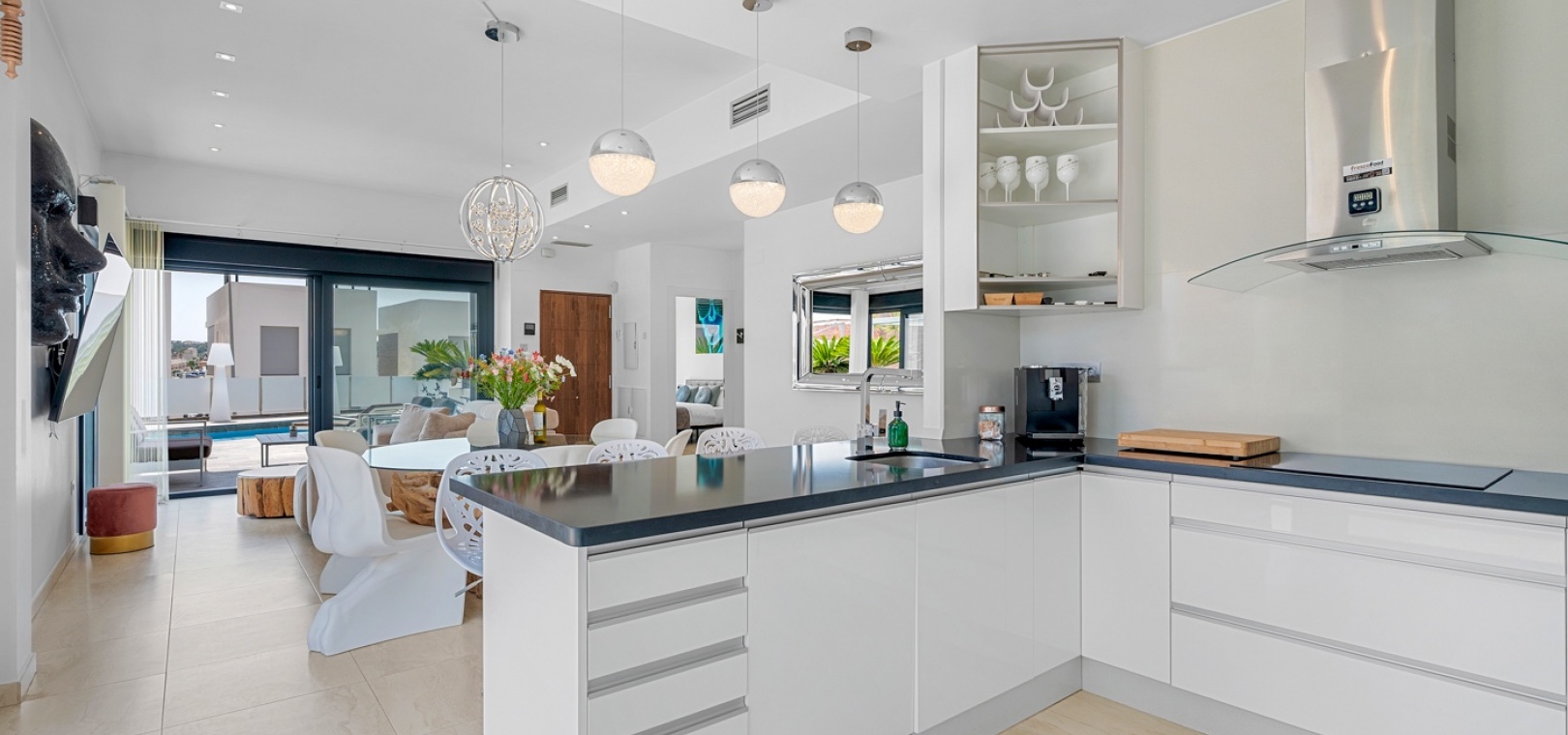 Open-plan kitchen with dining and living areas leading to the terrace and pool.